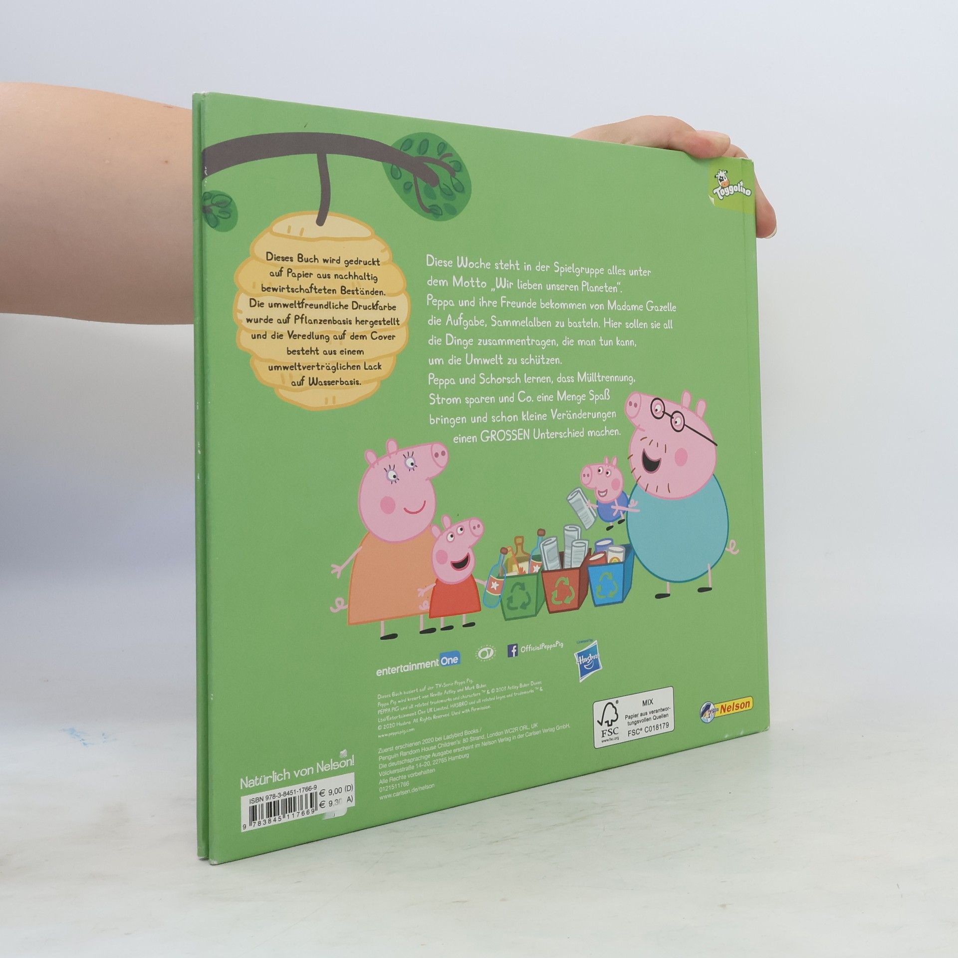 Peppa und ihre Freunde zeigen wie es geht – Umweltschutz leicht gemacht! Diese Woche steht in der Spielgruppe alles unter dem Motto ” Wir lieben unseren Planeten.“ Peppa und ihre Freunde bekommen von Madame Gazelle die Aufgabe, Sammelalben zu basteln. Hier sollen sie all die Dinge zusammentragen, die man tun kann, um die Umwelt zu schützen. Peppa und Schorsch lernen, dass Mülltrennung, Strom sparen und Co. eine Menge Spaß bringt und schon kleine Veränderungen einen GROSSEN Unterschied machen. Dieses Buch wird gedruckt auf Papier aus nachhaltig bewirtschafteten Beständen. Die umweltfreundliche Druckfarbe wurde auf Pflanzenbasis hergestellt und die Veredlung auf dem Cover besteht aus einem umweltverträglichen Lack auf Wasserbasis.