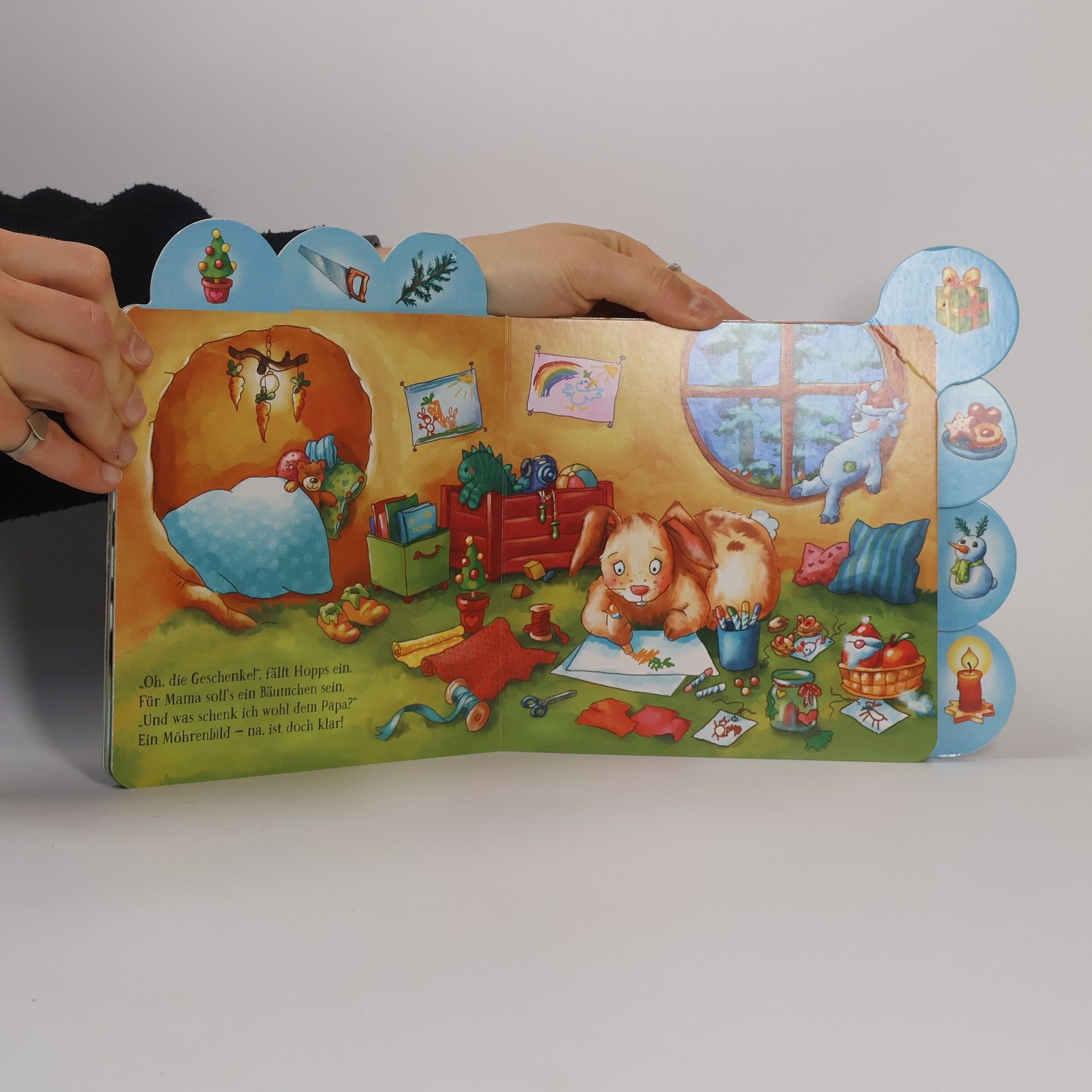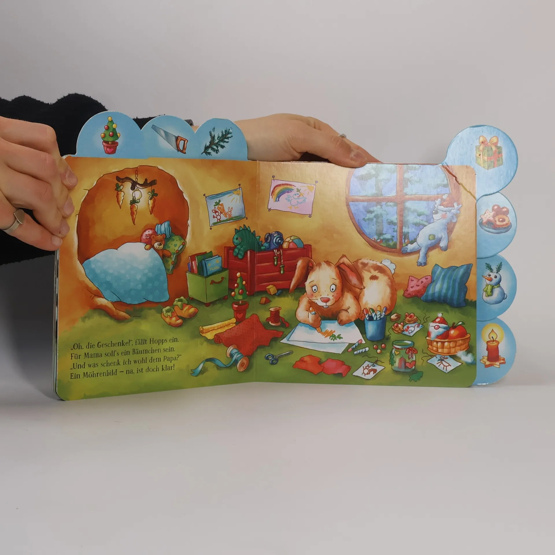 Oh wie schön, es weihnachtet sehr! Hase Hopps freut sich schon. Doch zuerst gibt es noch einiges zu tun: Mit Mama sucht er im Wald gemeinsam eine hübsche Tanne aus und bringt sie auf dem Schlitten nach Haus. Gemeinsam wird der Baum geschmückt. Ein schönes Geschenk für Papa und eins für Mama denkt sich Hopps auch noch aus. Und natürlich hilft er fleißig mit beim Plätzchenbacken. Wie herrlich das duftet! Und endlich ist Bescherung, Hopps kuschelt sich mit Mama und Papa zusammen und denkt: Liebhaben ist das beste Geschenk. Eine erste Weihnachtsgeschichte mit liebenswerten Tierfigren, gereimten kurzen Texten und stabilem Rundumregister für kleine Hände.