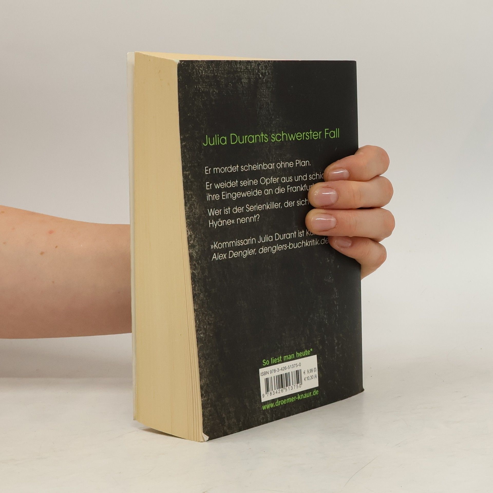 Seit ihrem ersten Fall zählt die Frankfurter Kommissarin Julia Durant zu den beliebtesten Ermittlerinnen in Deutschland. Ihre Leser lieben ihre manchmal spröde, kompromisslose, immer aber von großer Empathie geprägte Art. In ihrem 15. Fall bekommt es Julia mit einem Mörder zu tun, der sich selbst »Die Hyäne« nennt: Er mordet scheinbar ohne Plan und schickt die Eingeweide seiner Opfer an die Polizei.