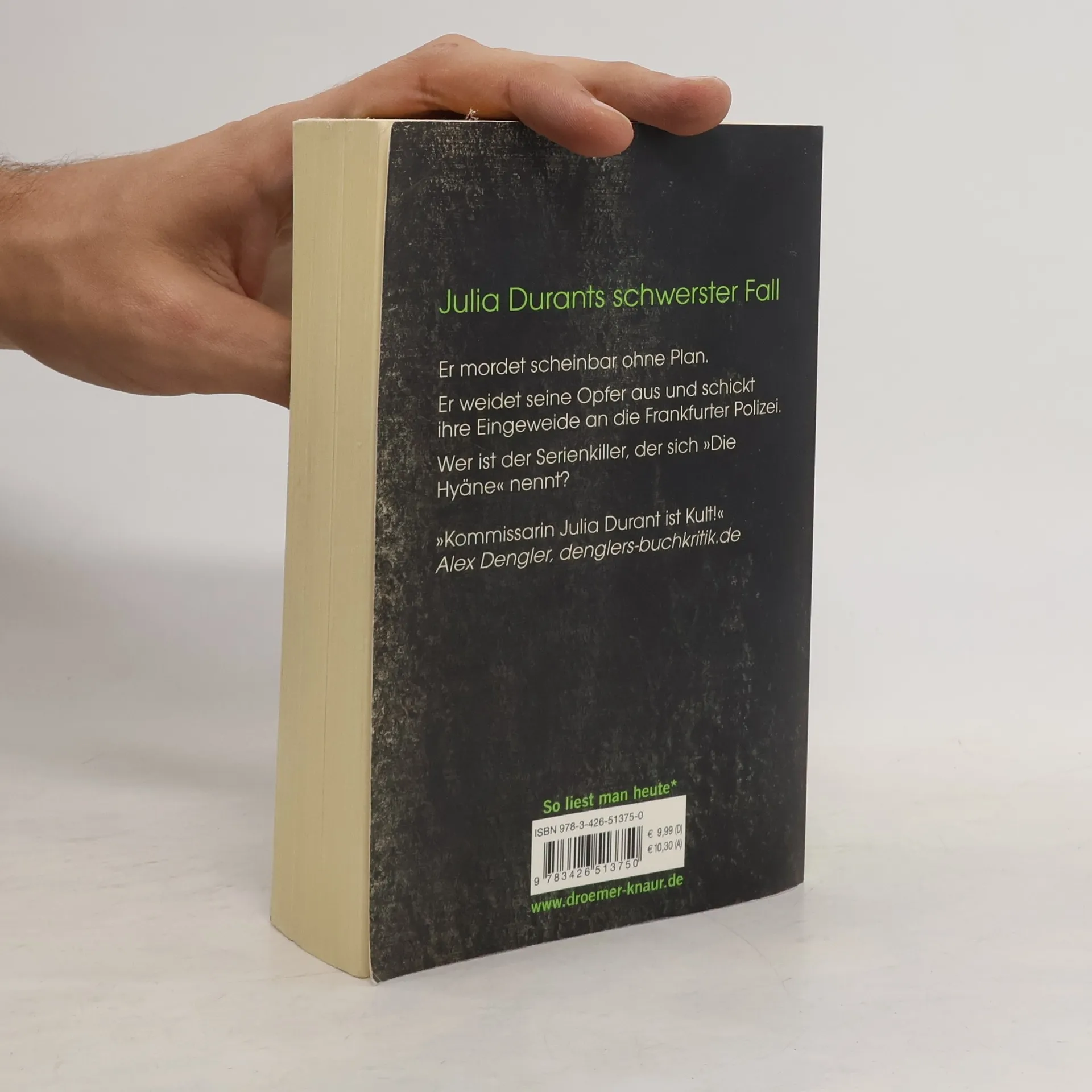 Seit ihrem ersten Fall zählt die Frankfurter Kommissarin Julia Durant zu den beliebtesten Ermittlerinnen in Deutschland. Ihre Leser lieben ihre manchmal spröde, kompromisslose, immer aber von großer Empathie geprägte Art. In ihrem 15. Fall bekommt es Julia mit einem Mörder zu tun, der sich selbst »Die Hyäne« nennt: Er mordet scheinbar ohne Plan und schickt die Eingeweide seiner Opfer an die Polizei.