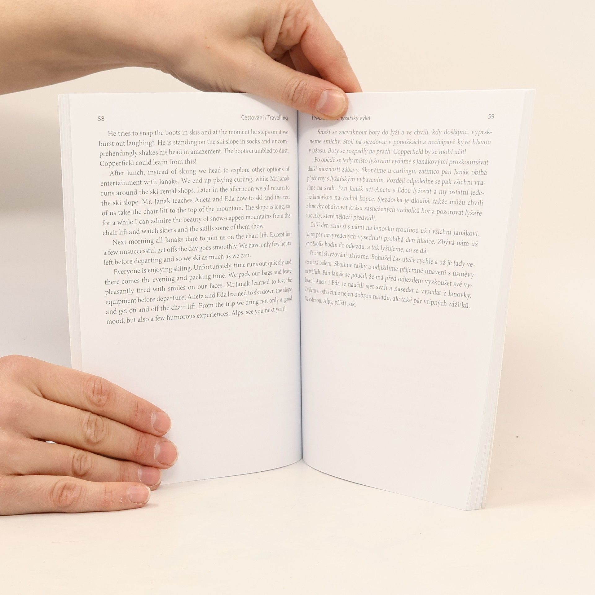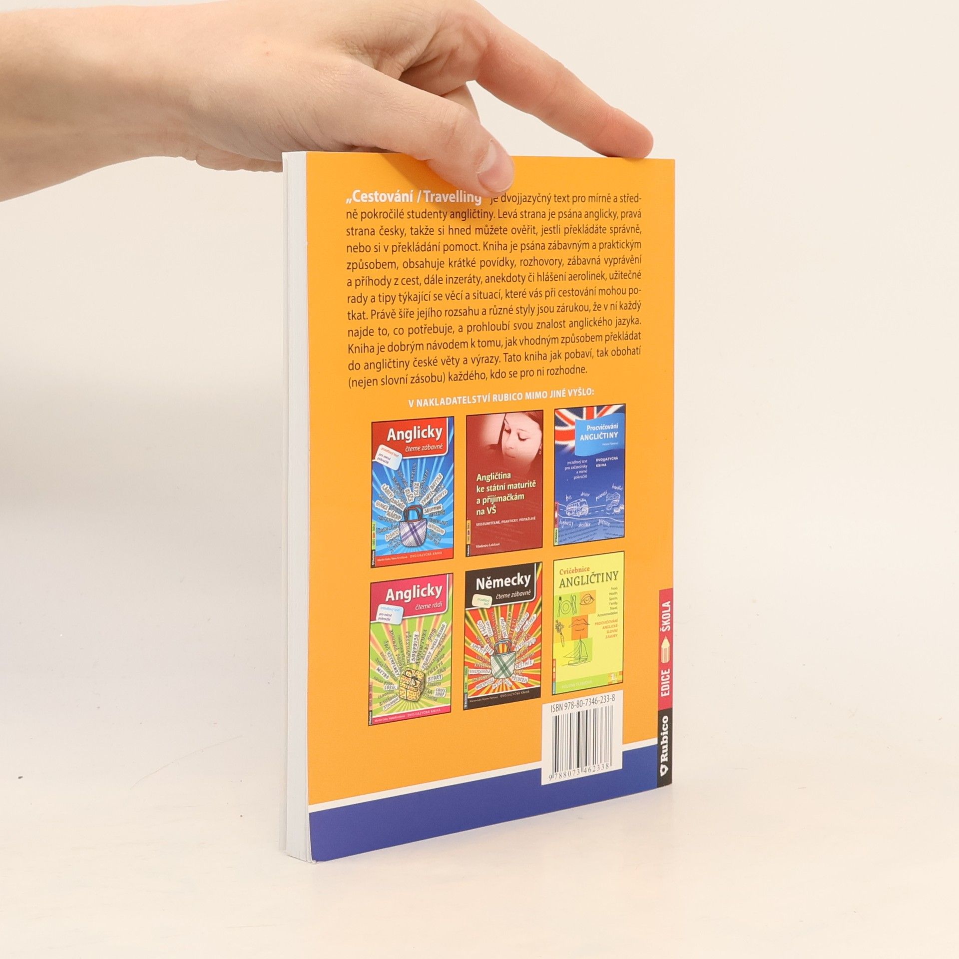 Cestování/Travelling je dvojjazyčný text pro mírně a středně pokročilé studenty angličtiny. Levá strana je psána anglicky, pravá strana česky, takže si hned můžete ověřit, jestli překládáte správně, nebo si v překládání pomoct. Kniha je psána zábavným a praktickým způsobem, obsahuje krátké povídky, rozhovory, zábavná vyprávění a příhody z cest, dále inzeráty, anekdoty či hlášení aerolinek, užitečné rady a tipy týkající se věcí a situací, které vás při cestování mohou potkat. Právě šíře jejího rozsahu a různé styly jsou zárukou, že v ní každý najde to, co potřebuje a prohloubí svou znalost anglického jazyka. Kniha je dobrým návodem k tomu, jak vhodným způsobem překládat do angličtiny české věty a výrazy. Tato kniha jak pobaví, tak obohatí (nejen slovní zásobu) každého, kdo se pro ni rozhodne.
