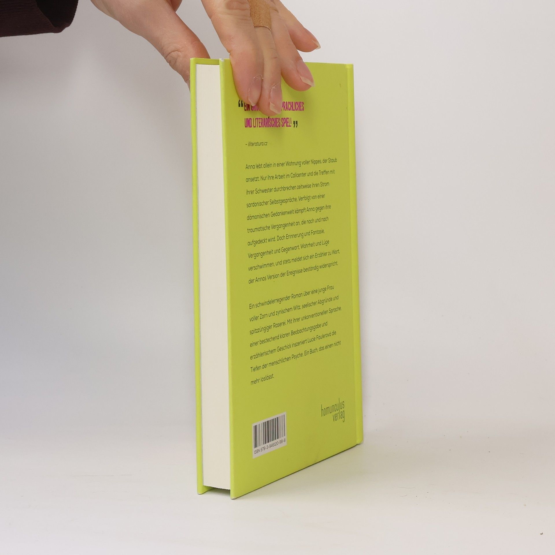 Die 28-jährige Anna lebt allein in einer Wohnung voller Nippes, der Staub ansetzt. Nur ihre Arbeit im Callcenter oder die Treffen mit ihrer Schwester Dana, einer dreifachen Mutter, durchbrechen zeitweise ihren Strom sardonischer Selbstgespräche. Verfolgt von einer dämonischen Gedankenwelt, die sie immer wieder auf unterschiedliche Weise sterben lässt, kämpft Anna gegen ihre traumatische Vergangenheit an, die nach und nach aufgedeckt wird. Doch in diesem Buch ist nichts gewiss: Erinnerung und Fantasie, Vergangenheit und Gegenwart, Wahrheit und Lüge verschwimmen, und stets meldet sich ein Erzähler zu Wort, der Annas Version der Ereignisse beständig widerspricht.Ein schwindelerregender Roman über eine junge Frau voller Zorn und zynischem Witz, seelischer Abgründe und spitzzüngiger Raserei. Mit ihrer unkonventionellen Sprache, einer bestechend klaren Beobachtungsgabe und erzählerischem Geschick inszeniert Lucie Faulerová die Tiefen der menschlichen Psyche. Ein Buch, das einen nicht mehr loslässt.