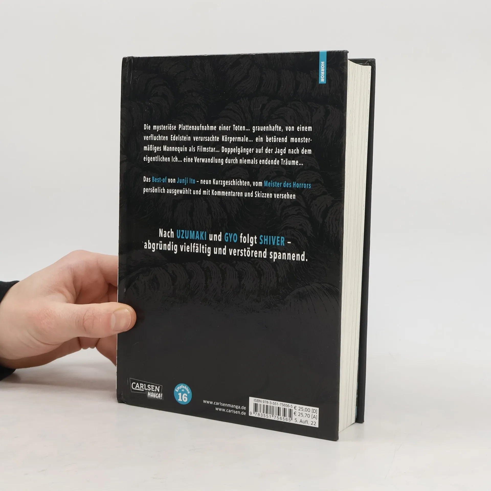 Das Best-of von Junji Ito – neun Kurzgeschichten vom Meister des Horrors selbst ausgewählt und mit persönlichen Kommentaren versehen. Die mysteriöse Plattenaufnahme einer Toten, grauenhafte Körpermale verursacht von einem verfluchten Edelstein, ein betörend-monstermäßiges Mannequin als Filmstar, Doppelgänger auf der Jagd nach dem eigentlichen Ich, eine Verwandlung durch niemals endende Träume... Junji Ito versteht das Handwerk des Übernatürlichen wie kaum ein anderer und beweist in SHIVER mit dieser Sammlung sein vielfältiges Talent, Reales in Horror zu verwandeln. Nach UZUMAKI und GYO folgt mit SHIVER die dritte Ausgabe des Ausnahmekünstlers bei Carlsen Manga - abgründig vielfältig und verstörend spannend.