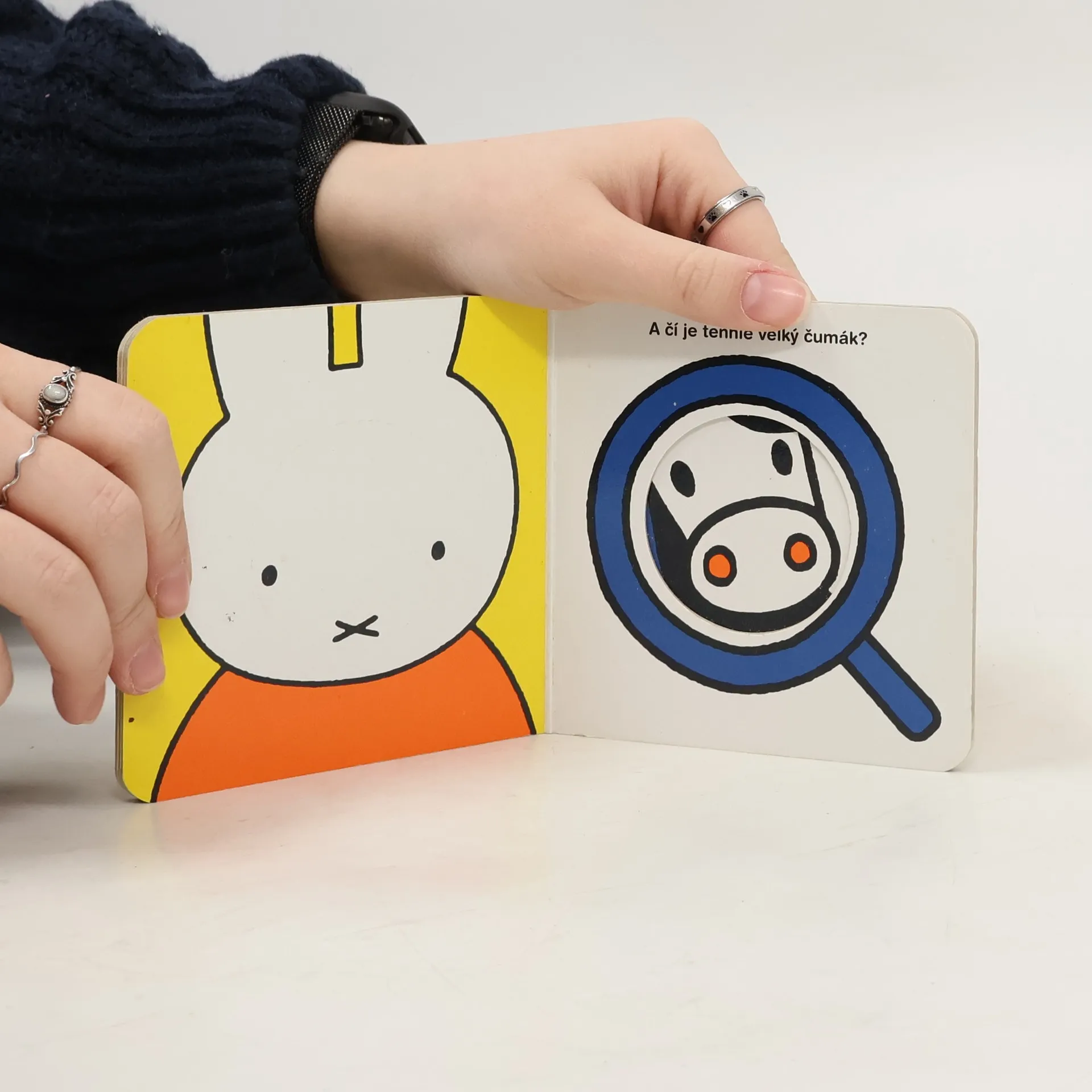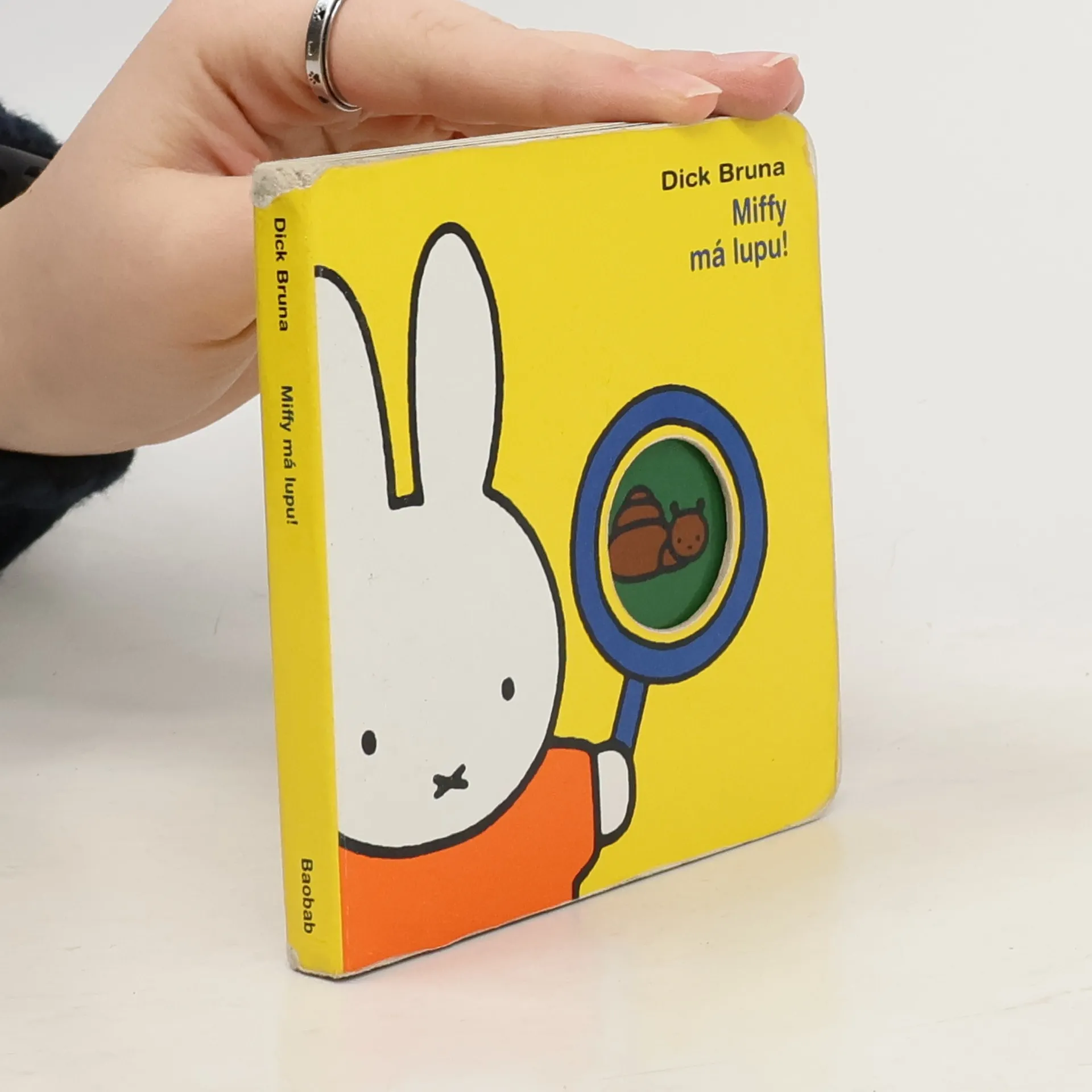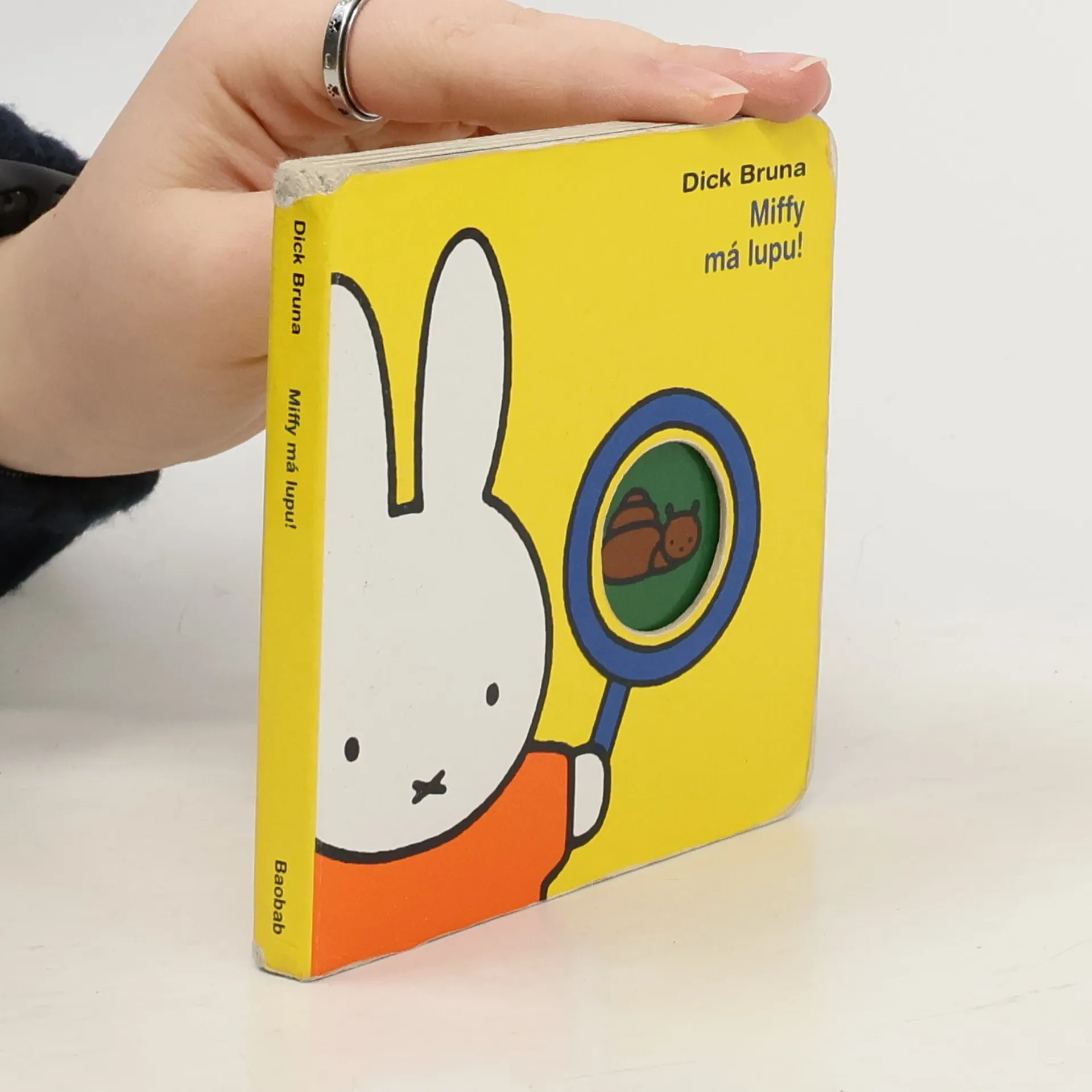 Leporelo pro nejmenší. Koho vidí malá Miffy v kulatém okénku na každé stránce? Vtipné výřezy a překrývání obrázků jsou pro nejmenší čtenáře tím pravým objevováním. S Miffy se děti naučí listovat v knížkách, pojmenovávat zvířata, hračky, tvary... Pestrý a srozumitelný je svět kamarádky Miffy. A díky zkušenostem autora je první dětské objevování nejen výtvarně dokonalé, ale také zábavné a vtipné. Knížka nizozemského ilustrátora Dicka Bruny navazuje na sérii knih pro nejmenší děti, kterou rozvíjí již od roku 1955. Časem se stal opravdovým klasikem a předurčil charakteristické rysy ilustrace pro nejmenší děti: jednoduchá pevná linka, vybraná barevná škála a grafické zobrazení dětského světa. Každá jeho knížka má nezaměnitelný půvab a vtip, zůstává odměřeně holandská a nepodléhá kýči.