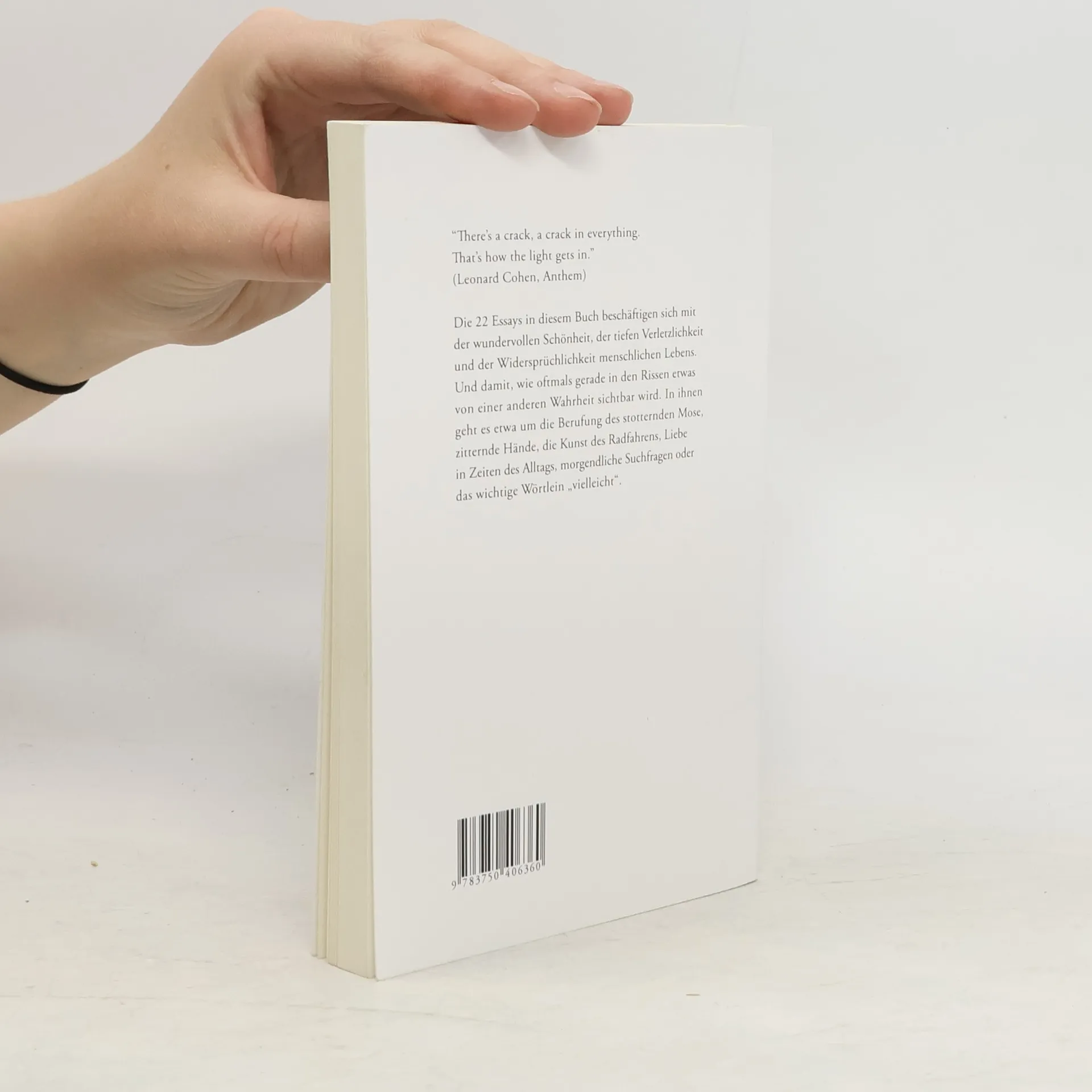 "There's a crack, a crack in everything. That's how the light gets in." (Leonard Cohen, Anthem) Die 22 Essays in diesem Buch beschäftigen sich mit der wundervollen Schönheit, der tiefen Verletzlichkeit und der Widersprüchlichkeit menschlichen Lebens. Und damit, wie oftmals gerade in den Rissen etwas von einer anderen Wahrheit sichtbar wird. In ihnen geht es etwa um die Berufung des stotternden Mose, zitternde Hände, die Kunst des Radfahrens, Liebe in Zeiten des Alltags, morgendliche Suchfragen oder das wichtige Wörtlein "vielleicht".