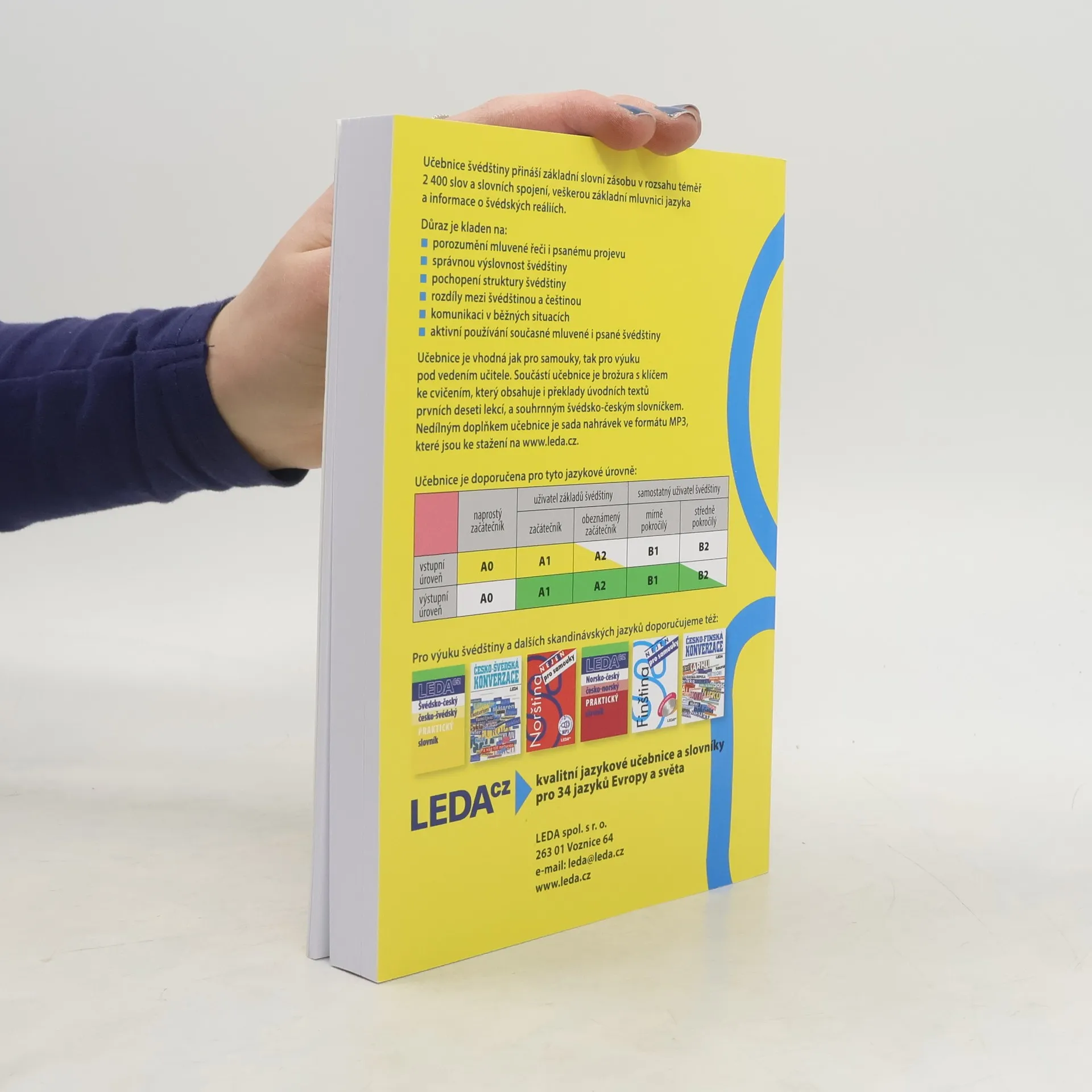 Učebnice švédštiny je určena jak pro samostatné studium, tak pro výuku pod vedením učitele. S její pomocí si osvojíte základní slovní zásobu v rozsahu téměř 2 400 slov, frazeologii, gramatiku a výslovnost švédštiny. Naučíte se komunikovat v běžných situacích a dozvíte se také hodněo švédských reáliích. Samostatná úvodní kapitola je věnována výslovnosti švédštiny. Každá z následujících dvaceti tematicky zaměřených lekcí obsahuje dva úvodní dialogy či texty, slovní zásobu, mluvnickou část, cvičení a doplňkovou část. Součástí učebnice je brožura s klíčem ke cvičením, který uvádí i překlady úvodních textů prvních deseti lekcí, a souhrnným švédsko-českým slovníčkem. Nedílný doplněk učebnice představuje nahrávka výslovnostních a poslechových cvičení, části slovní zásoby a úvodních textů v MP3. K dispozici je ke stažení pod touto anotací.