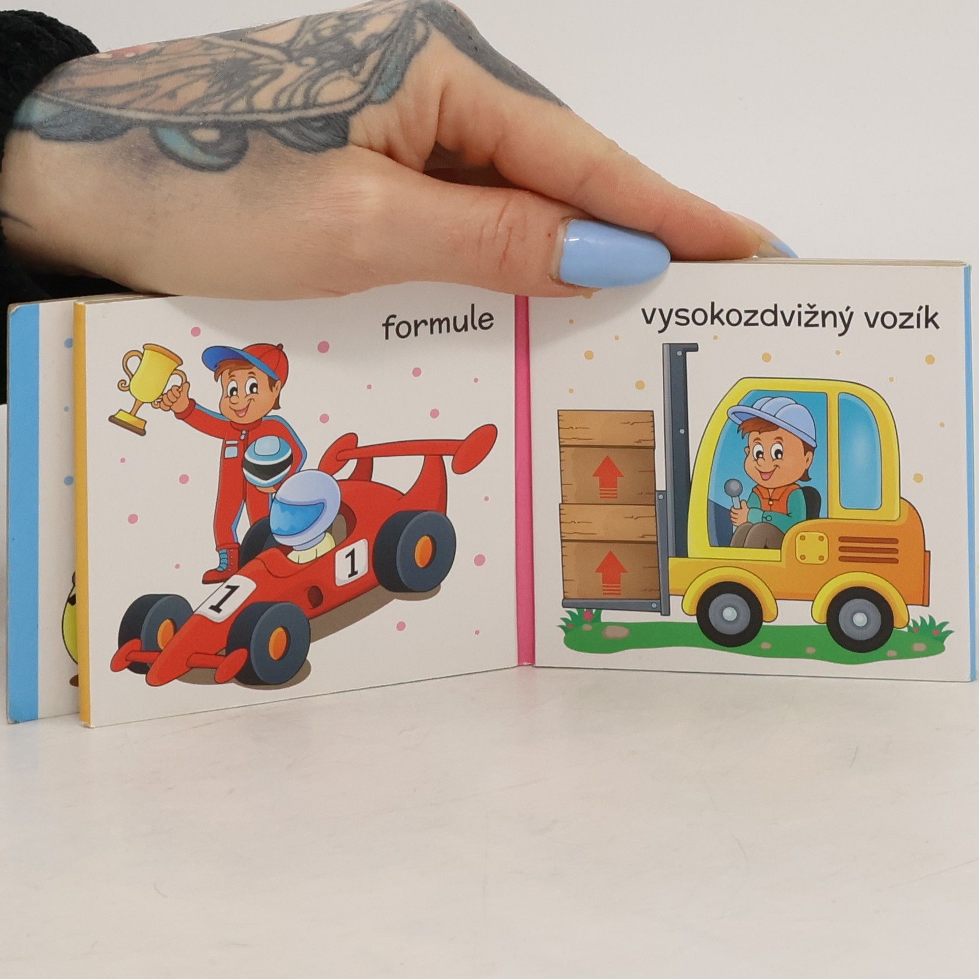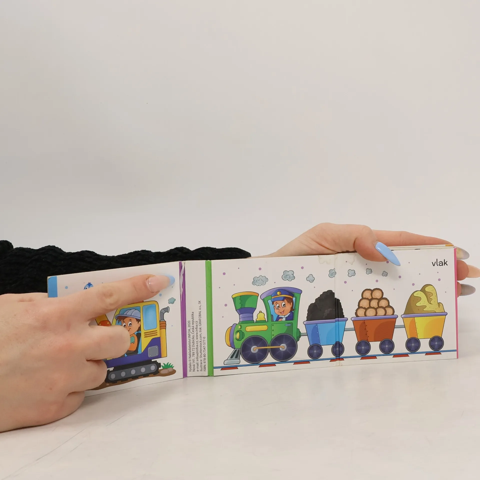 Leporelo pro nejmenší s ilustrovanými obrázky techniky, se kterými se mohou setkat. Při popisu ilustrací si dítě rozvíjí základní slovní zásobu a zábavnou formou se učí, jak se jmenují stroje kolem nás.