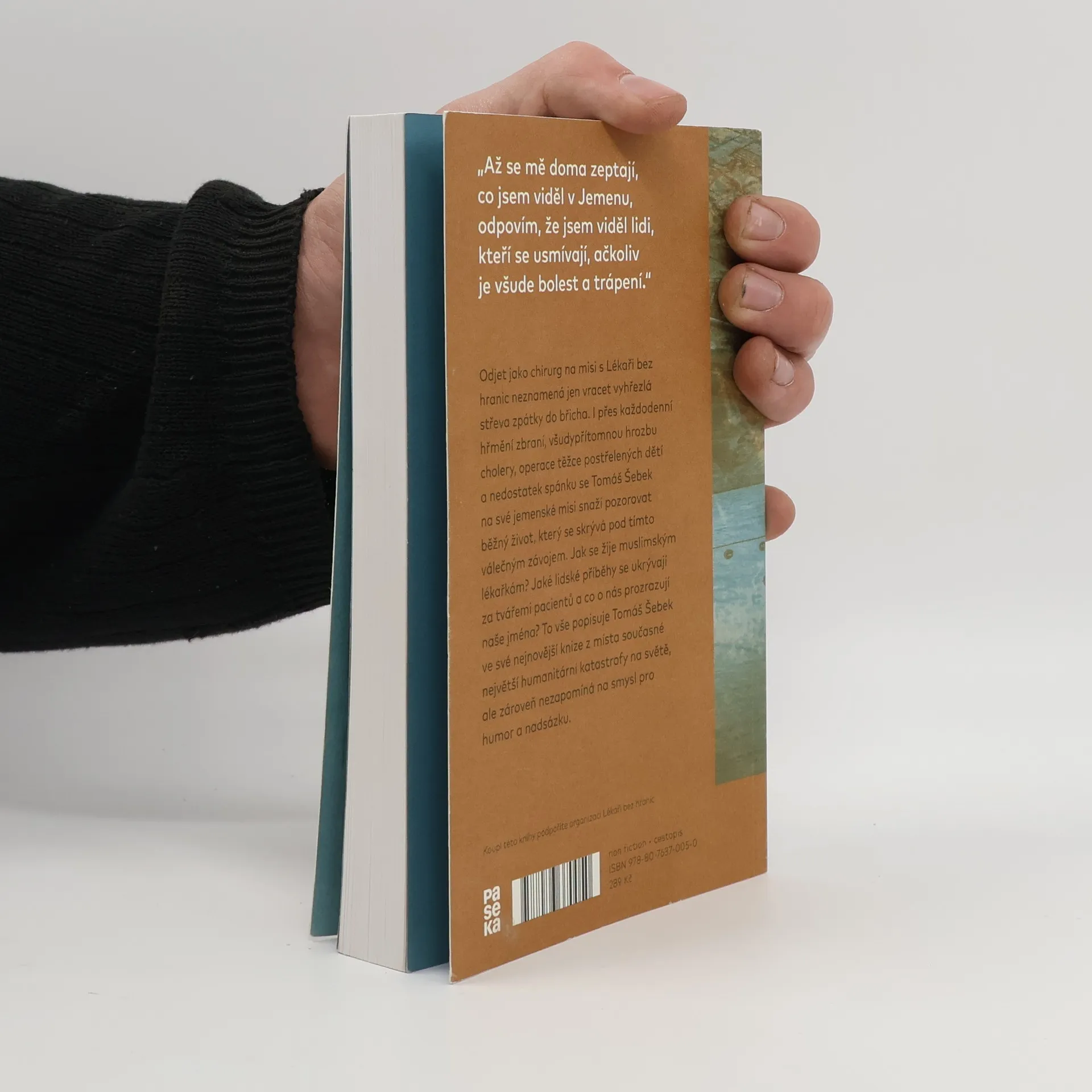 Odjet jako chirurg na misi s Lékaři bez hranic neznamená jen vracet vyhřezlá střeva zpátky do břicha. I přes každodenní hřmění střelby, všudypřítomnou hrozbu cholery, operace těžce postřelených dětí a nedostatek spánku se Tomáš Šebek na své jemenské misi snaží pozorovat běžný život, který se skrývá pod tímto válečným závojem. Jak se žije muslimským lékařkám? Jaké lidské příběhy se ukrývají za tvářemi pacientů a co o nás prozrazují naše jména? To vše popisuje Tomáš Šebek ve své nejnovější knize z místa současné největší humanitární katastrofy na světě, ale zároveň nezapomíná zapojit i smysl pro humor a nadsázku.