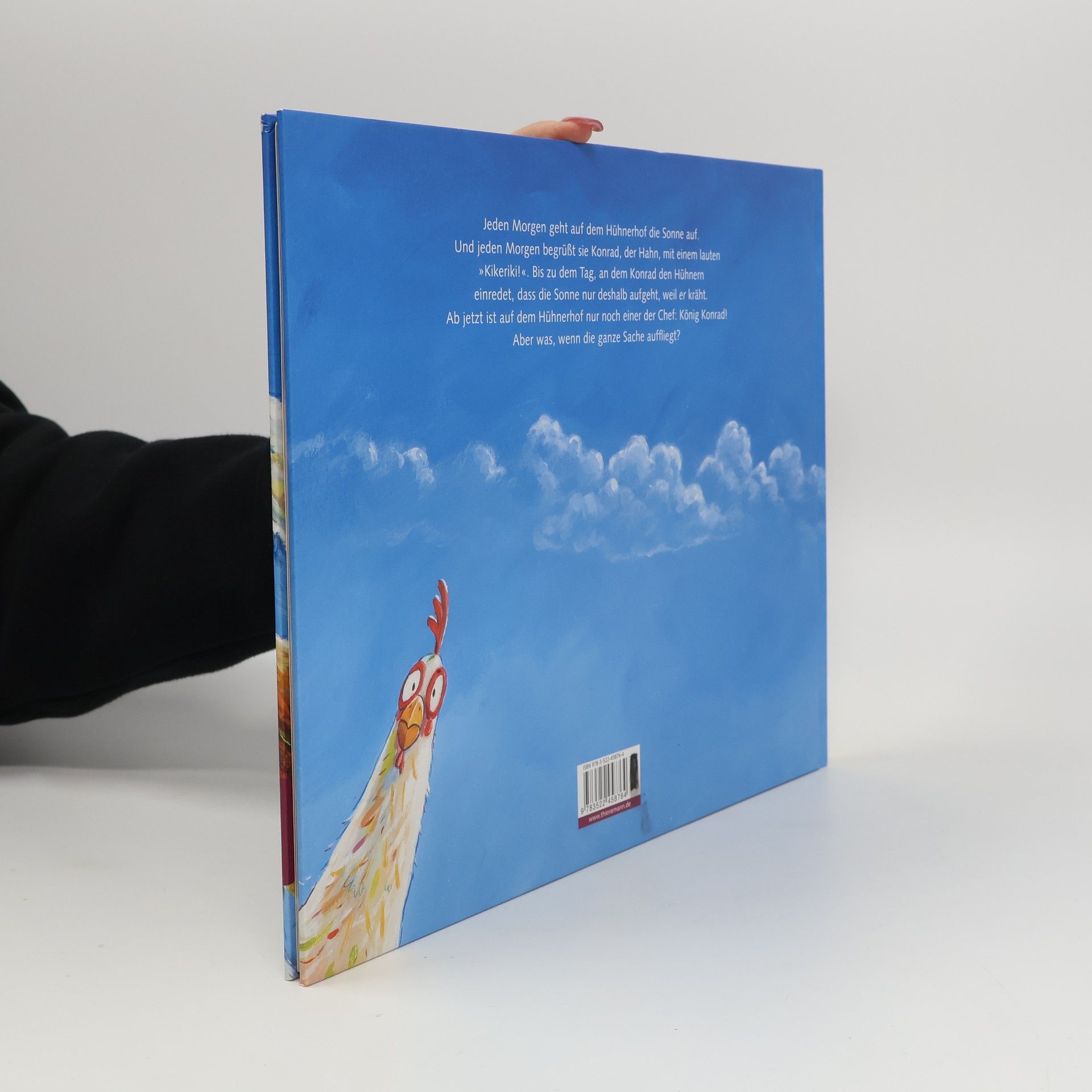 Jeden Morgen geht auf dem Hühnerhof die Sonne auf. Und jeden Morgen begrüßt sie Konrad, der Hahn, mit seinem Krähen. Eines Tages stellt Konrad eine wagemutige Behauptung auf: Nicht er kräht, weil die Sonne aufgeht, sondern die Sonne geht auf, weil er kräht! Schnell kann er die Hühner davon überzeugen, dass sie ihn gut hegen und pflegen sollten, wenn sie nicht wollen, dass der Hof in ewiger Dunkelheit versinkt. Die Hühner haben ab jetzt alle Schnäbel voll zu tun, Konrad die besten Würmer und die feinsten Körner zu suchen. Bis zu dem Morgen, als Konrad, inzwischen faul und überfressen, seinen Einsatz verpennt. Die Sonne geht auf – ganz ohne sein Krähen – und alles fliegt auf. Zur Strafe muss er sieben Wochen Würmer für die Hühner suchen, die sich von nun an nicht mehr so einfach reinlegen lassen.