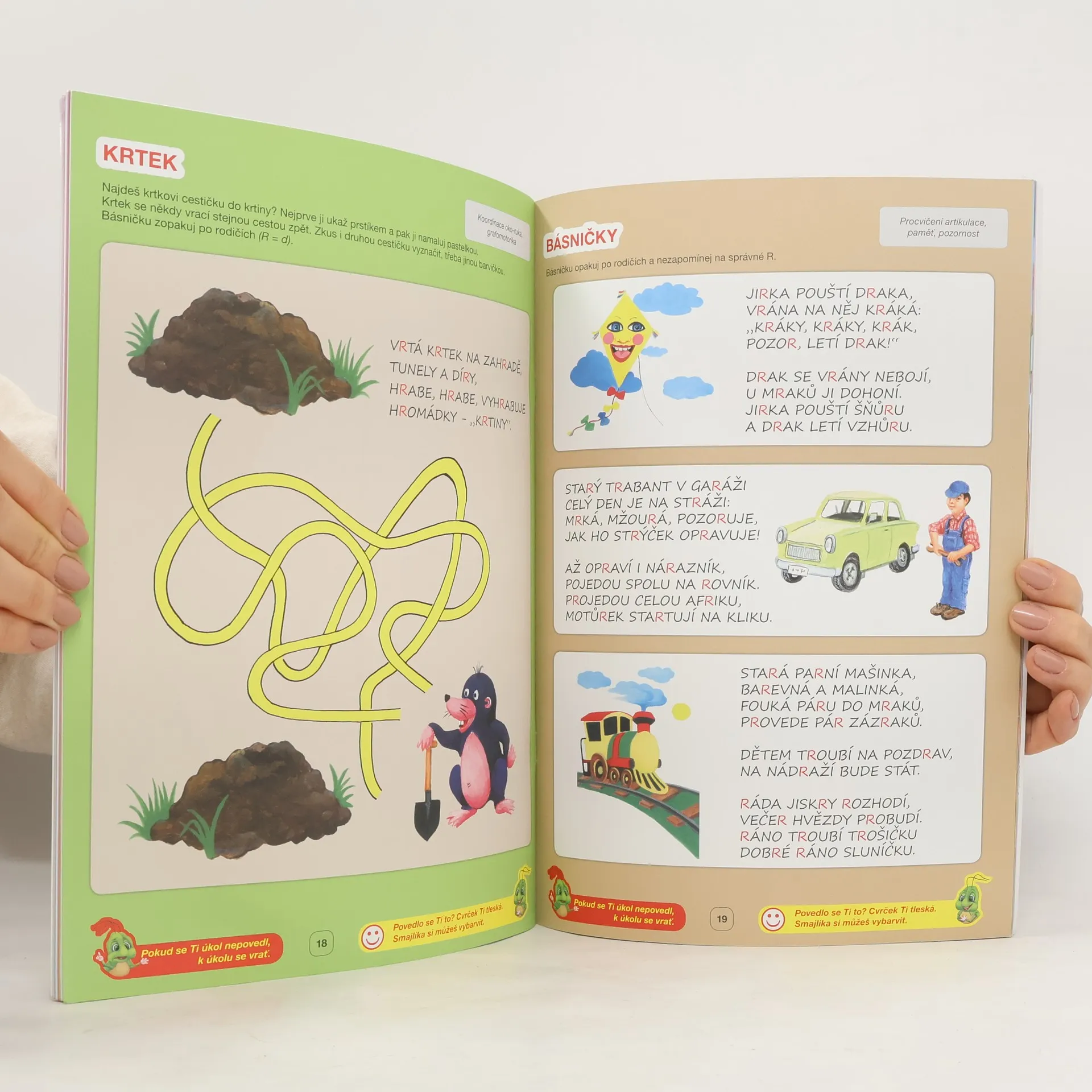 Pracovní sešit „R“ – další díl z řady pracovních sešitů zaměřených na hravé procvičování výslovnosti a vyjadřovacích dovedností – slovní zásobu, tvoření vět, tvarosloví a současné rozvíjení motoriky mluvidel, ruky = grafomotoriky, logického myšlení, pravo-levé orientace, pozornosti a paměti, zrakového a sluchového vnímání a dále rozlišování slabik a hlásek, rytmizace. To vše jsou předškolní dovednosti potřebné pro dobrou komunikaci ve škole a úspěšné zvládání čtení a psaní.