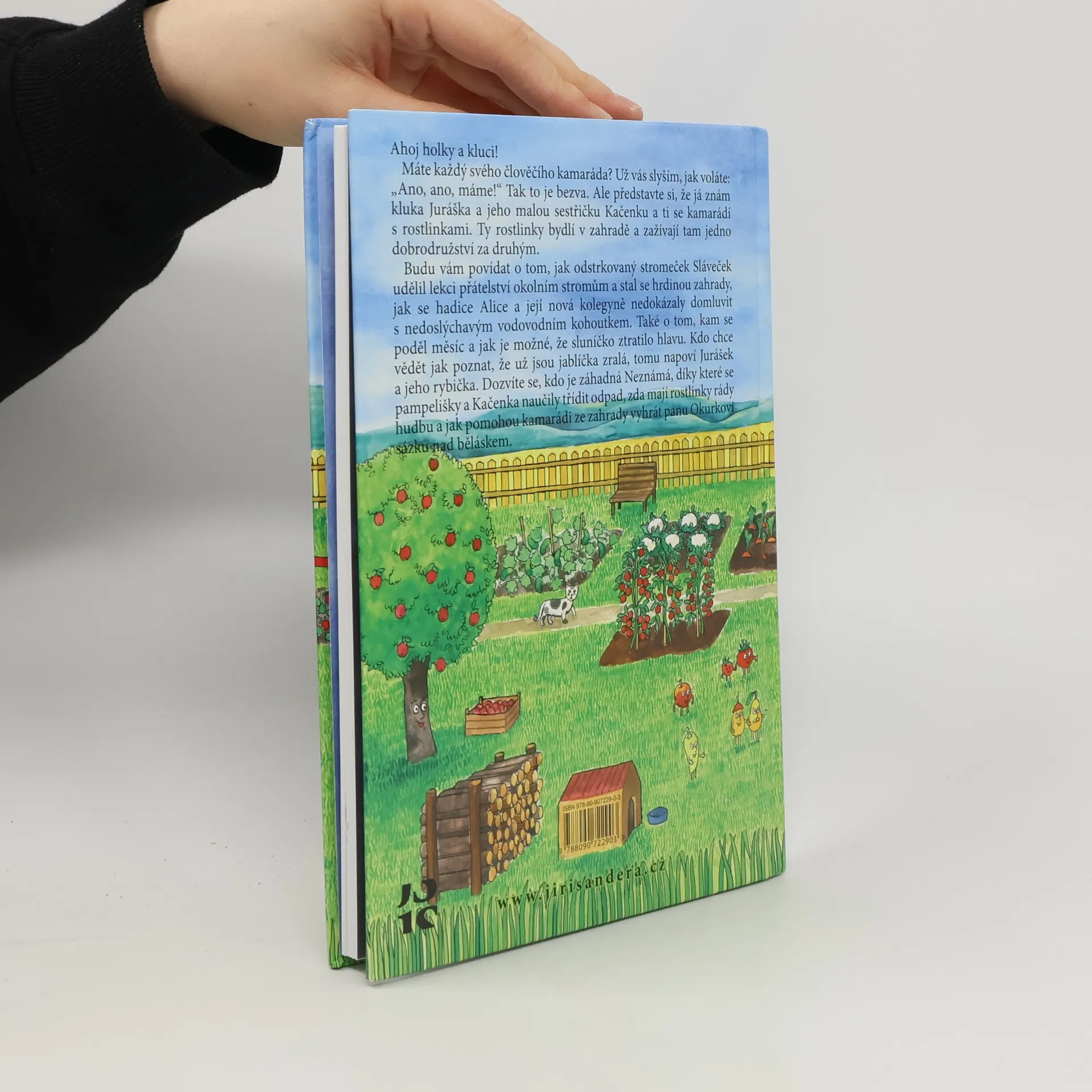 Ahoj holky a kluci! Máte každý svého člověčího kamaráda? Už vás slyším, jak voláte: „Ano, ano, máme!“ Tak to je bezva. Ale představte si, že já znám kluka Juráška a jeho malou sestřičku Kačenku a ti se kamarádí s rostlinkami. Ty rostlinky bydlí v zahradě a zažívají tam jedno dobrodružství za druhým. Budu vám povídat o tom, jak odstrkovaný stromeček Sláveček udělil lekci přátelství okolním stromům a stal se hrdinou zahrady, jak se hadice Alice se svou novou kolegyní a nedoslýchavým vodovodním kohoutkem neuměli dohodnout. Také o tom, kam se poděl měsíc a jak je možné, že sluníčko ztratilo hlavu. Kdo chce vědět jak poznat, že už jsou jablíčka zralá, tomu napoví Jurášek a jeho rybička. Dozvíte se, kdo je záhadná Neznámá, díky které se pampelišky a Kačenka naučily třídit odpad, zda mají rostlinky rády hudbu a jak pomohou kamarádi ze zahrady vyhrát panu Okurkovi sázku nad běláskem. O tom všem si počtete v této bohatě ilustrované knize, která volně navazuje na čtenářsky úspěšné tituly POHÁDKY Z KOUZELNÉ ZAHRADY A CO VYPRÁVĚLA HOUPACÍ SÍŤ.