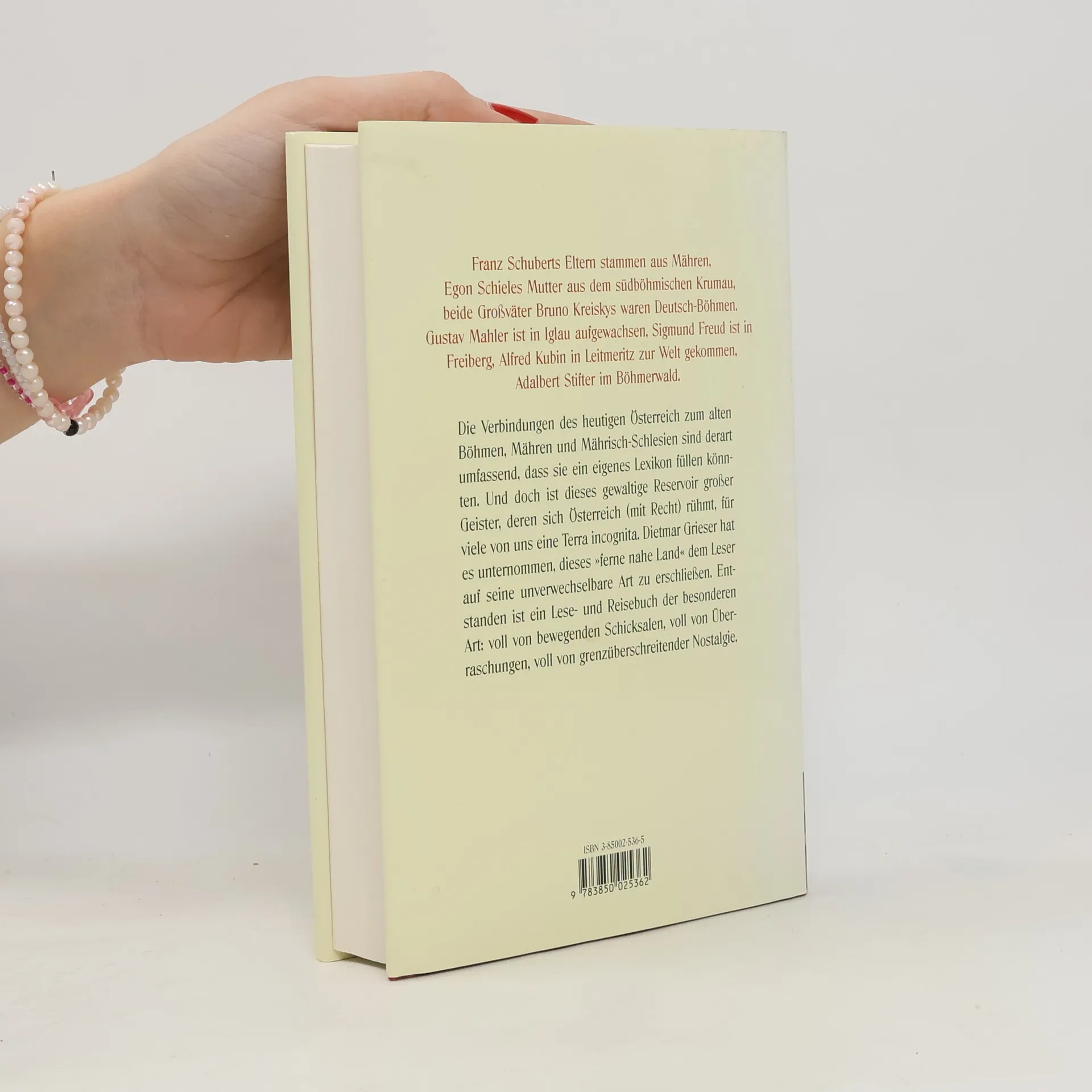 Franz Schuberts Eltern stammten aus Mähren, Egon Schieles Mutter aus dem südböhmischen Krumau, beide Großväter Bruno Kreiskys waren Deutsch-Böhmen. Gustav Mahler ist in Iglau aufgewachsen, Sigmund Freud ist in Freiberg, Alfred Kubin in Leitmeritz zur Welt gekommen, Adalbert Stifter im Böhmerwald. Die Verbindungen des heutigen Österreichs zum alten Böhmen, Mähren und Mährisch-Schlesien sind derart umfassend, dass sie ein eigenes Lexikon füllen könnten. Und doch ist dieses gewaltige Reservoir großer Geister, deren sich Österreich (mit Recht) rühmt, für viele von uns eine Terra incognita. Dietmar Grieser hat es unternommen, dieses „ferne nahe Land“ dem Leser auf seiner unverwechselbare Art zu erschließen. Entstanden ist ein Lese- und Reisebuch der besonderen Art: voll von bewegenden Schicksalen, voll von Überraschungen, voll von grenzüberschreitender Nostalgie.