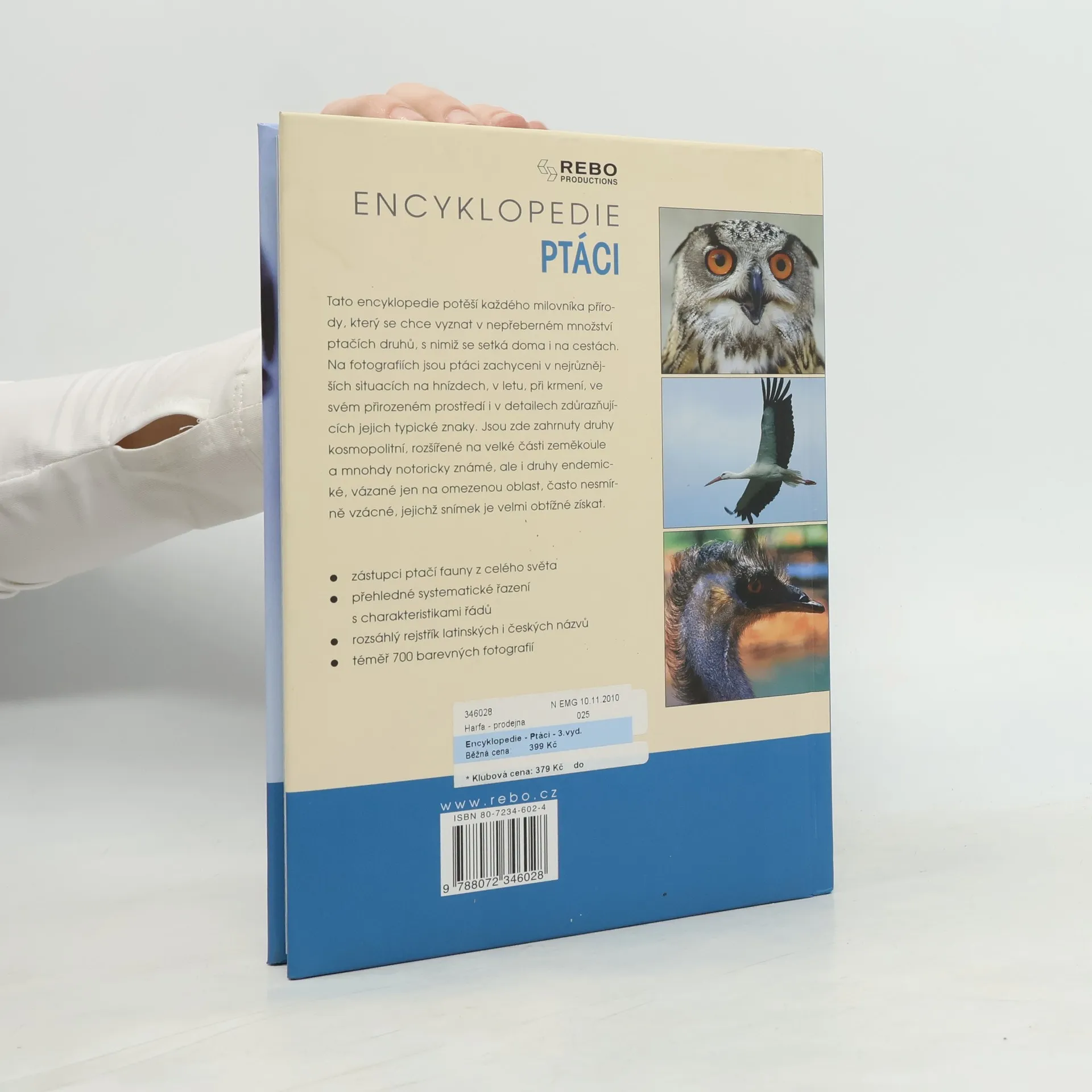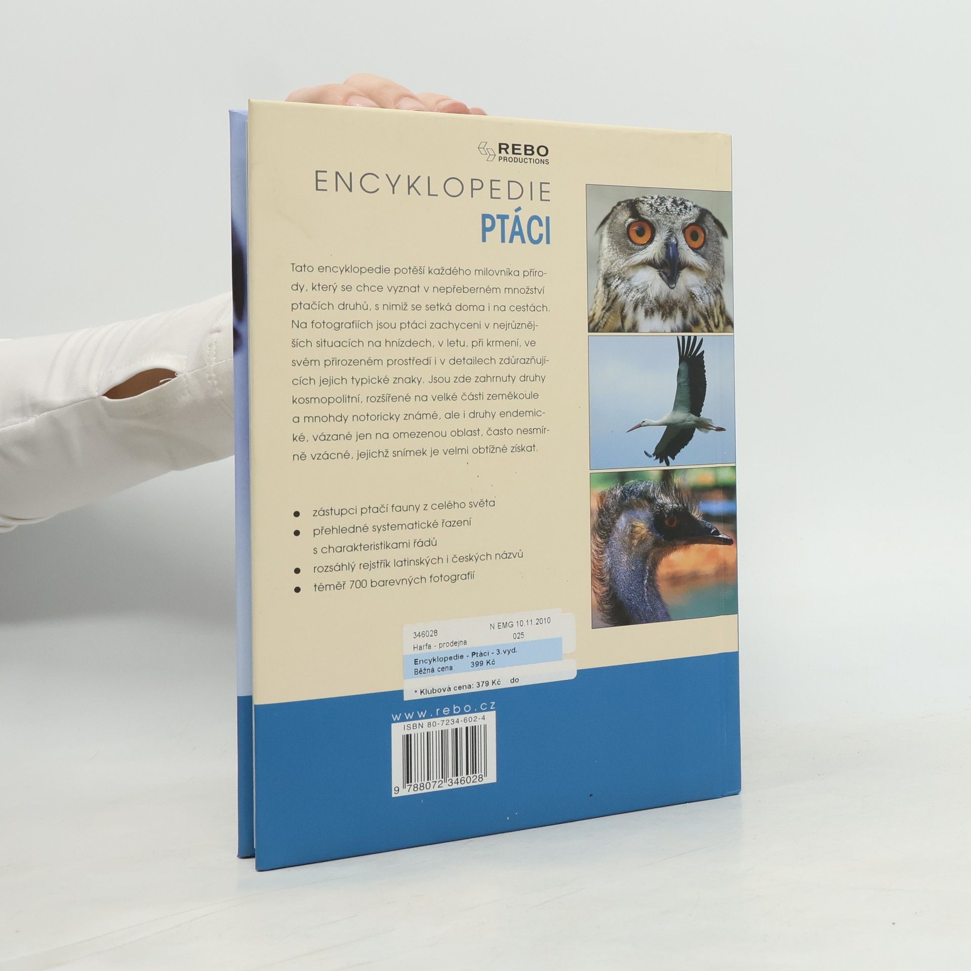 Tato encyklopedie potěší každého milovníka přírody, který se chce vyznat v nepřeberném množství ptačích druhů, s nimiž se setká doma i na cestách. Na fotografiích jsou ptáci zachyceni v nejrůznějších situacích na hnízdech, v letu, při krmení, ve svém přirozeném prostředí i v detailech zdůrazňujících jejich typické znaky. Jsou zde zahrnuty druhy kosmopolitní, rozšířené na velké části zeměkoule a mnohdy notoricky známé, ale i druhy endemické, vázané jen na omezenou oblast, často nesmírně vzácné, jejichž snímek je velmi obtížné získat.