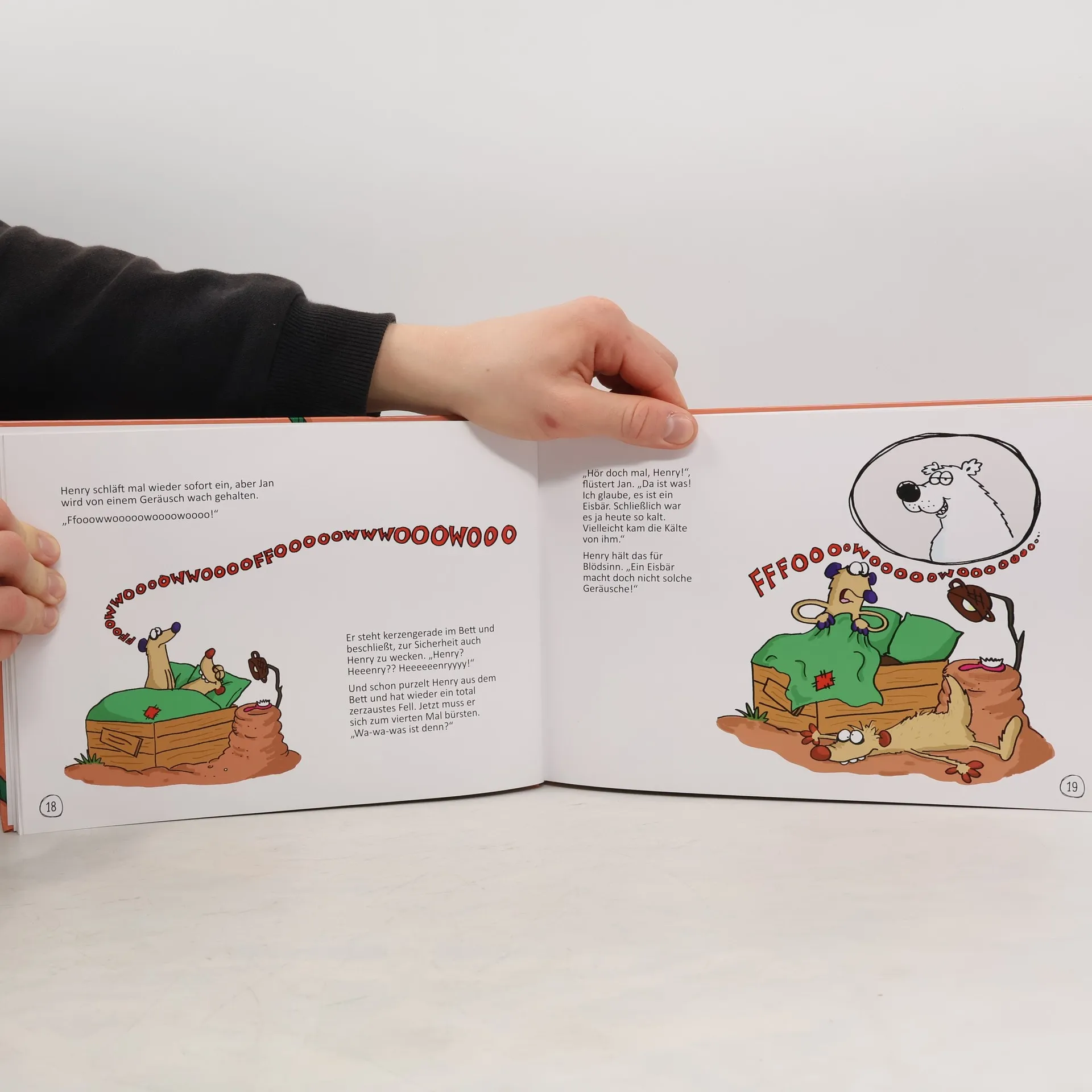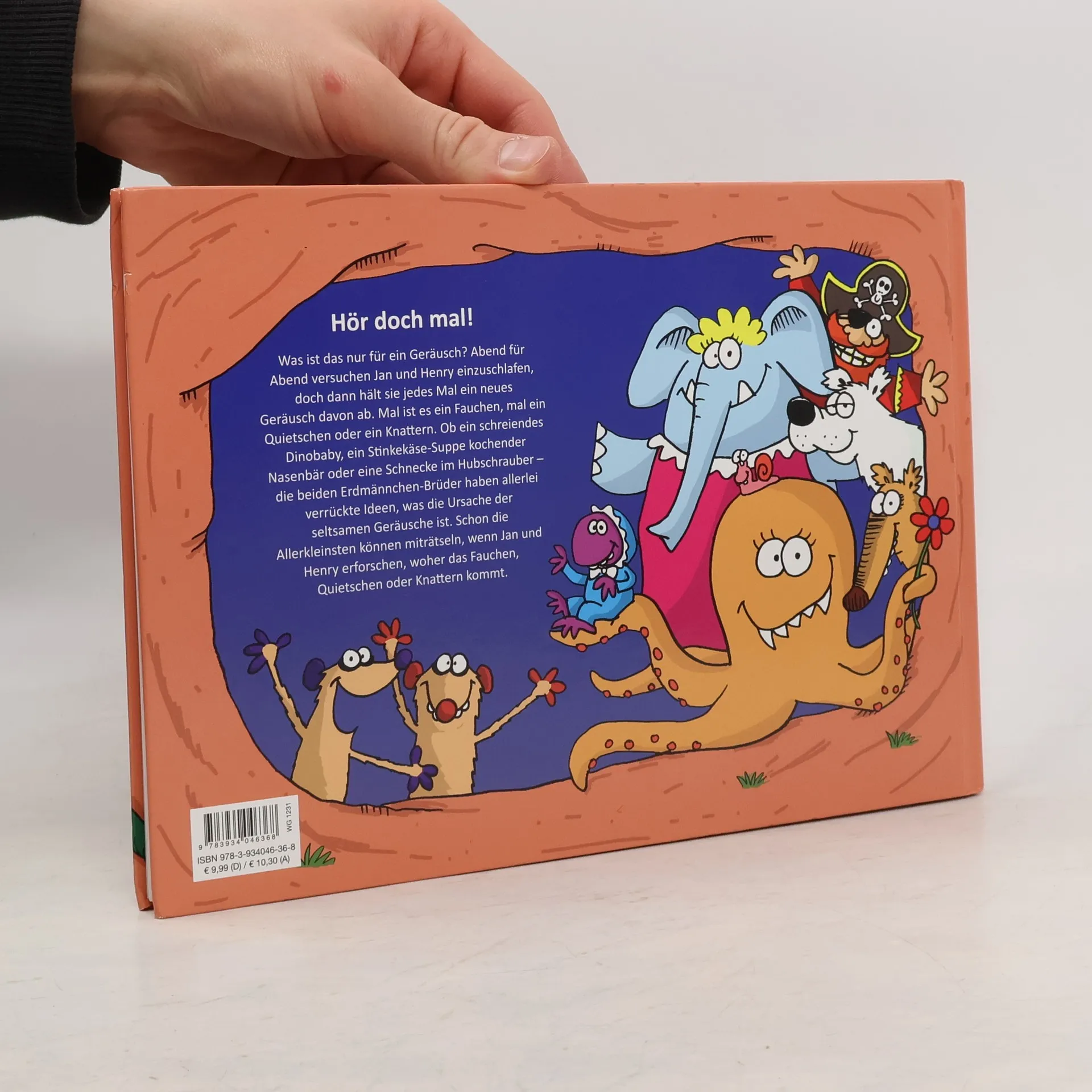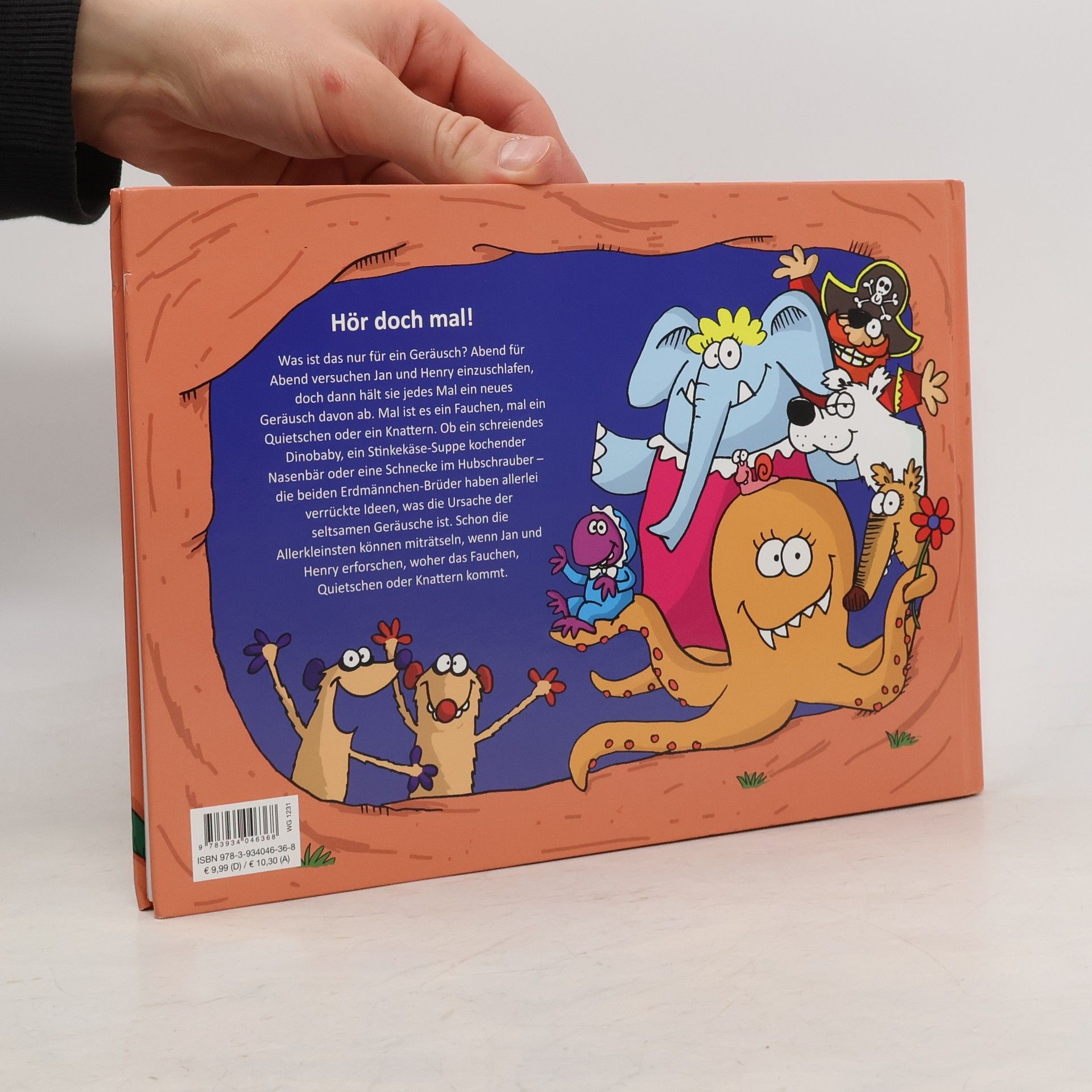 Hör doch mal! Was ist das nur für ein Geräusch? Abend für Abend versuchen Jan und Henry einzuschlafen, doch dann hält sie jedes Mal ein neues Geräusch davon ab. Mal ist es ein Fauchen, mal ein Quietschen oder ein Knattern. Ob ein schreiendes Dinobaby, ein Stinkekäse‐Suppe kochender Nasenbär oder eine Schnecke im Hubschrauber – die beiden Erdmännchen‐Brüder haben allerlei verrückte Ideen, was die Ursache der seltsamen Geräusche ist. Schon die Allerkleinsten können miträtseln, wenn Jan und Henry erforschen, woher das Fauchen, Quietschen oder Knattern kommt.