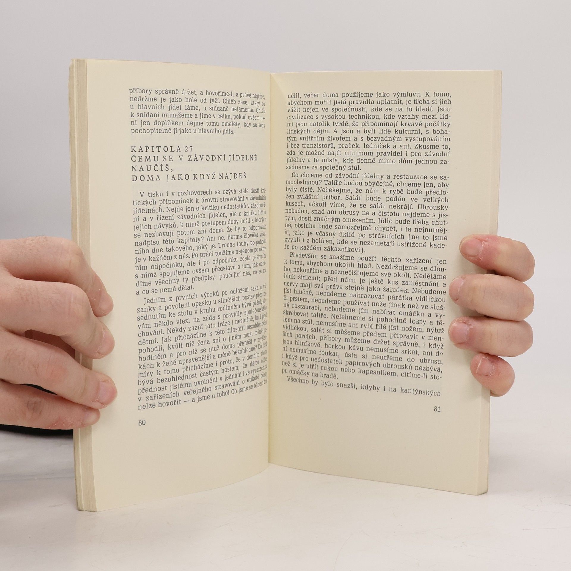 Knížka, která vznikla z článků uveřejňovaných na pokračování v Rudém právu, shrnuje pravidla společenského styku a chování v rodině, mezi přáteli, na pracovišti, ve veřejných místnostech i při oficiálních příležitostech. Kromě všeobecných pravidel etikety poučí i o způsobu oblékání, zásadách stolování a chování u stolu i o tom, jak připravit různé druhy pohoštění, zorganizovat oslavy v rodině a společenské podniky oficiálního charakteru.