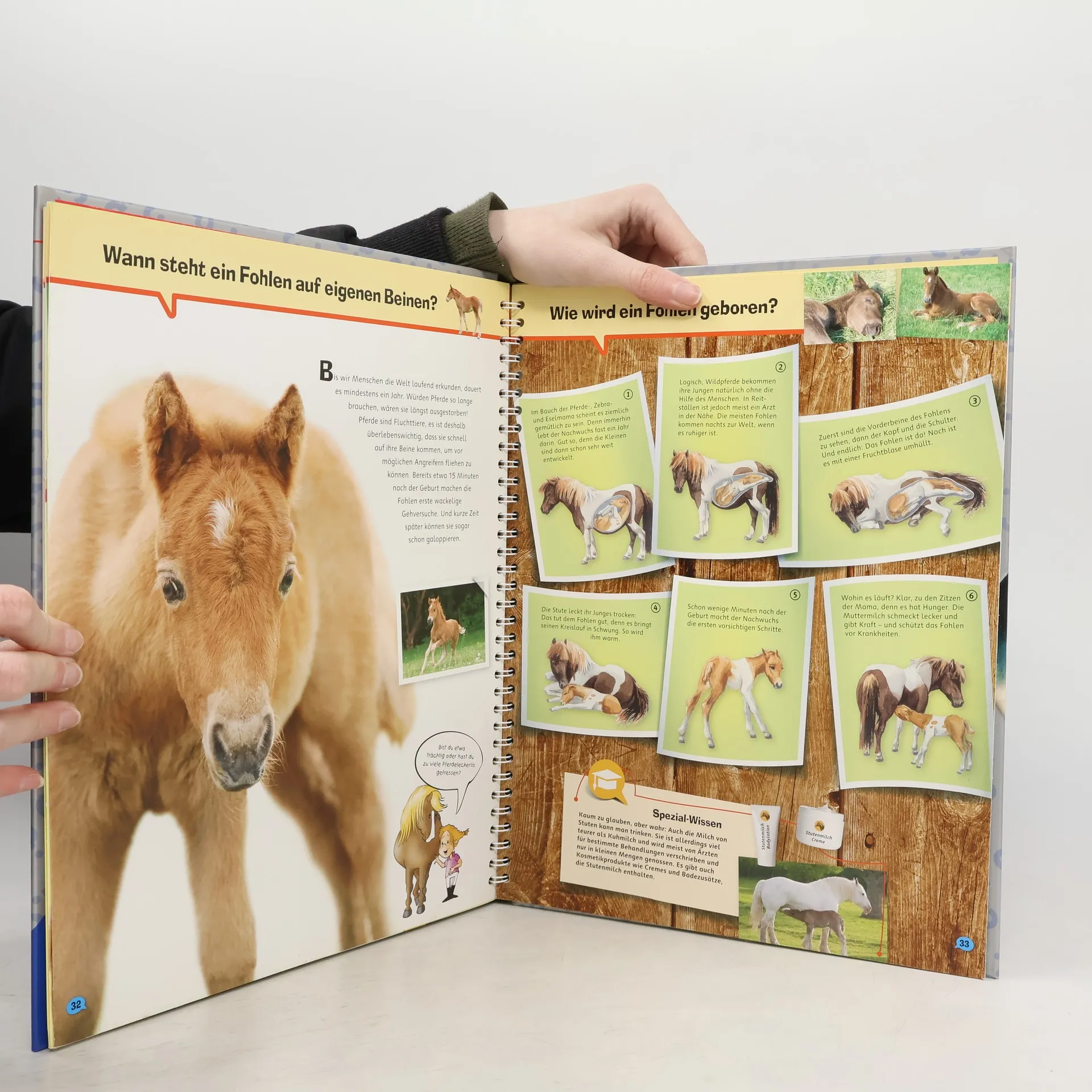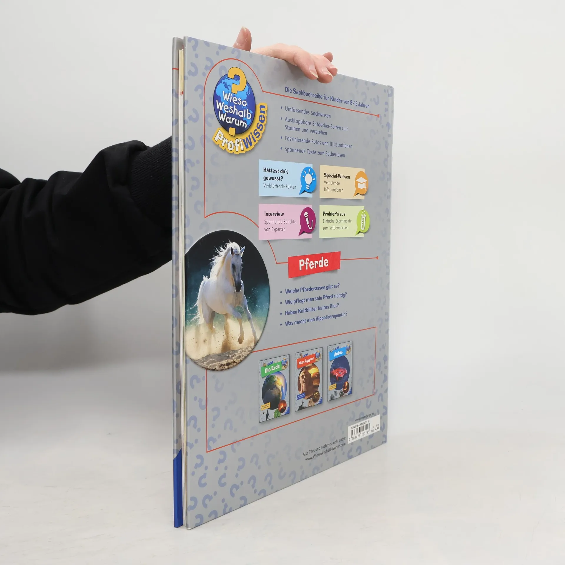 Wie wird ein Fohlen geboren? Schimmelt ein Schimmel? Welcher Reitstil passt zu dir? Diese und viele weitere Fragen rund um Pferde und Ponys werden unterhaltsam beantwortet. Kinder ab 8 Jahren erfahren, welche Fähigkeiten Pferde haben und lernen, wie man sie richtig pflegt und reitet. Das Buch stellt zudem verschiedene Berufe vor, die mit diesen beliebten Tieren verbunden sind. Naturgetreue Illustrationen und zahlreiche Fotos laden die Leser in die faszinierende Welt der Haflinger, Lipizzaner und Islandponys ein. Die Sachbuchreihe richtet sich an Kinder von 8–12 Jahren und bietet spannende Einblicke in verschiedene Themen. Ob es um Dinosaurier, Rennwagen oder das Weltall geht, hier finden wissbegierige Leser alles, was sie wissen möchten. Mit modernem Design, beeindruckenden Bildern und überraschenden Fakten wird Wissen lebendig vermittelt. Witzige Comics lockern die Texte auf, während Experten in Interviews interessante Einblicke geben. Spezial-Wissen-Kästen bieten tiefere Informationen, und zahlreiche Anleitungen für Experimente laden zum Ausprobieren ein. Ausklappbare Entdeckerseiten in jedem Band bieten zusätzlich noch mehr zum Staunen und Entdecken. Ein unterhaltsamer Begleiter durch verschiedene Wissenswelten!