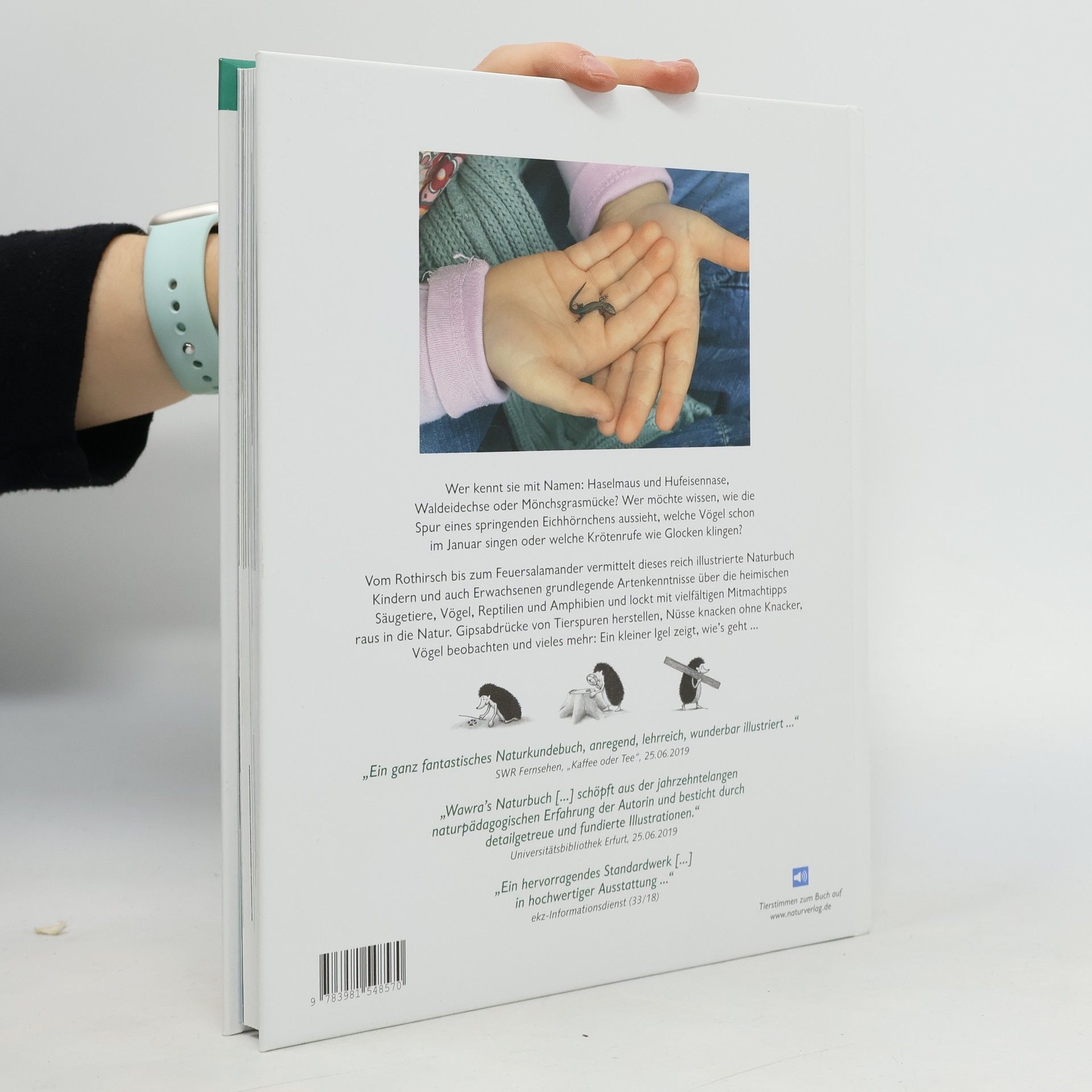 Wer kennt sie mit Namen: Haselmaus und Hufeisennase, Waldeidechse oder Mönchsgrasmücke? Wer möchte wissen, wie die Spur eines springenden Eichhörnchens aussieht, welche Vögel schon im Januar singen oder welche Krötenrufe wie Glocken klingen? – Vom Rothirsch bis zum Feuersalamander vermittelt dieses reich illustrierte Naturbuch Kindern und auch Erwachsenen grundlegende Artenkenntnisse über die heimischen Säugetiere, Vögel, Reptilien und Amphibien und lockt mit vielfältigen Mitmachtipps raus in die Natur. Gipsabdrücke von Tierspuren herstellen, Nüsse knacken ohne Knacker, Vögel beobachten und vieles mehr: Ein kleiner Igel zeigt, wie’s geht. – Kurz: Ein außergewöhnlich schönes Bestimmungs- und Entdeckungsbuch mit spannendem Naturwissen für Jung und Alt!