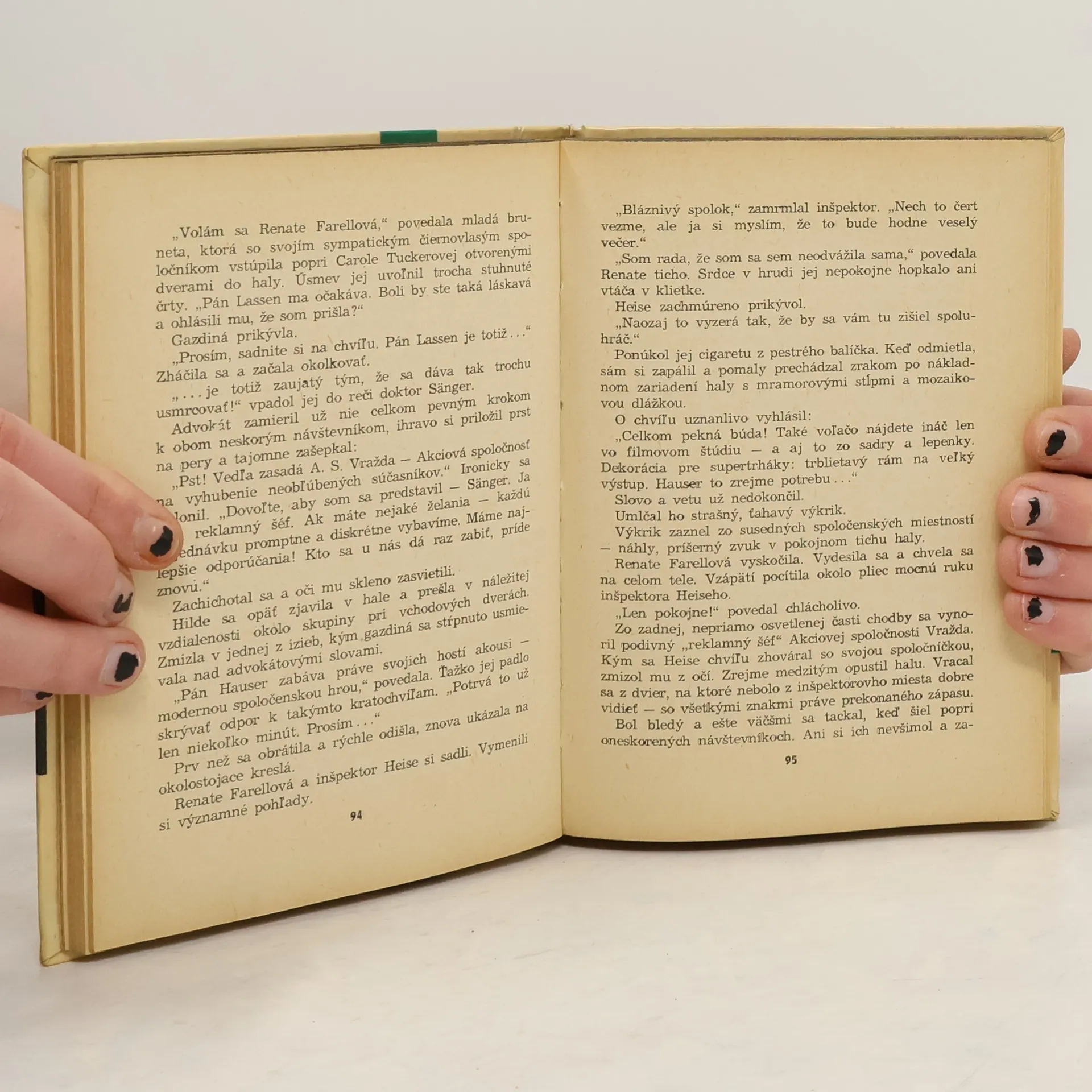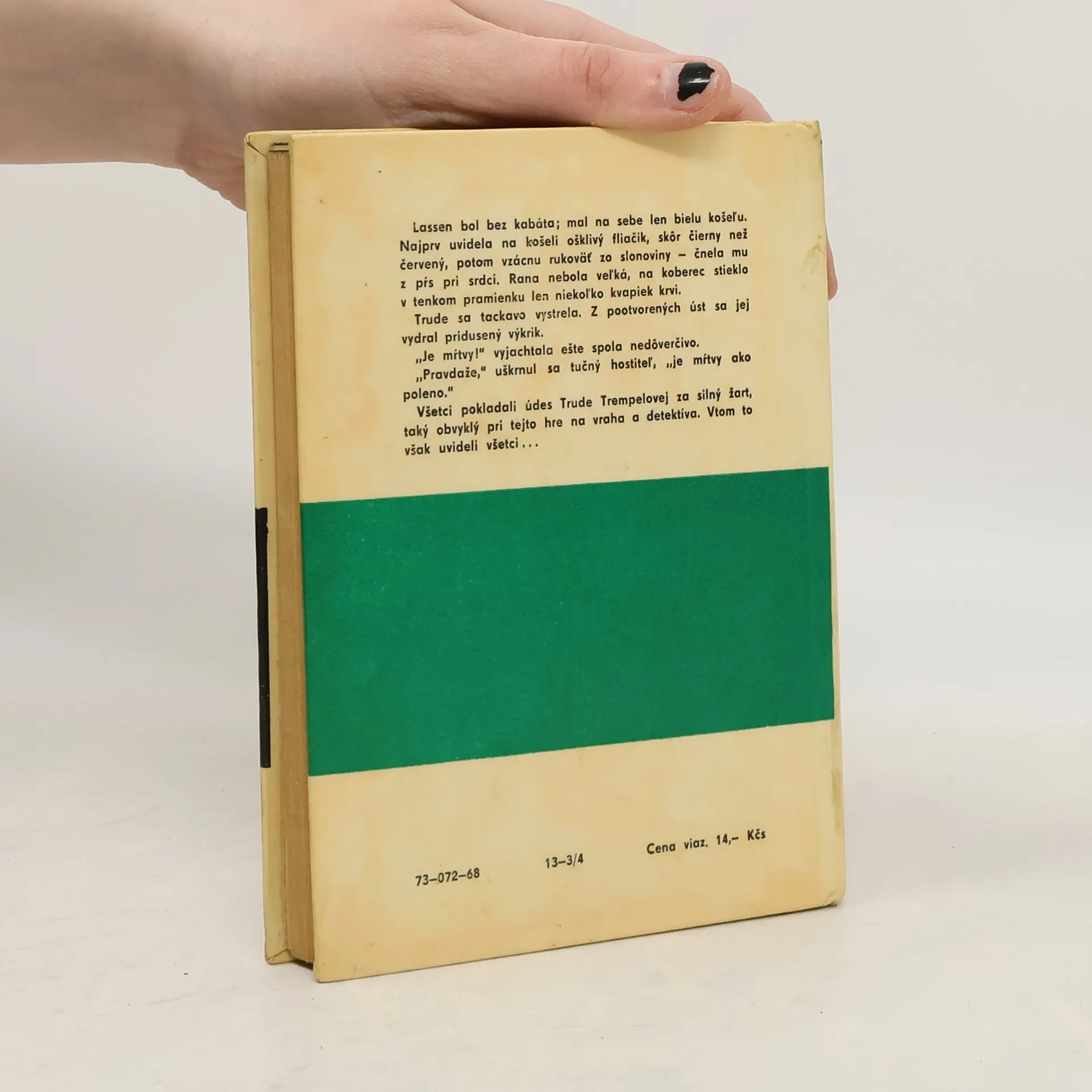 Lassen bol bez kabáta, mal na sebe len bielu košeľu. Najprv uvidela na košeli ošklivý fliačik, skôr čierny než červený, potom vzácnu rukoväť zo slonoviny - čnela mu z pŕs pri srdci. Rana nebola veľká, na koberec stieklo v tenkom pramienku len niekoľko kvapiek krvi. Trude sa tackavo vystrela. Zpootvorených úst sa jej vydral pridusený výkrik. \"Je mŕtvy!\" vyjachtala...