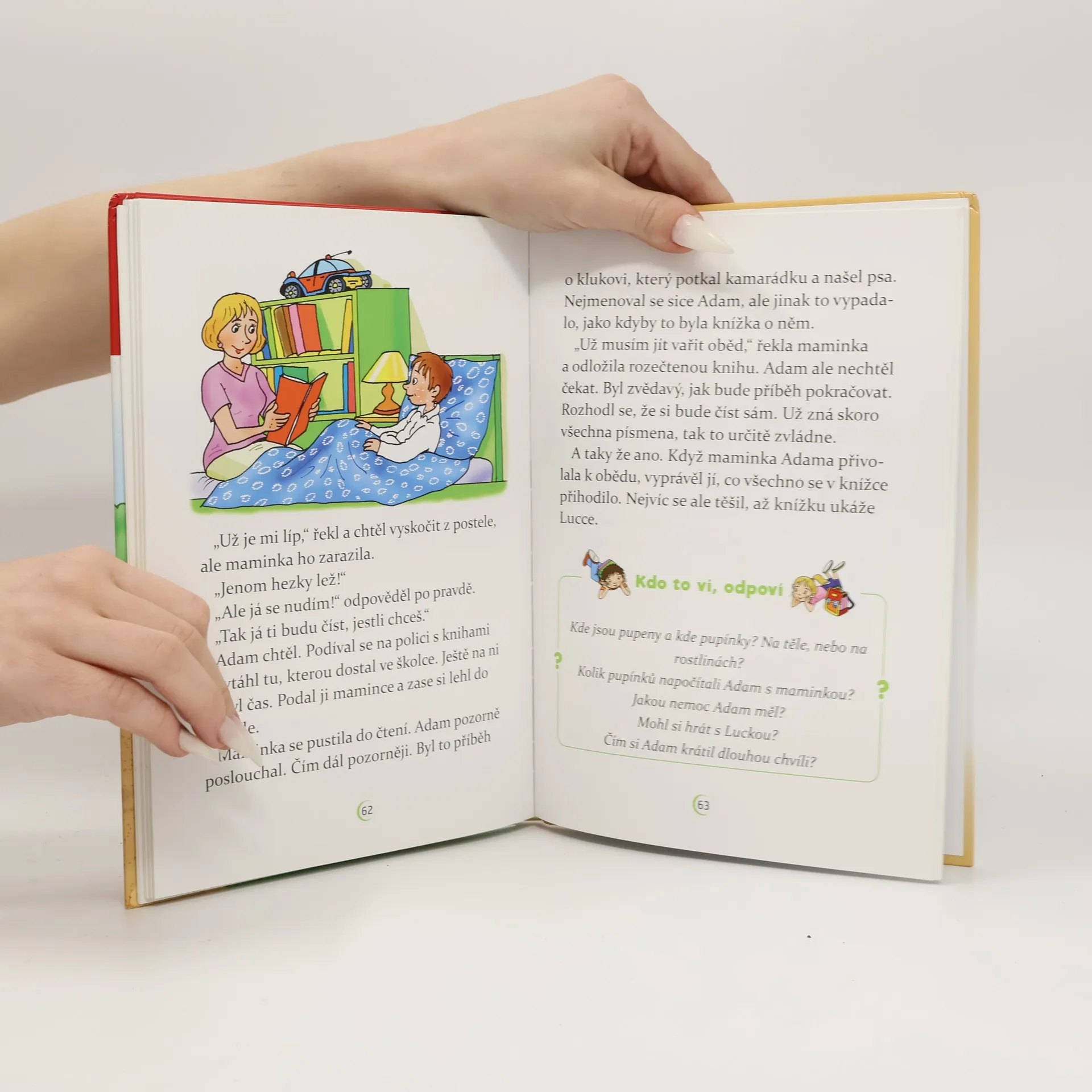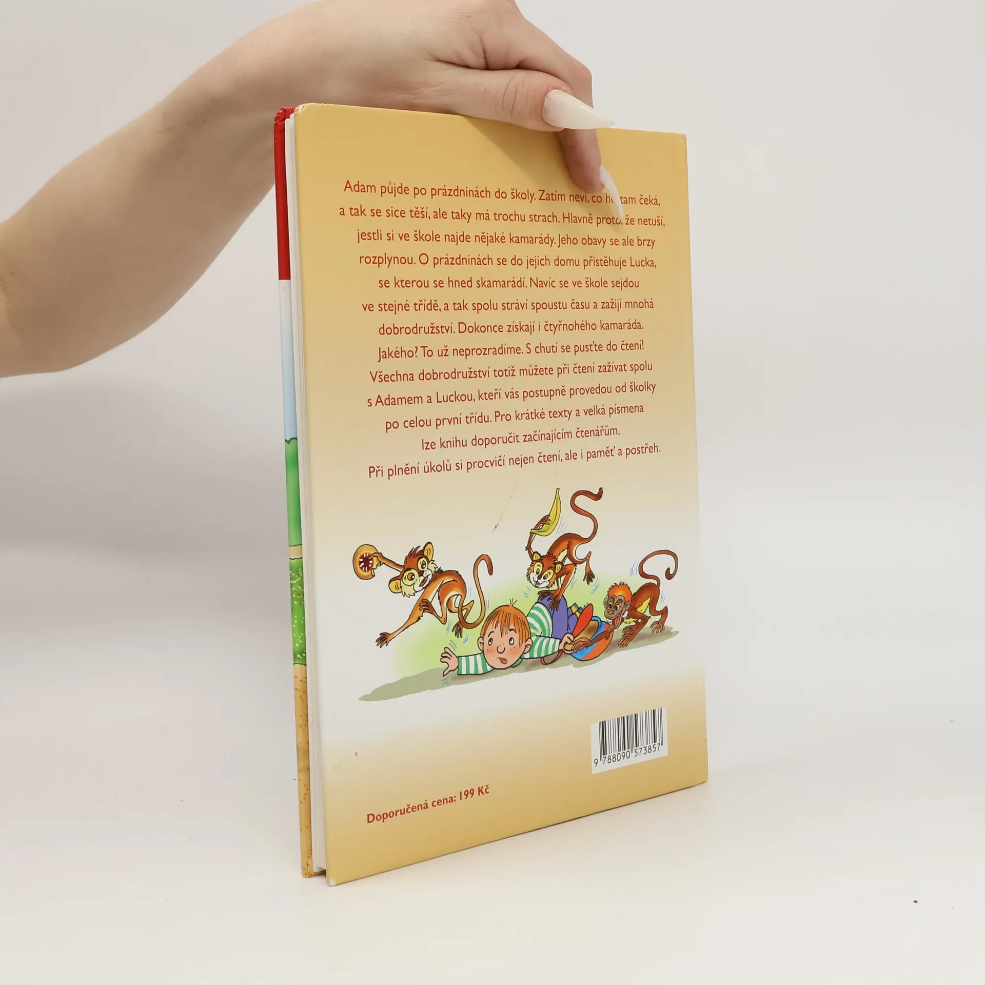 Adam půjde po prázdninách do školy. Zatím neví, co ho tam čeká, a tak se sice těší, ale taky má trochu strach. Hlavně proto, že netuší, jestli si ve škole najde nějaké kamarády. Jeho obavy se ale brzy rozplynou. O prázdninách se do jejich domu přistěhuje Lucka, se kterou se hned skamarádí. Navíc se ve škole sejdou ve stejné třídě, a tak spolu stráví spoustu času a zažijí mnohá dobrodružství. Dokonce získají i čtyřnohého kamaráda. Jakého? To už neprozradíme. S chutí se pusťte do čtení! Všechna dobrodružství totiž můžete při čtení zažívat spolu s Adamem a Luckou, kteří vás postupně provedou od školky po celou první třídu. Pro krátké texty a velká písmena lze knihu doporučit začínajícím čtenářům. Při plnění úkolů si procvičí nejen čtení, ale i paměť a postřeh