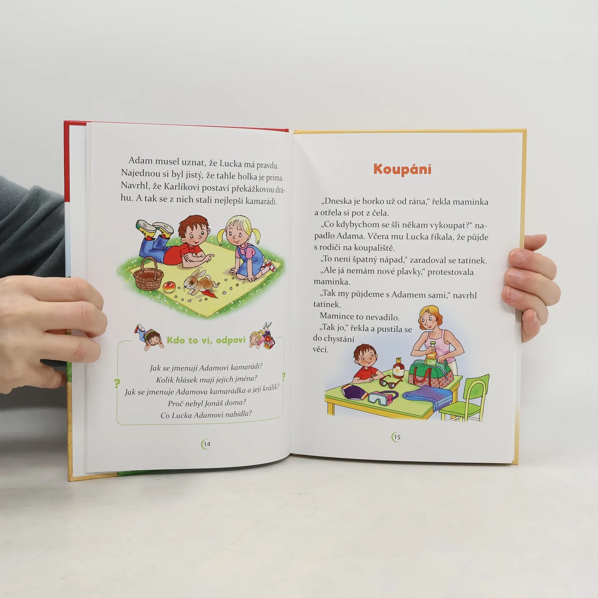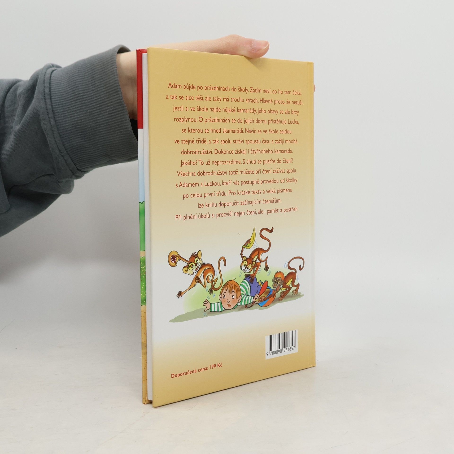 Adam půjde po prázdninách do školy. Zatím neví, co ho tam čeká, a tak se sice těší, ale taky má trochu strach. Hlavně proto, že netuší, jestli si ve škole najde nějaké kamarády. Jeho obavy se ale brzy rozplynou. O prázdninách se do jejich domu přistěhuje Lucka, se kterou se hned skamarádí. Navíc se ve škole sejdou ve stejné třídě, a tak spolu stráví spoustu času a zažijí mnohá dobrodružství. Dokonce získají i čtyřnohého kamaráda. Jakého? To už neprozradíme. S chutí se pusťte do čtení! Všechna dobrodružství totiž můžete při čtení zažívat spolu s Adamem a Luckou, kteří vás postupně provedou od školky po celou první třídu. Pro krátké texty a velká písmena lze knihu doporučit začínajícím čtenářům. Při plnění úkolů si procvičí nejen čtení, ale i paměť a postřeh