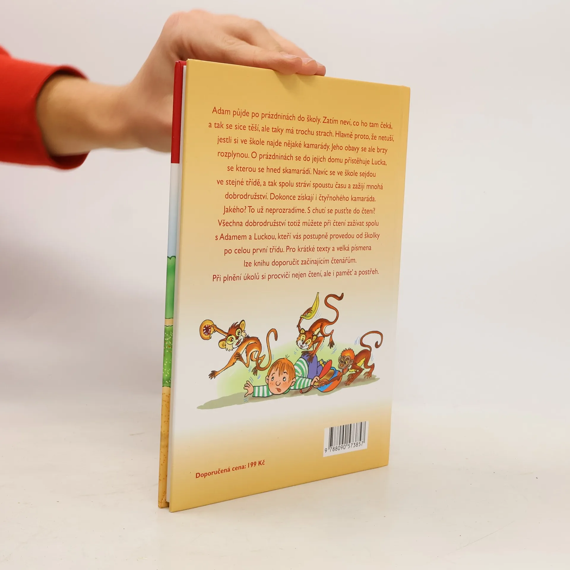 Adam půjde po prázdninách do školy. Zatím neví, co ho tam čeká, a tak se sice těší, ale taky má trochu strach. Hlavně proto, že netuší, jestli si ve škole najde nějaké kamarády. Jeho obavy se ale brzy rozplynou. O prázdninách se do jejich domu přistěhuje Lucka, se kterou se hned skamarádí. Navíc se ve škole sejdou ve stejné třídě, a tak spolu stráví spoustu času a zažijí mnohá dobrodružství. Dokonce získají i čtyřnohého kamaráda. Jakého? To už neprozradíme. S chutí se pusťte do čtení! Všechna dobrodružství totiž můžete při čtení zažívat spolu s Adamem a Luckou, kteří vás postupně provedou od školky po celou první třídu. Pro krátké texty a velká písmena lze knihu doporučit začínajícím čtenářům. Při plnění úkolů si procvičí nejen čtení, ale i paměť a postřeh