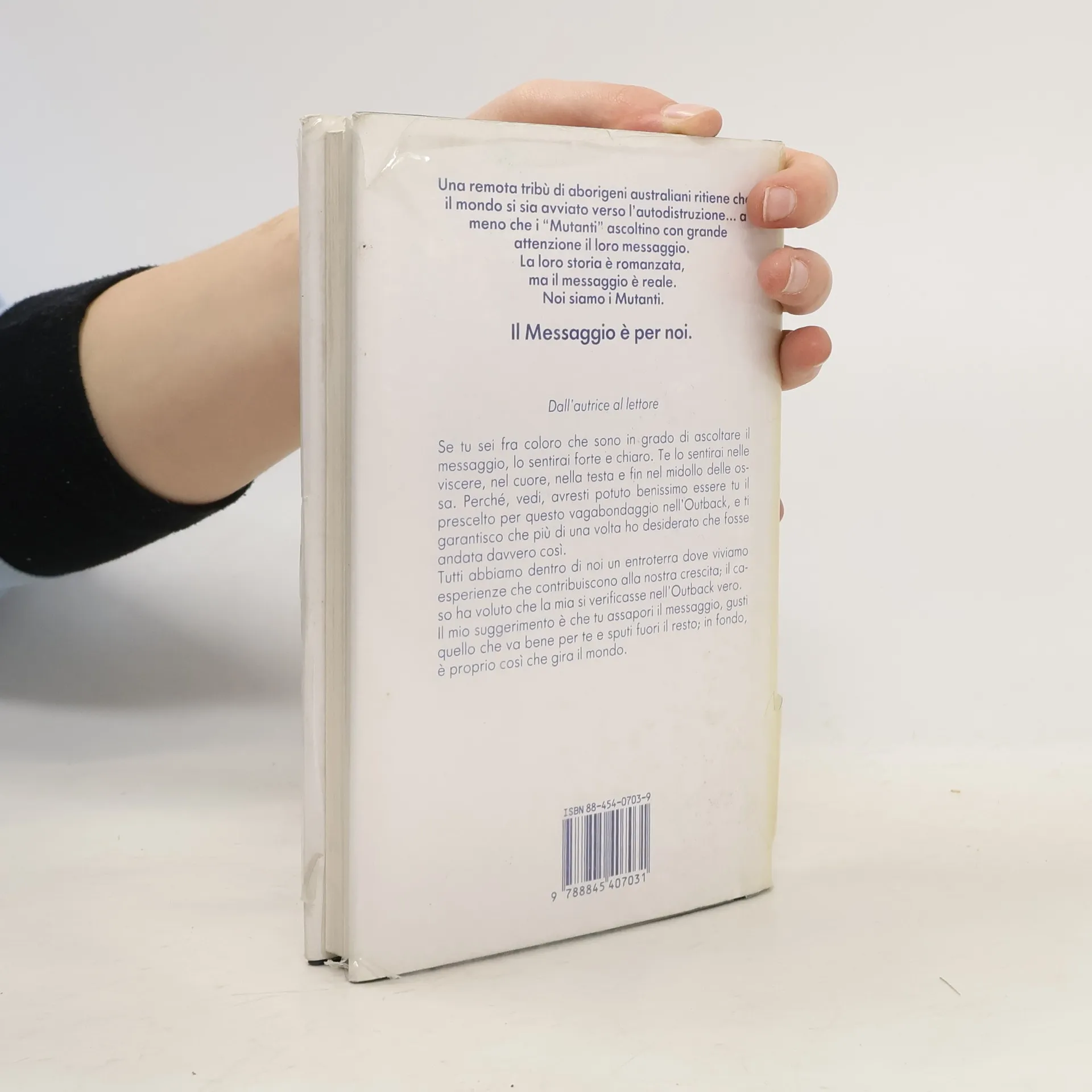 1400 miglia nell'Outback australiano, a piedi nudi, cibandosi di quanto la natura offre, vermi compresi, sotto un sole implacabile. Ma, privata anche del più piccolo agio cui la civiltà ci ha abituati, condividendo la vita quotidiana degli aborigeni, imparando i loro segreti per sopravvivere, Marlo Morgan scopre un altro mondo e un altro modo di essere, in completa armonia con se stessa e con gli altri, e comprende il vero significato della parola esistere.