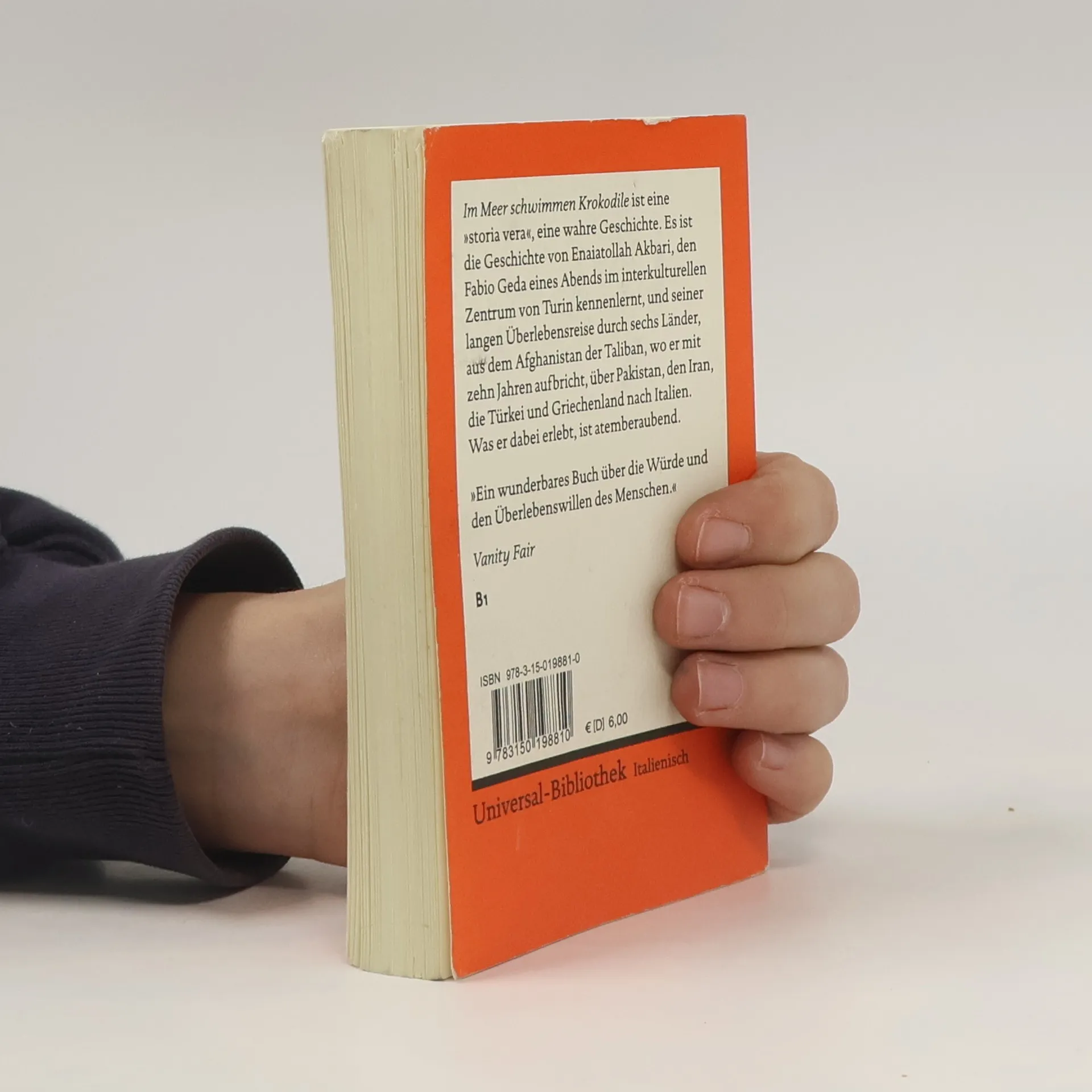 Italienische Literatur in Reclams Roter Reihe: das ist der italienische Originaltext – ungekürzt und unbearbeitet mit Worterklärungen am Fuß jeder Seite, Nachwort und Literaturhinweisen. »Im Meer schwimmen Krokodile« ist eine wahre Geschichte, eine ›storia vera‹. Es ist die Geschichte von Enaiatollah Akbari, den Fabio Geda eines Abends im interkulturellen Zentrum von Turin kennenlernt, und seiner langen Überlebensreise durch sechs Länder, aus dem Afghanistan der Taliban, wo er mit 10 Jahren aufbricht, über Pakistan, den Iran, die Türkei und Griechenland nach Italien. Was er dabei erlebt, ist atemberaubend. Italienische Lektüre: Niveau B1 (GER) Sprachen: Italienisch, Deutsch