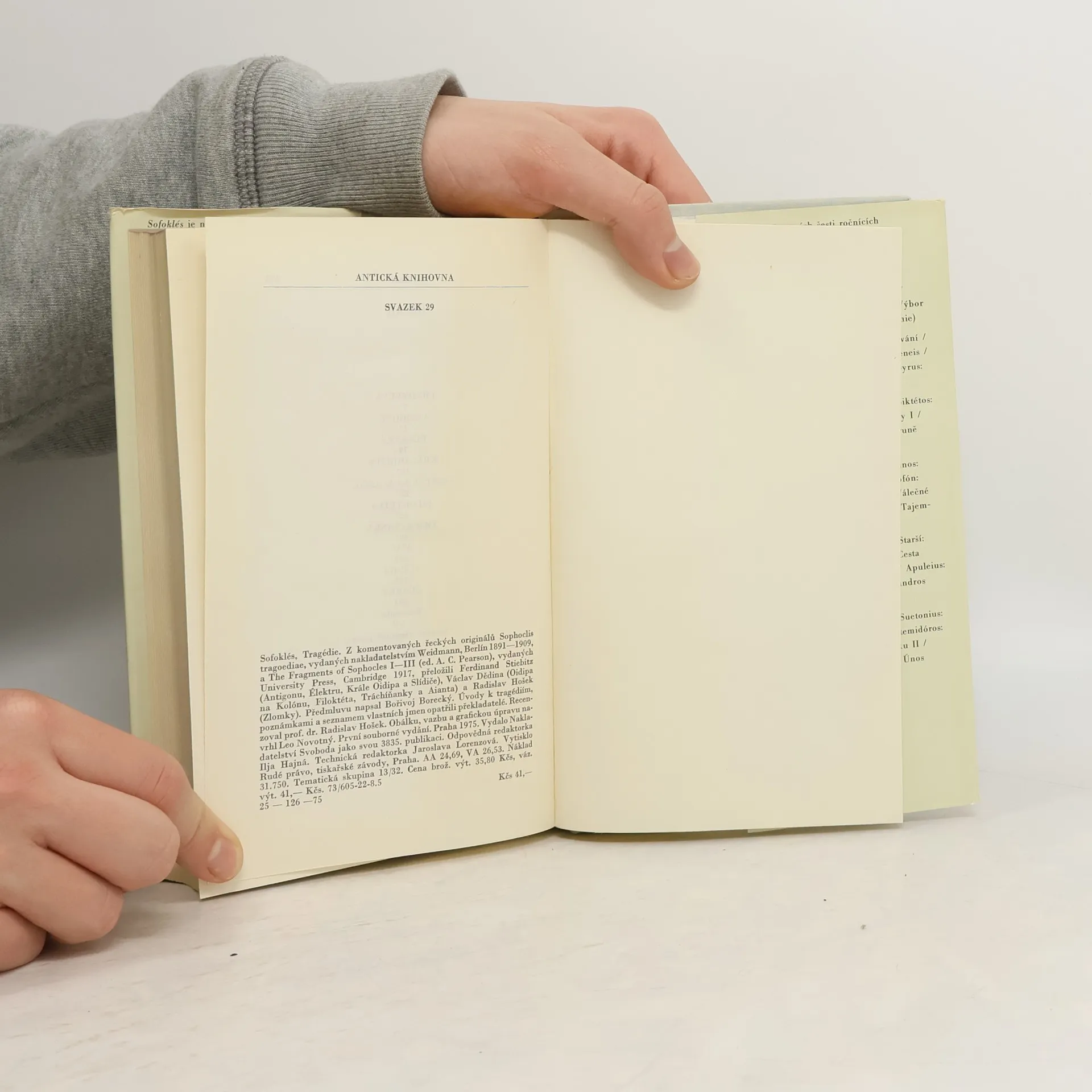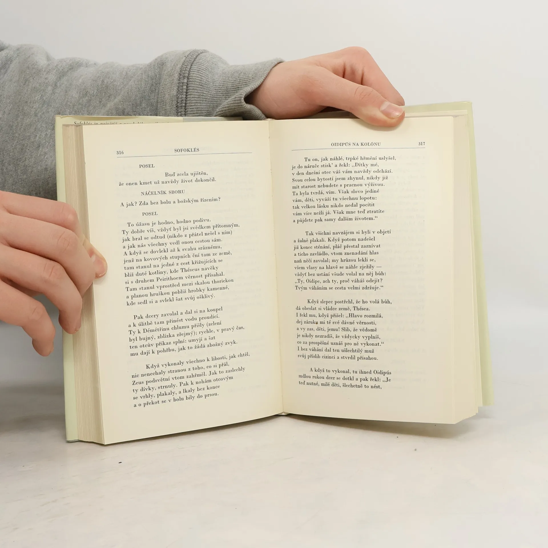 Z jeho díla se zachovalo sedm úplných tragédií a četné zlomky, především ze satyrského dramatu Slídiči, objeveného teprve roku 1912 v egyptských papyrech. Nejmohutnější jsou jeho tragédie z okruhu bájí thébských: Král Oidipús vypravuje na příběhu muže, jenž nevědomky zabil svého otce a žije v manželství s matkou, o nevyhnutelnosti osudu. Oidipús na Kolónu líčí konec jeho strastiplného života a Antigoné zachycuje osudy Oidipovy dcery, která přes zákaz pohřbí svého bratra a pyká za svůj čin smrtí, konflikt svědomí a příkaz otce. Z okruhu bájí homérských čerpal Sofoklés látku k tragédiím Aiás, jež zpracovává dramaticky sebevraždu hrdiny stojícího mravně výš než božstvo, Élektrá, která líčí osud Agamemnonovy dcery Élektry a pomstu Orestovu, a Filoktétés, jež předvádí psychologicky podaný příběh jednoho z homérských hrdinů. Poslední ze zachovaných tragédií, Tráchíňanky, líčí Hérakleovu smrt a jí předcházející rodinný konflikt. Sofoklés jako stále hraný dramatický básník náleží k nesmrtelným postavám světové vzdělanosti a jeho dílo k největšímu kulturnímu odkazu antiky. Souborně vychází v češtině poprvé.