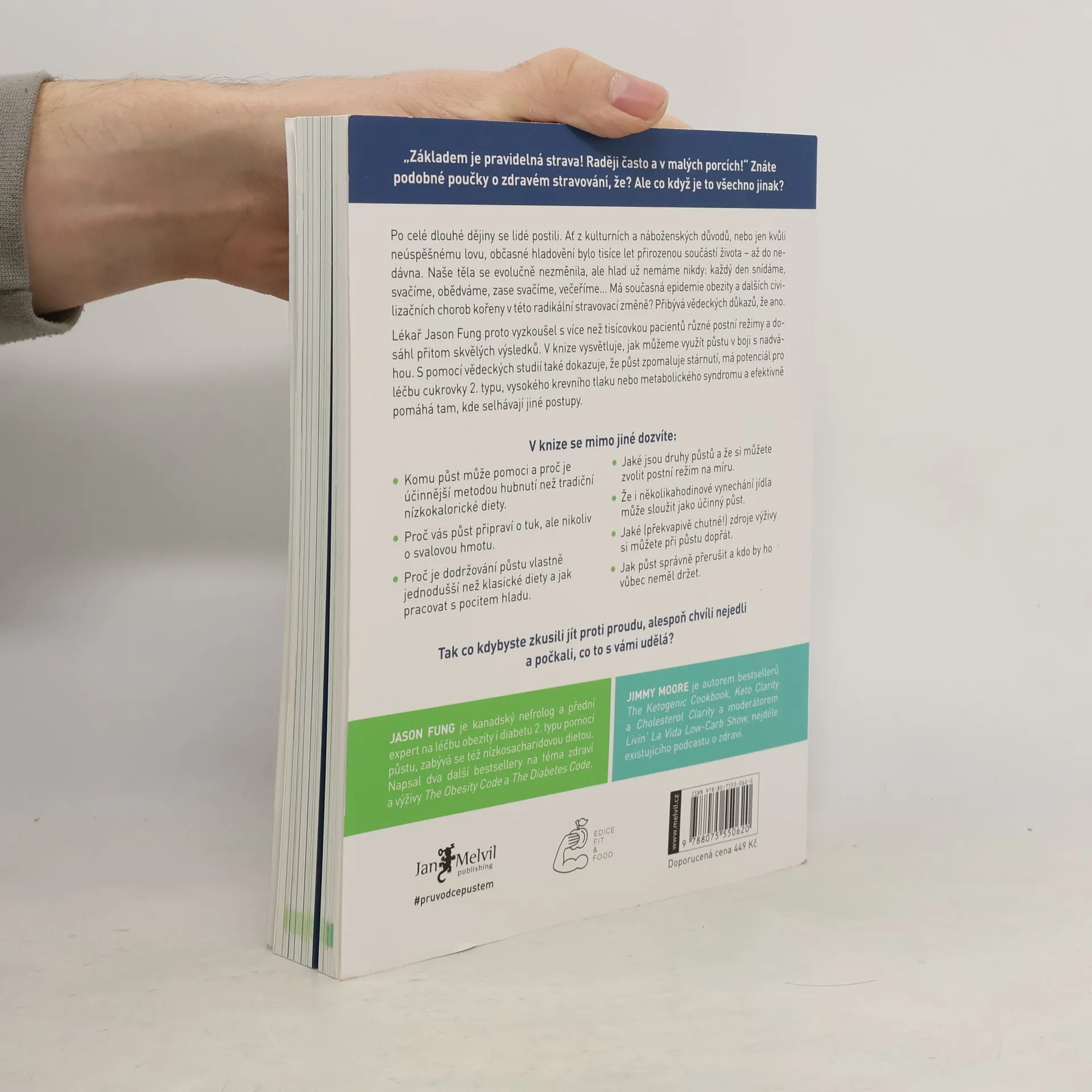 Po celé dějiny se lidé postili z různých důvodů, ať už kulturních, náboženských nebo z nedostatku jídla. Hladovění bylo přirozenou součástí života, ale dnes se stravovací návyky radikálně změnily. Tato změna může být spojena s rostoucími problémy, jako je obezita a další civilizační choroby. Lékař Jason Fung zkoumal různé postní režimy s více než tisícovkou pacientů a dosáhl výjimečných výsledků. Vysvětluje, jak může půst pomoci v boji proti nadváze a přináší vědecké důkazy o jeho prospěšnosti, včetně zpomalení stárnutí a léčby cukrovky 2. typu, vysokého krevního tlaku či metabolického syndromu. Zjistíte, komu půst může pomoci a proč je efektivnější než tradiční diety. Půst vás zbaví tuku, nikoli svalové hmoty, a je jednodušší než dodržování klasických diet. Seznámíte se s různými typy půstů a možností zvolit si režim na míru. I několikahodinové vynechání jídla může být účinné. Kniha také nabízí překvapivé a chutné zdroje výživy během půstu a rady, jak ho správně přerušit. Zjistíte, kdo by měl půst vynechat. Co kdybyste zkusili jít proti proudu a na chvíli se zdrželi jídla?