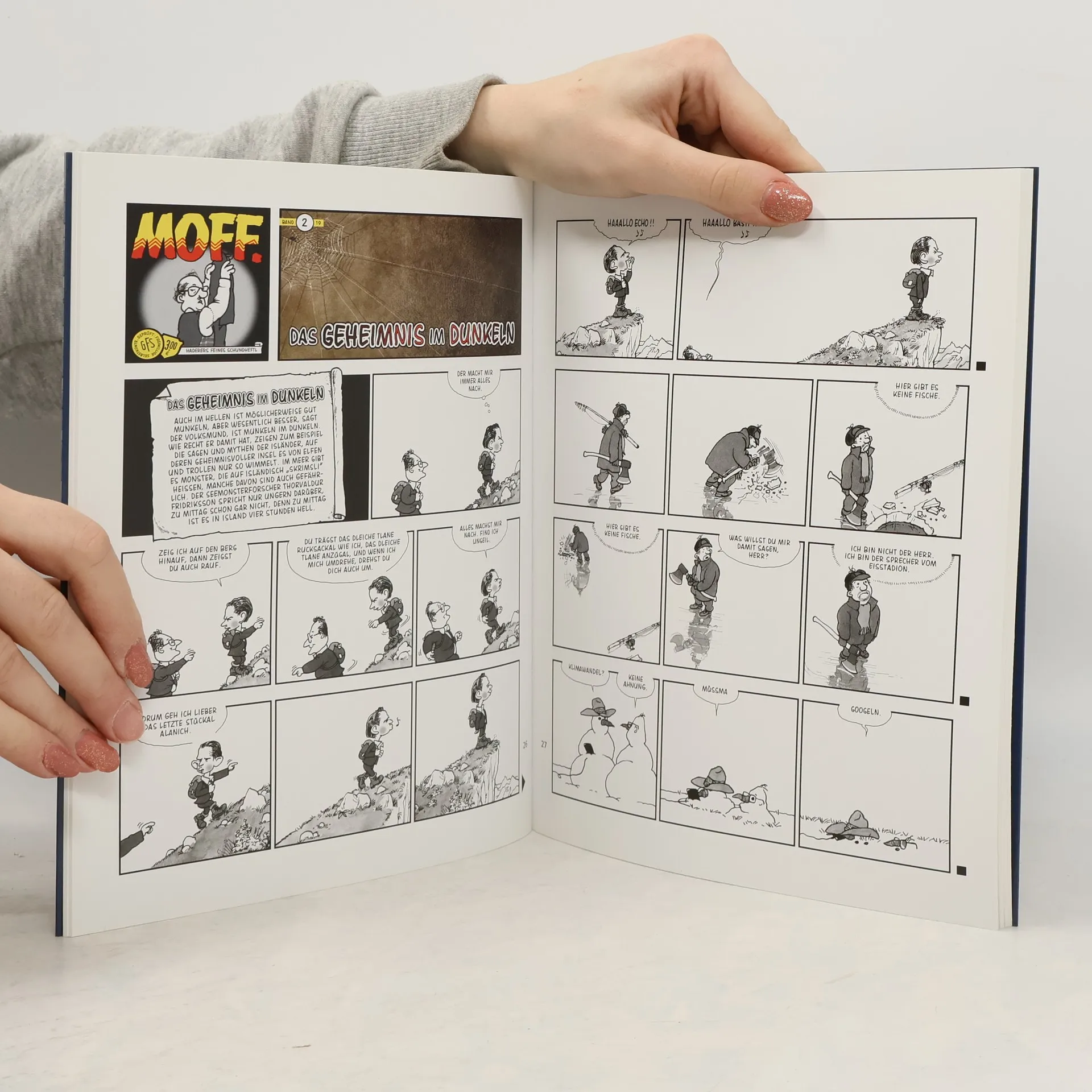 Sind das nicht wunderschöne Aussichten beim Hotel Seeblick? Bessere bietet das neue Haderer Jahrbuch. Es versammelt die besten Arbeiten des Künstlers aus dem Jahr 2019. Haderer zeigt uns darin romantische Urlaubsziele wie jene am Cover, Österreichische Nationalsymbole, Zeichnungen zum Frauenwahlrecht oder zu #fridaysforfuture. Kurz gesagt: erstklassige Cartoons und Bildgeschichten aus seinem Comic MOFF.