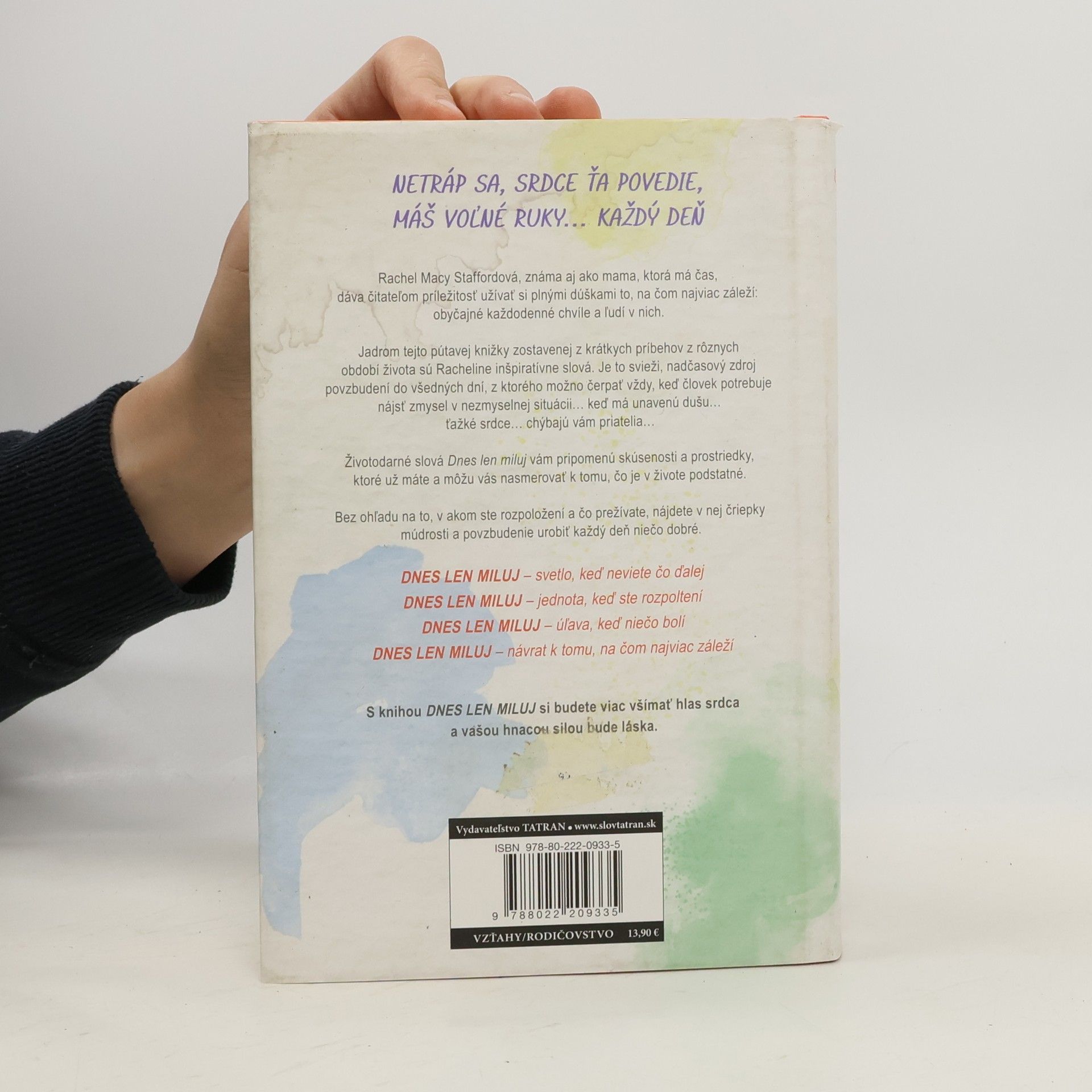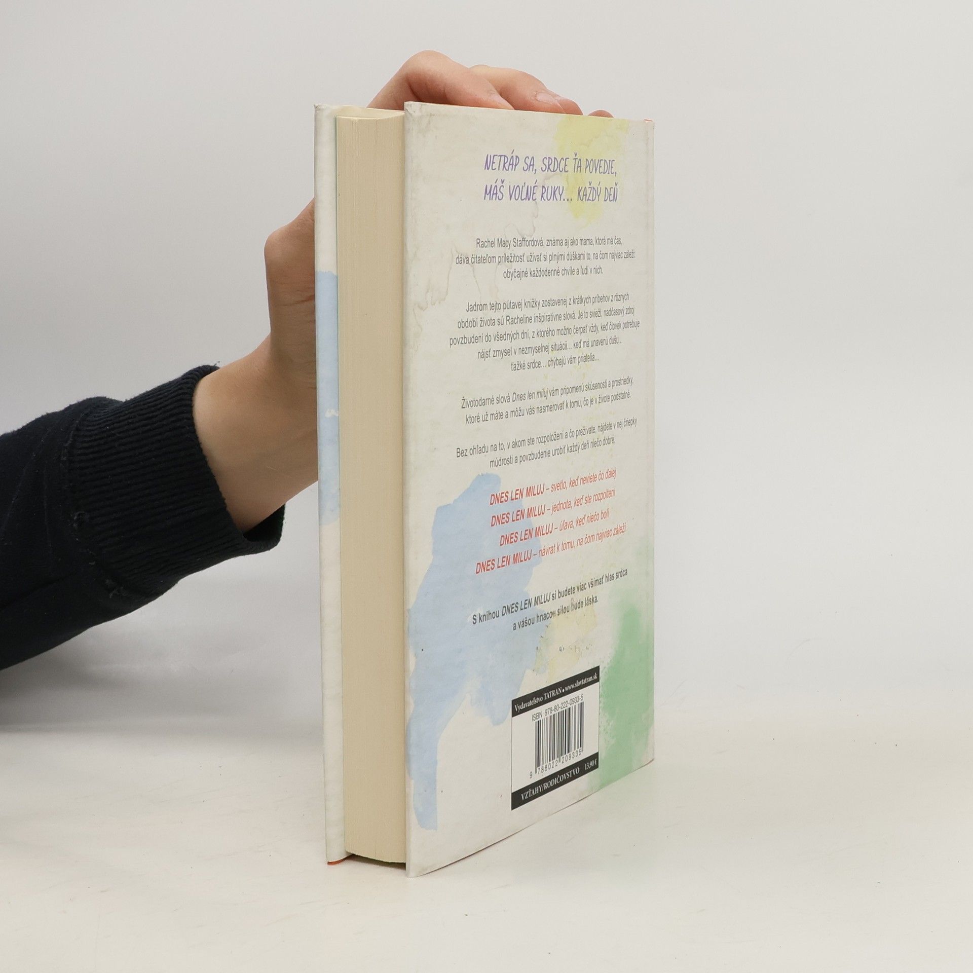 Rachel Macy Staffordová, úspešná blogerka a autorka článkov v mienkotvorných médiách, v knižke Dnes len miluj povzbudzuje čitateľa, aby si život a svojich blízkych užíval plnými dúškami. Pre naplnený život je dôležité prosté každodenné prežívanie a radosť z prítomného dňa, čomu mnohí z nás v návale pracovného stresu neprikladajú až takú dôležitosť. Autorka radí čitateľom, aby sa zamerali na to, na čom im najviac záleží. Dnešná doba vyžaduje od každého jedinca perfekcionizmus, neustále náhlenie a schopnosť robiť takmer desať vecí naraz. Vyberáme si výkonnosť, rozptýlenie a efektivitu na úkor emócií, budovania vzťahov, osobného rastu a starostlivosti. Rachel zdôrazňuje, že netreba plytvať časom a neuvážene brať na svoje plecia požiadavky iných. Treba odmietať vyčerpávajúce spoločenské stretnutia a prestať sa zaoberať nepríjemnými ľuďmi. Pomôže nám to zbaviť sa prílišnej zaneprázdnenosti, večnej únavy, nadmerného stresu a roztržitosti. Dnes len miluj – tieto tri slová majú silu oživiť srdce... váš domov... vzťah... vaše sny... i tento vzácny deň, deň od Boha – deň, čo máte pred sebou. Opakujte si tieto slová, keď vám vnútorná bolesť bráni milovať dnešný deň a seba samých, pretože sebakritizujúca a zahanbujúca taktika vás nijako neposúva vpred. Máte príliš veľkú cenu a hodnotu, aby ste boli na poslednom mieste v zozname vlastných priorít.