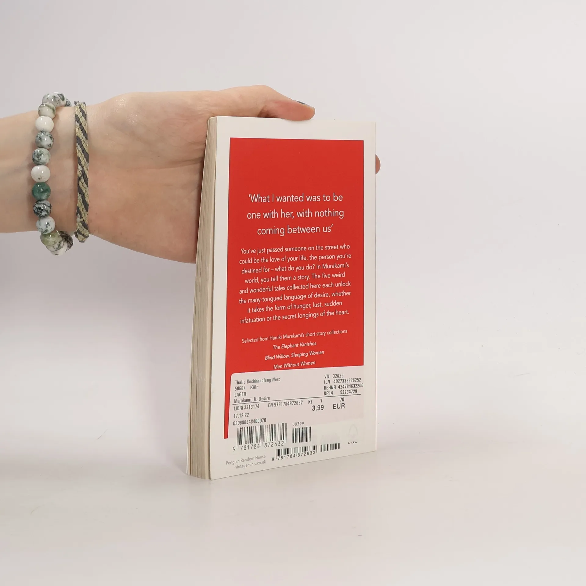 You've just passed someone on the street who could be the love of your life, the person you're destined for - what do you do? In Murakami's world, you tell them a story. The five weird and wonderful tales collected here each unlock the many-tongued language of desire, whether it takes the form of hunger, lust, sudden infatuation or the secret longings of the heart. Selected from Haruki's Murakami's short story collections The Elephant Vanishes, Blind Willow Sleeping Woman, Men Without Women VINTAGE MINIS- GREAT MINDS. BIG IDEAS. LITTLE BOOKS. A series of short books by the world's greatest writers on the experiences that make us human Also in the Vintage Minis series- Love by Jeanette Winterson Psychedelics by Aldous Huxley Eating by Nigella Lawson Summer by Laurie Lee