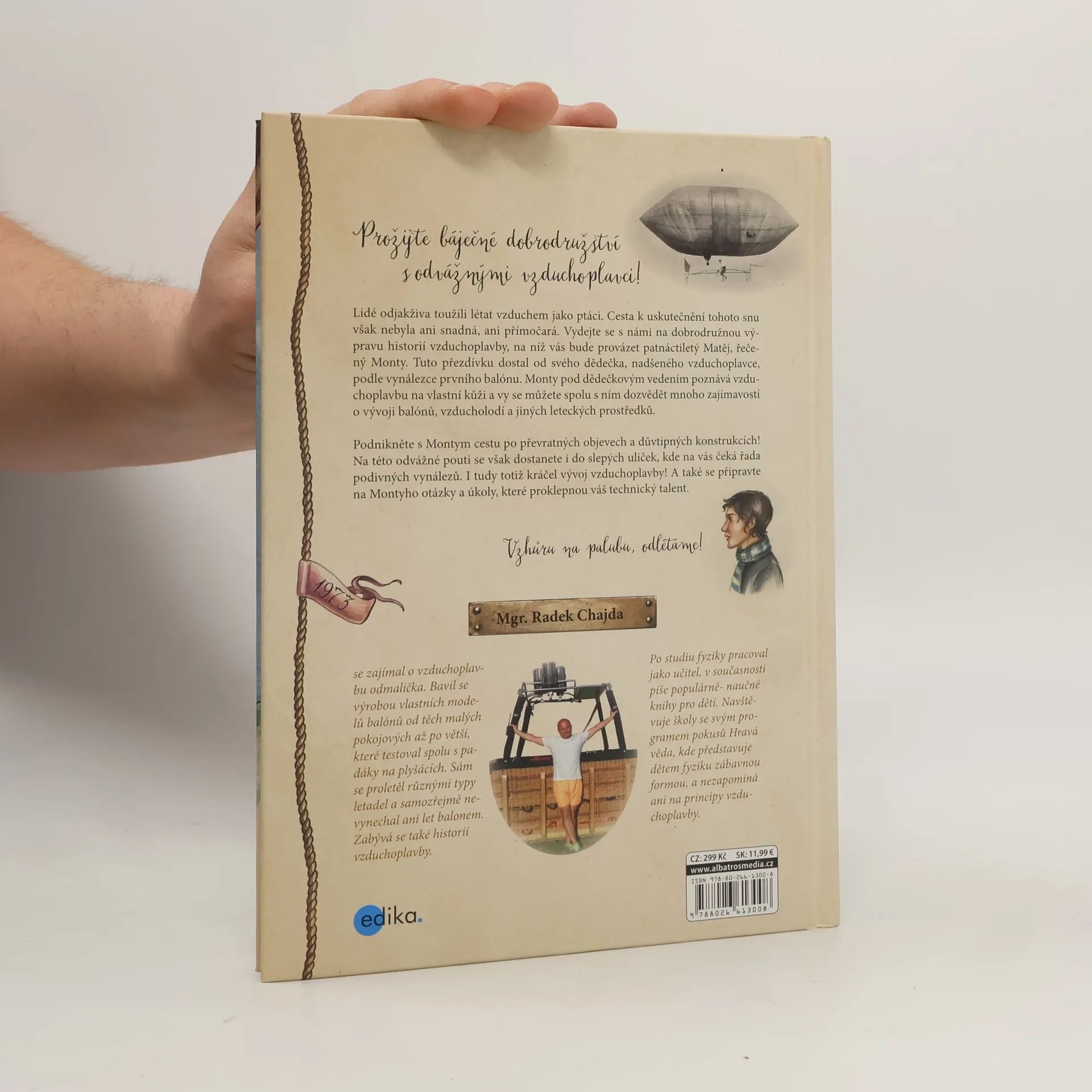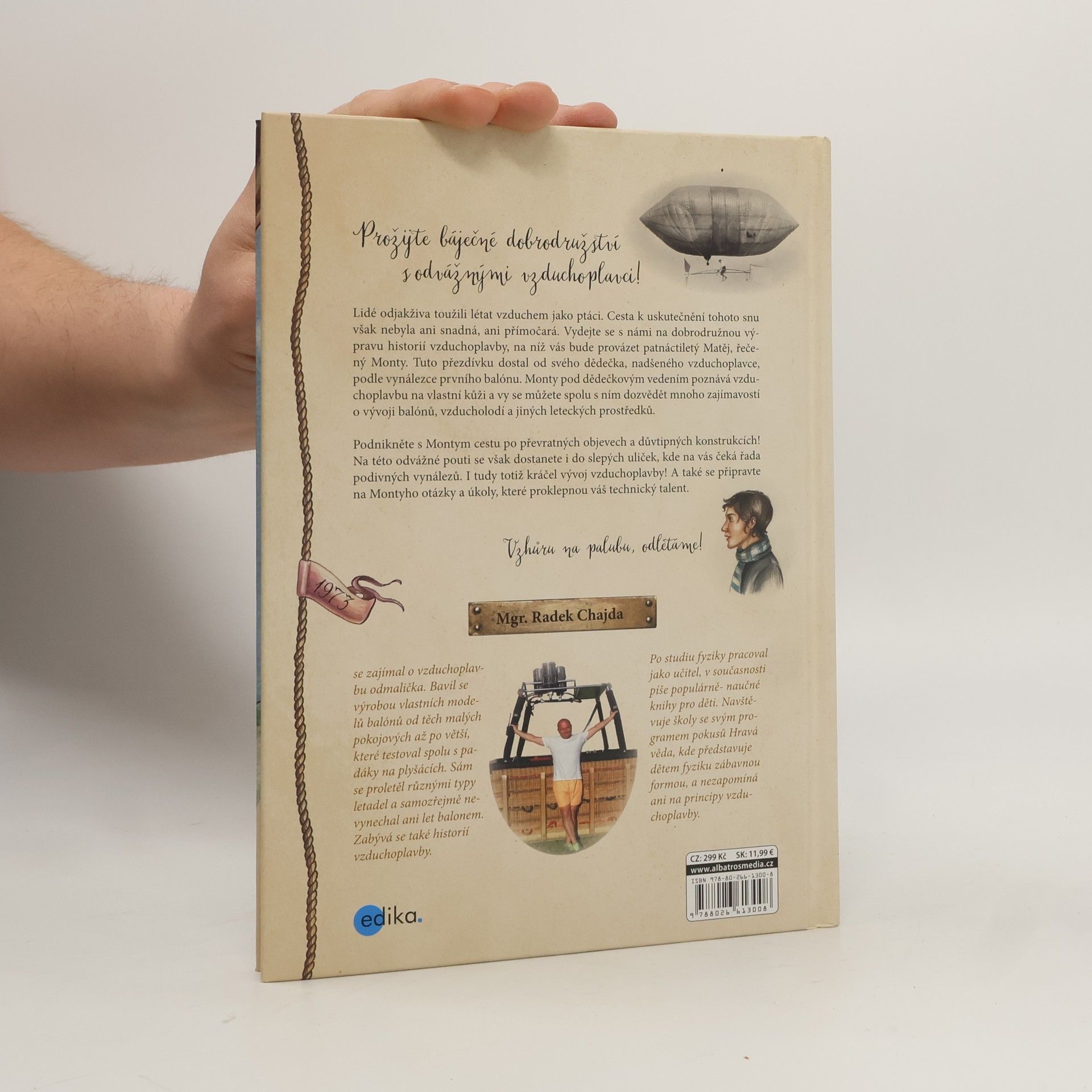 Prožijte báječné dobrodružství s odvážnými vzduchoplavci! Lidé odjakživa toužili létat vzduchem jako ptáci. Cesta k uskutečnění tohoto snu však nebyla ani snadná, ani přímočará. Vydejte se s námi na dobrodružnou výpravu historií vzduchoplavby, na níž vás bude provázet patnáctiletý Matěj, řečený Monty. Tuto přezdívku dostal od svého dědečka, nadšeného vzduchoplavce, podle vynálezce prvního balónu. Monty pod dědečkovým vedením poznává vzduchoplavbu na vlastní kůži a vy se můžete spolu s ním dozvědět mnoho zajímavostí o vývoji balónů, vzducholodí a jiných leteckých prostředků. Podnikněte s Montym cestu po převratných objevech a důvtipných konstrukcích! Na této odvážné pouti se však dostanete i do slepých uliček, kde na vás čeká řada podivných vynálezů. I tudy totiž kráčel vývoj vzduchoplavby! A také se připravte na Montyho otázky a úkoly, které proklepnou váš technický talent. Vzhůru na palubu, odlétáme!