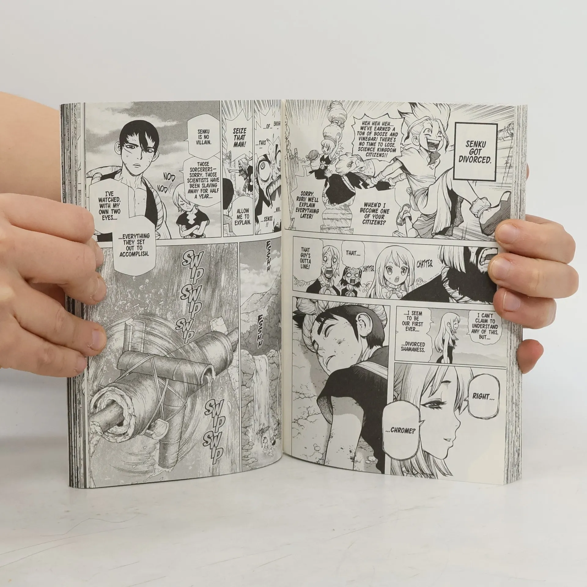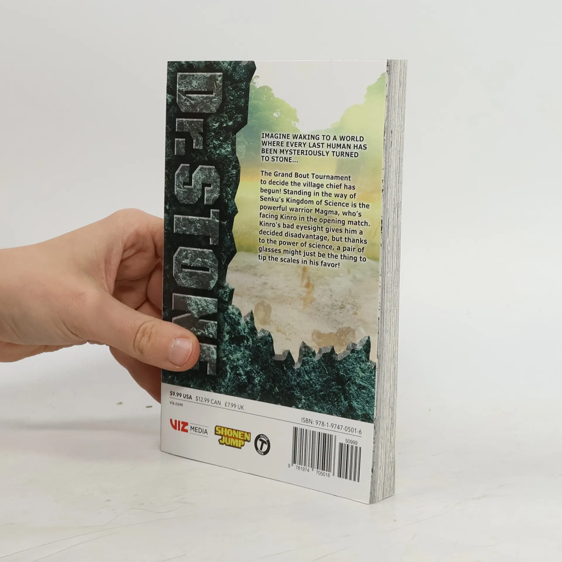 Imagine waking to a world where every last human has been mysteriously turned to stone... One fateful day, all of humanity turned to stone. Many millennia later, Taiju frees himself from the petrification and finds himself surrounded by statues. The situation looks grim-until he runs into his science-loving friend Senku! Together they plan to restart civilization with the power of science! The Grand Bout has begun! For Senku's Kingdom of Science to succeed, they need to win, but standing in their way is the ferocious and powerful Magma! Kinro's first up against him, but his bad eyesight severely handicaps him. A pair of science eyes might be just the thing to turn this battle around!
