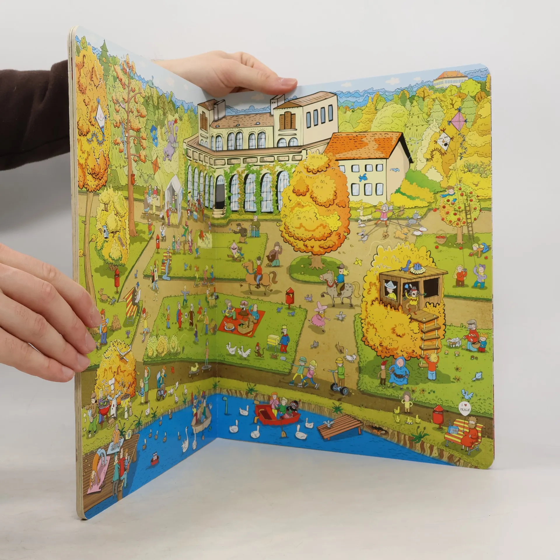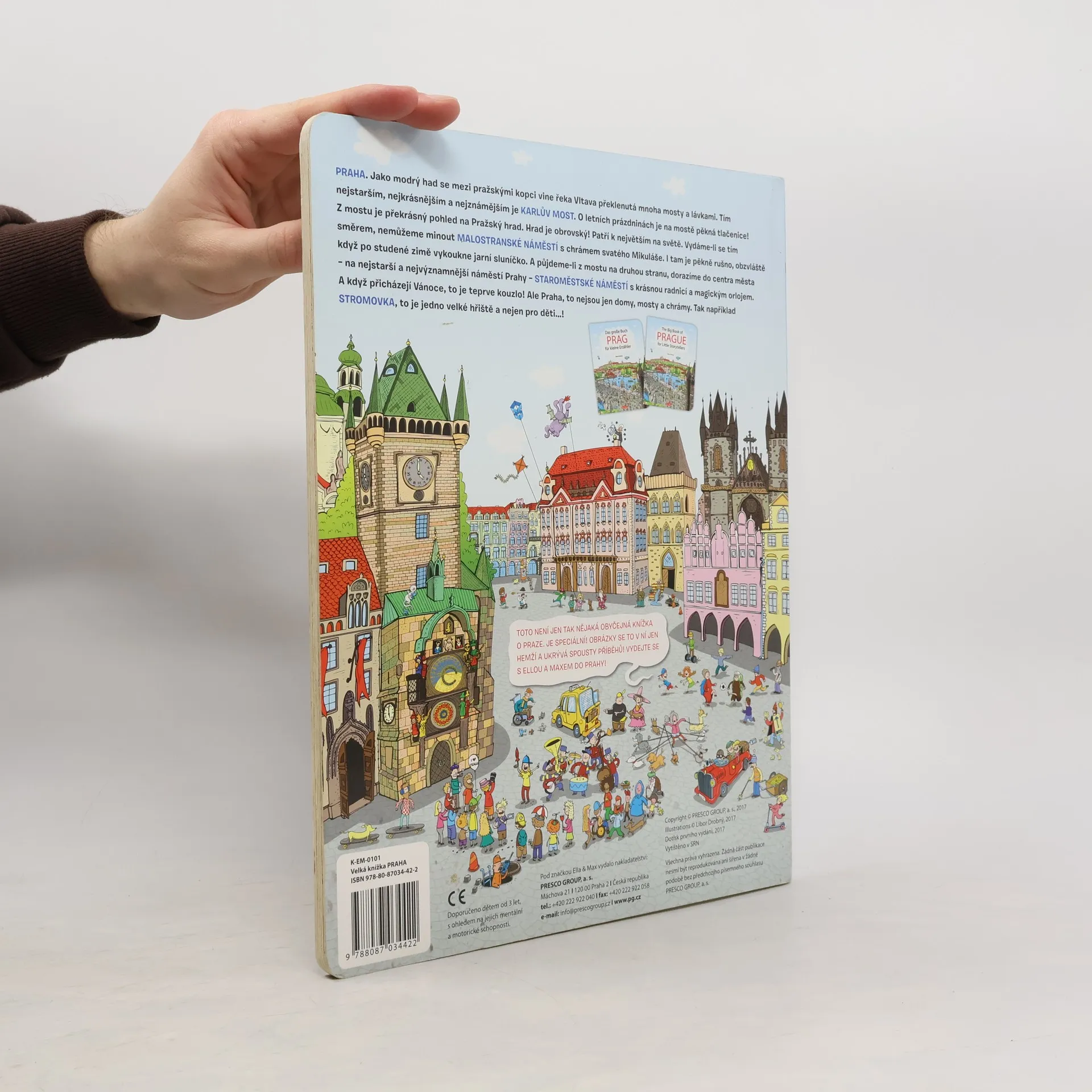 Knihy, ve kterých se to obrázky jen hemží - ukrývají spousty příběhů! Oblíbený a osvědčený základní "stavební kámen" každé dětské knihovničky. Ještě neumíte číst písmenka? Obrázky však umíte "číst" určitě! Velká knížka PRAHA. Jako modrý had se mezi pražskými kopci vine řeka Vltava překlenutá mnoha mosty a lávkami. Tím nejstarším, nejkrásnějším a nejznámějším je KARLŮV MOST. O letních prázdninách je na mostě pěkná tlačenice! Z mostu je překrásný pohled na Pražský hrad. Hrad je obrovský! Patří k největším na světě. Vydáme-li se tím směrem, nemůžeme minout MALOSTRANSKÉ NÁMĚSTÍ s chrámem svatého Mikuláše. I tam je pěkně rušno, obzvláště když po studené zimě vykoukne jarní sluníčko. A půjdeme-li z mostu na druhou stranu, dorazíme do centra města – na nejstarší a nejvýznamnější náměstí Prahy – STAROMĚSTSKÉ NÁMĚSTÍ s krásnou radnicí a magickým orlojem. A když přicházejí Vánoce, to je teprve kouzlo! Ale Praha, to nejsou jen domy, mosty a chrámy. Tak například STROMOVKA, to je jedno velké hřiště a nejen pro děti...!