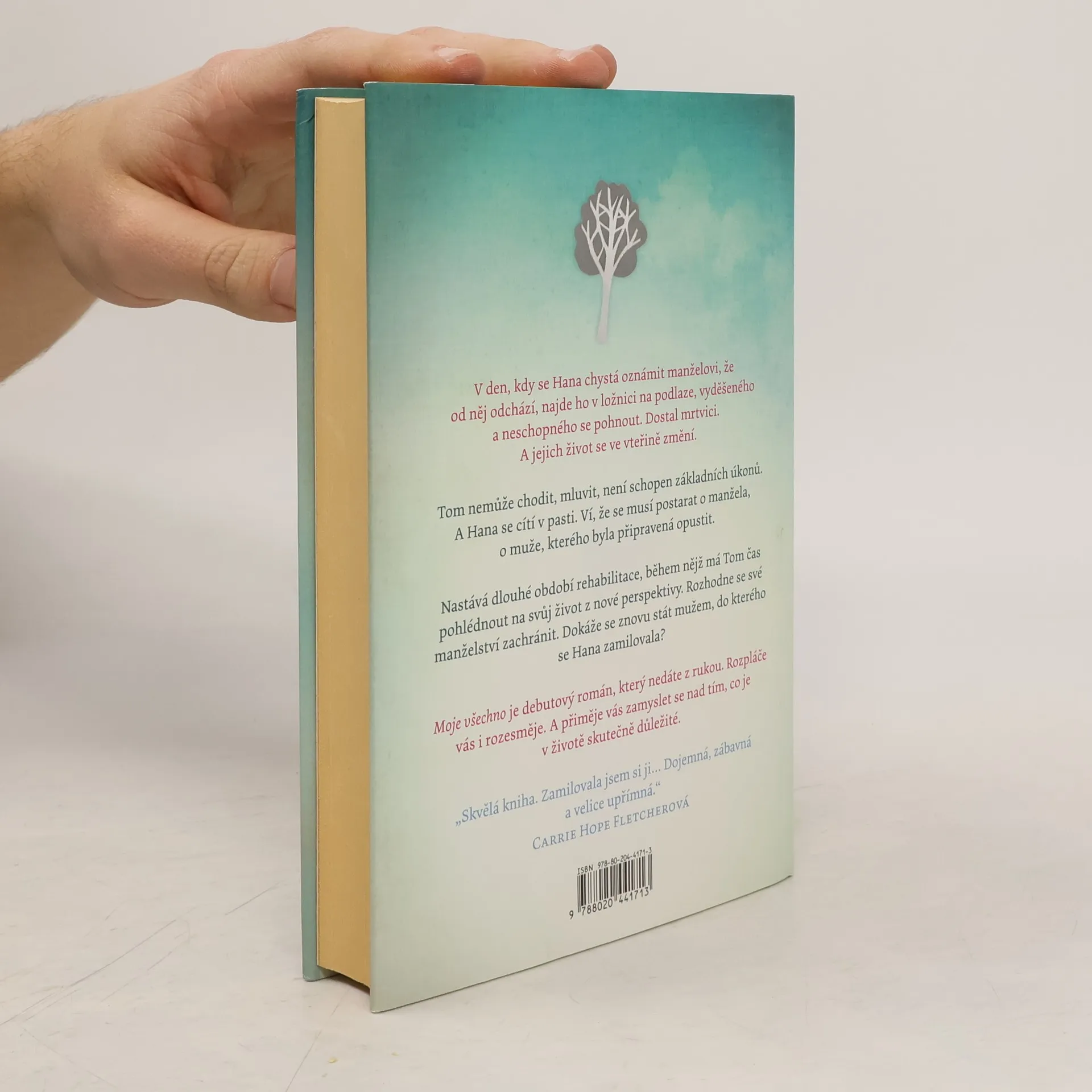 V den, kdy se Hana chystá oznámit manželovi, že od něj odchází, ho najde v ložnici na podlaze, vyděšeného a neschopného se pohnout. Dostal mrtvici. A jejich život se ve vteřině změní. Haně nezbývá než odložit všechny své plány, aby se mohla starat o manžela, kterého byla připravená opustit. Tom nemůže chodit, není schopen základních úkonů. Po měsících vzájemného zanedbávání a partnerského odcizení nastává dlouhé období rehabilitace, během nichž má Tom čas pohlédnout na svůj život z nové perspektivy, aby ho mohl přehodnotit. Podaří se Tomovi překonat nemoc a zachránit manželství? A dokáže se Hana vzdát svých plánů na nový život a znovu se do Toma zamilovat? Moje všechno je debutový román, který nedáte z rukou. Rozpláče vás i rozesměje. A přiměje vás zamyslet se nad tím, co je v životě skutečně důležité.