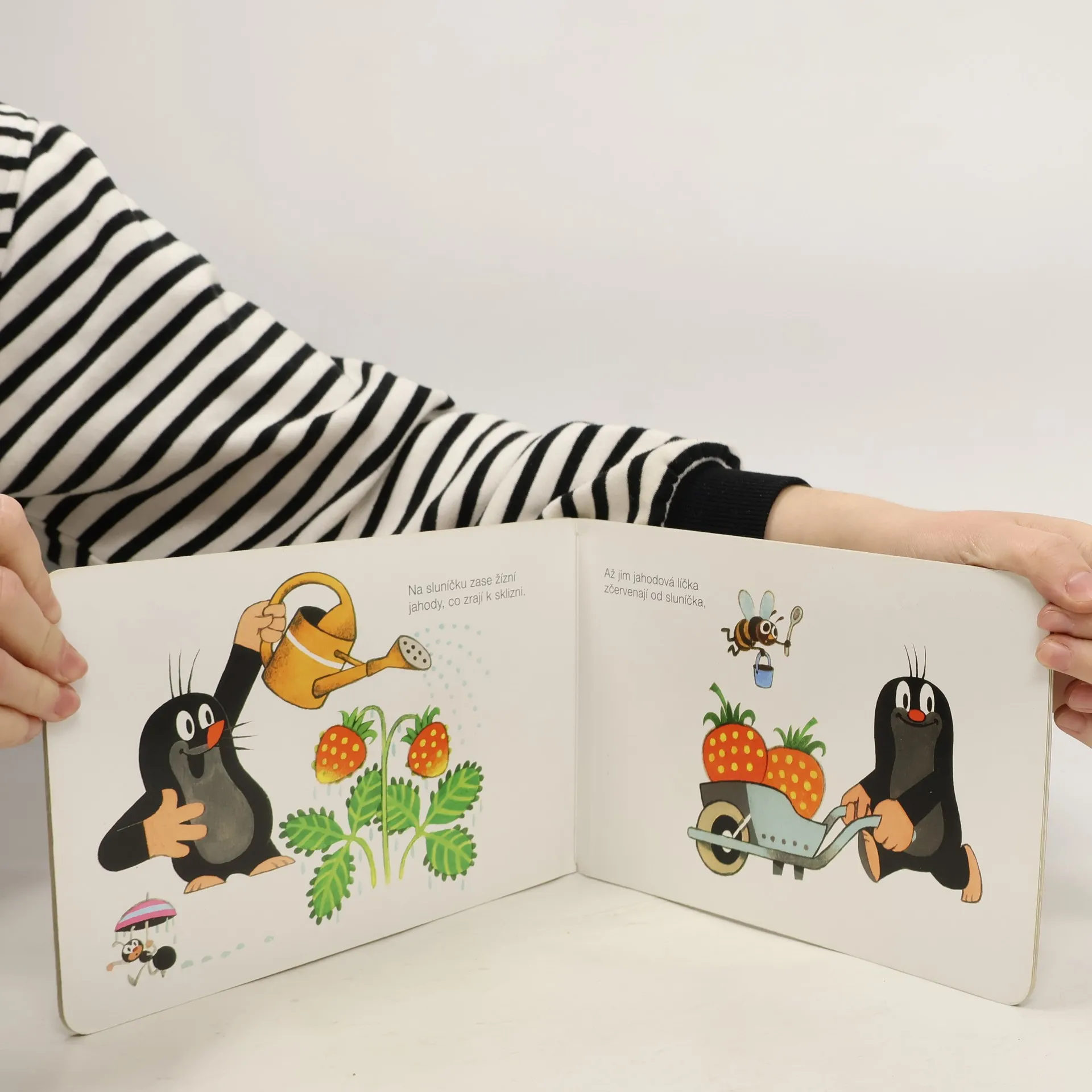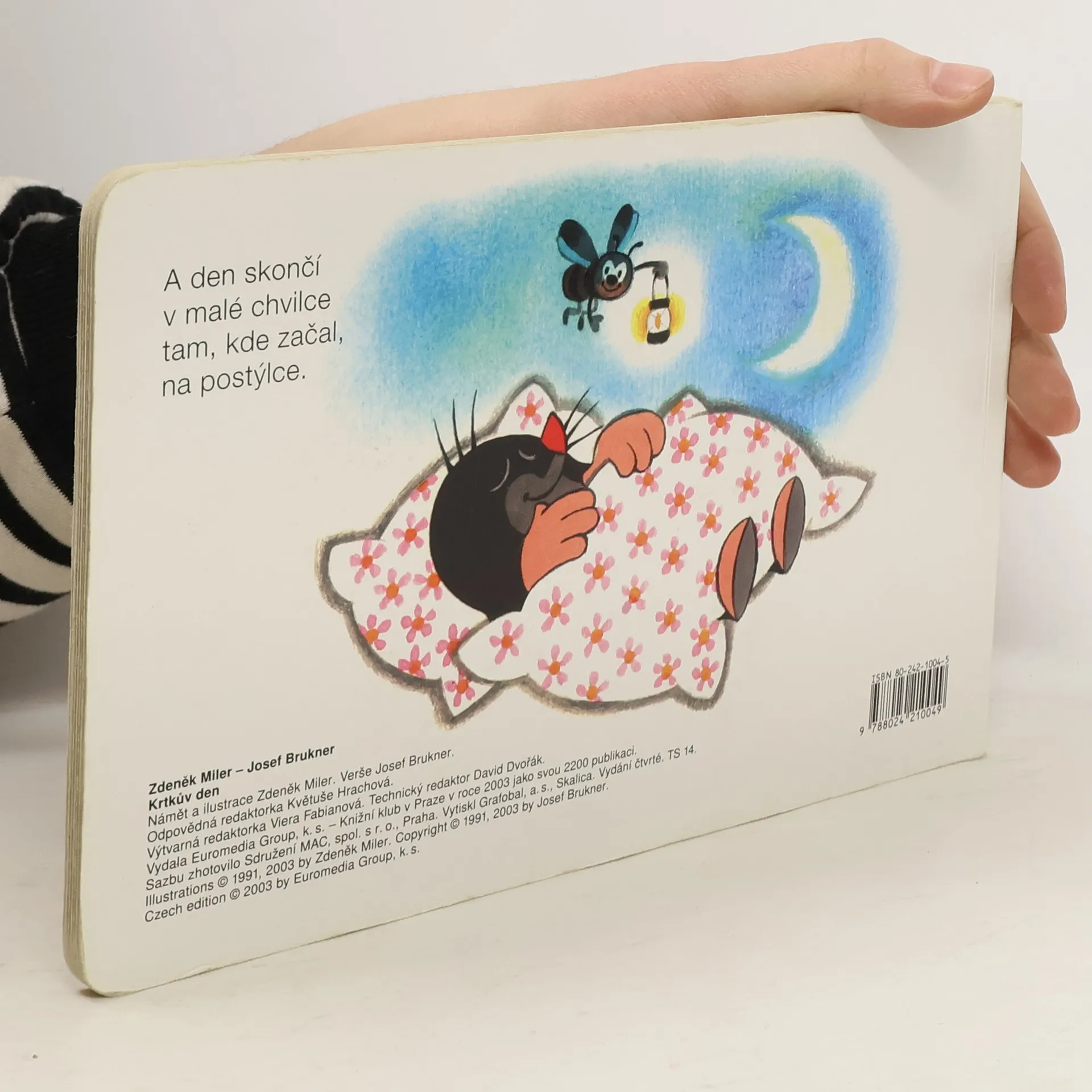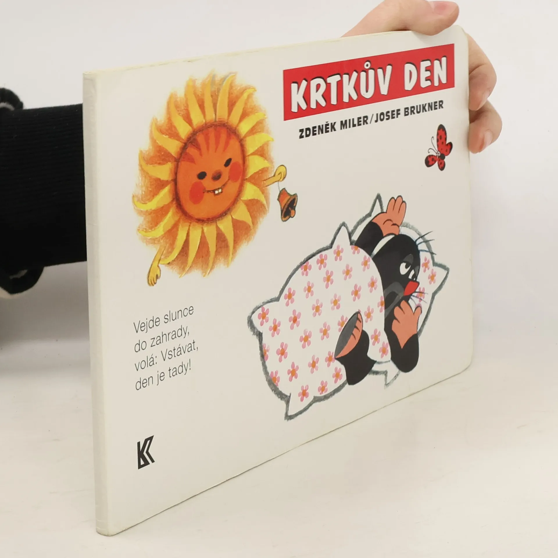Krtka probudilo sluníčko. Bude pěkný den, a tak ho stráví na zahradě. Posnídá mrkvičku a do práce. Čekají na něj sladké jahůdky. Po dobrém obědě si odpočine, vykoupe se v rybníčku a večer znovu do postýlky. Klasické dvanáctistránkové leporelo pro nejmenší. Ilustrace Zdeňka Milera provázejí půvabné verše Josefa Bruknera.