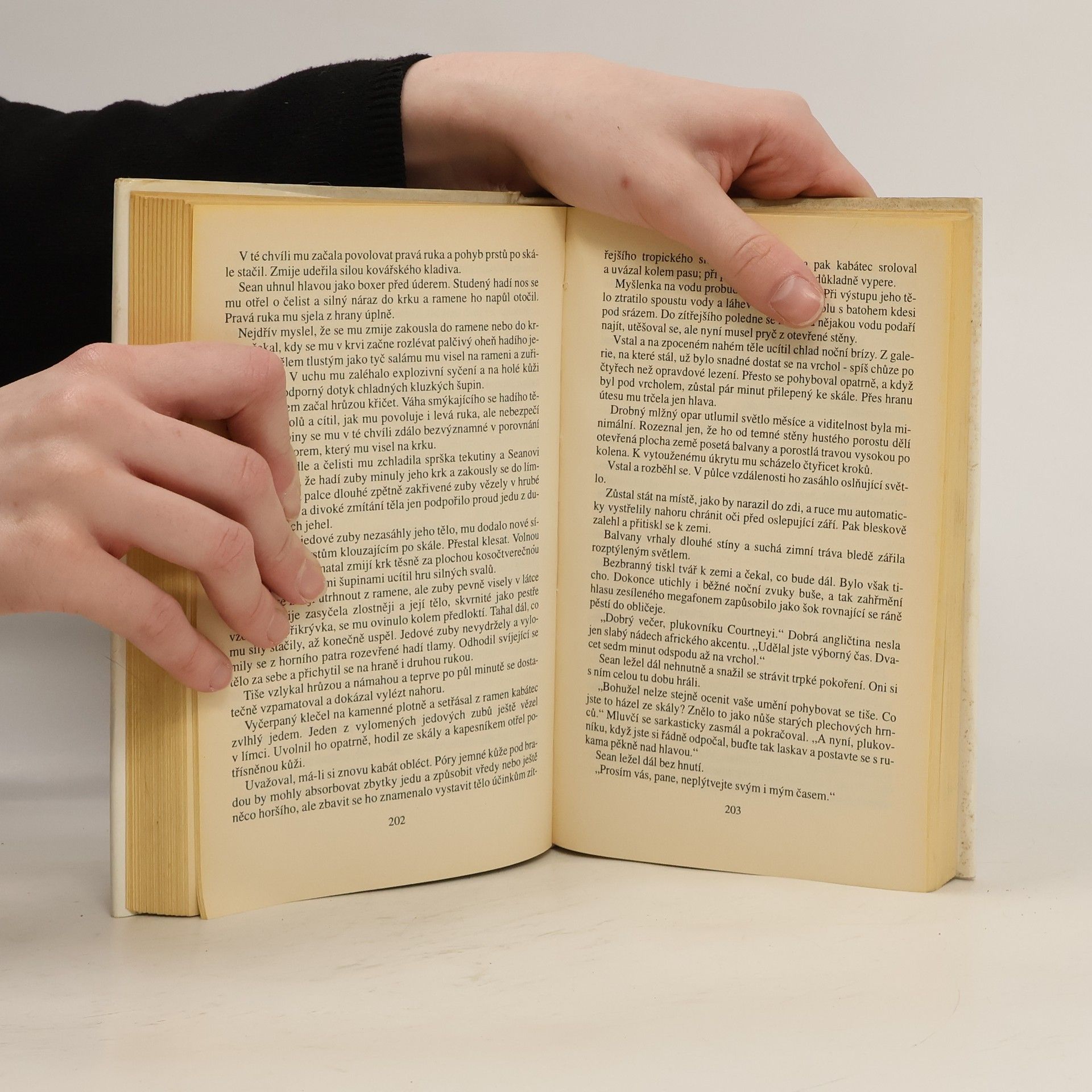 Napínavý dobrodružný román se odehrává v divoké přírodě současné Afriky, kde do osudu hrdinů zasáhne i občanská válka v Mosambiku. Tři hrdinové, profesionální lovec, bohatý zákazník a jeho dcera, podnikají safari v jednom z povolených loveckých území v Zimbabwe. Trojice, která pronásleduje starého sloního samce, se dostane přes hranice do Mosambiku, kde probíhá nepřehledná a krutá občanská válka. Zákazník při lovu zahyne a zbylá dvojice se svými domorodými průvodci upadne do zajetí povstalců, s nimiž musí absolvovat strastiplnou cestu napříč vzbouřenou zemí. Pro oba je to nejen zkouška fyzické zdatnosti, ale i zkouška vzájemného vztahu. 1. vydání
