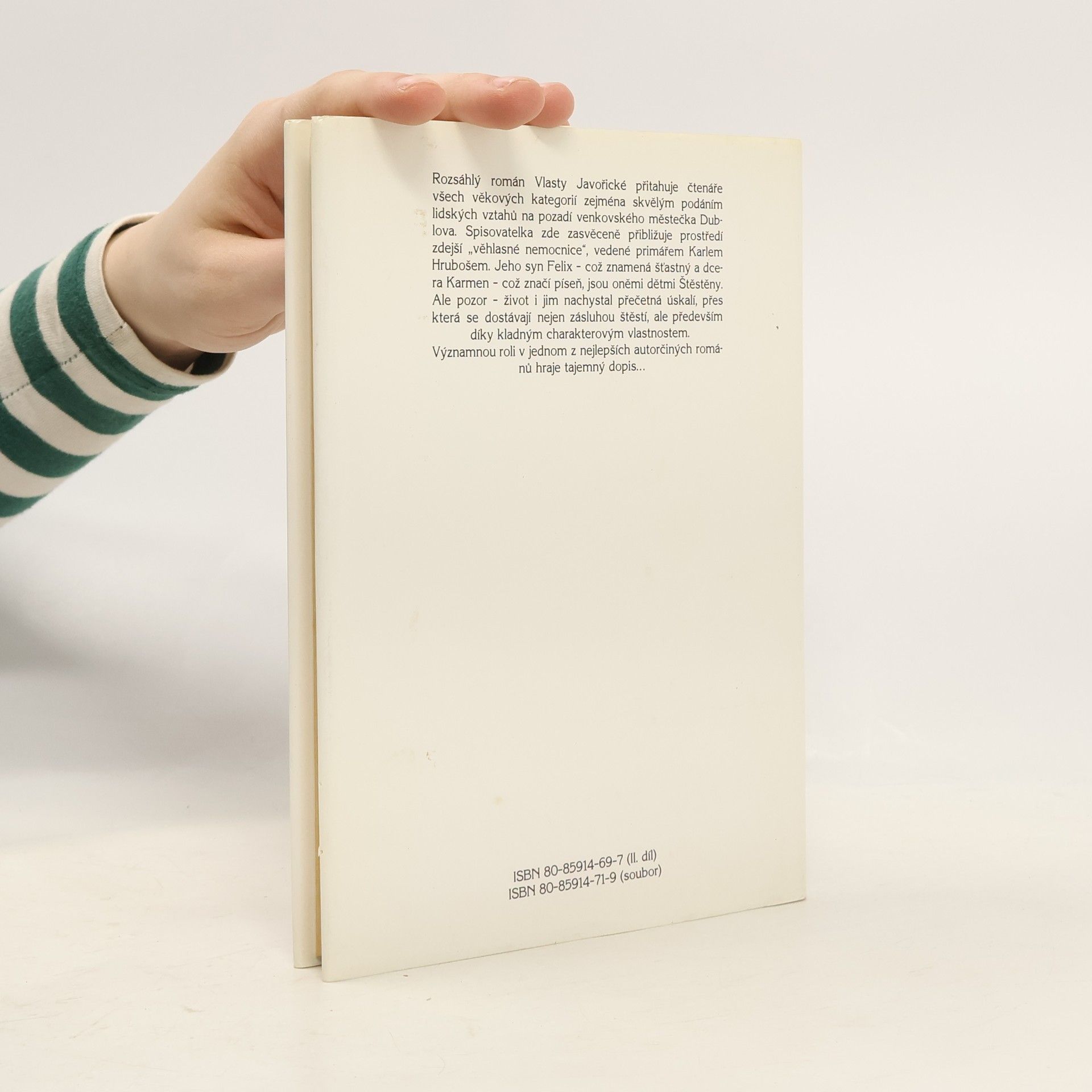 Rozsáhlý román Vlasty Javořické přitahuje čtenáře všech věkových kategorií zejména skvělým podáním lidských vztahů na pozadí venkovského městečka Dublova. Spisovatelka zde zasvěceně přibližuje prostředí zdejší věhlasné nemocnice, vedené primářem Karlem Hrubošem. Jeho syn Felix - což znamená šťastný - a dcera Karmen - což značí píseň, jsou oněmi dětmi Štěstěny. Ale pozor - i jim život nachystal přečetná úskalí, přes která se dostávají nejen zásluhou štěstí, ale především díky kladným charakterovým vlastnostem. Významnou roli v jednom z nejlepších autorčiných románů hraje tajemný dopis.