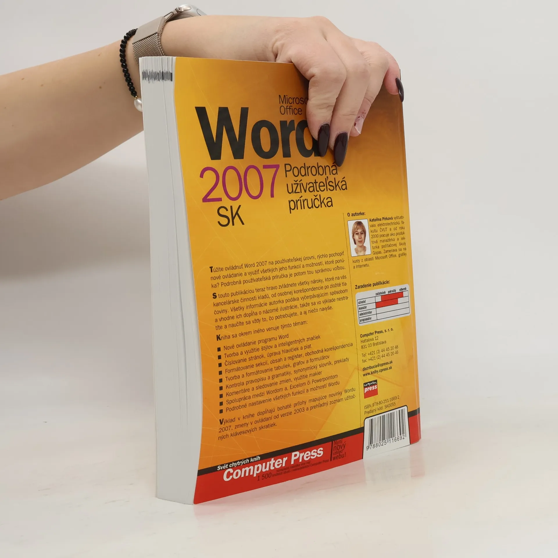 Túžite ovládať Word 2007 na užívateľskej úrovni, rýchlo pochopiť nové ovládanie a využiť všetky jeho funkcie a možnosti, ktoré ponúka? Podrobná užívateľská príručka je potom tou správnou voľbou. S touto publikáciou teraz hravo zvládnete všetky nároky, ktoré na vás kancelárske činnosti kladú, od osobnej korešpondencie po zložité tlačoviny. Všetky informácie autorka podáva vyčerpávajúcim spôsobom a vhodne ich dopĺňa o názorné ilustrácie, takže sa vo výklade nestratíte a naučíte sa vždy to, čo potrebujete, a aj niečo navyše. Kniha sa okrem iného venuje týmto témam: Nové ovládanie programu Word Tvorba a využítie štýlov a inteligentných značiek Číslovanie stránok, úprava hlavičiek a piat Formátovanie sekcií, obsah a register, obchodná korešpondencia Tvorba a formátovanie tabuliek, grafov a formulárov Kontrola pravopisu a gramatiky, synonymický slovník, preklady Komentáre a sledovanie zmien, využitie makier Spolupráca medzi Wordom a Excelom či Powerpointom Výklad v knihe dopĺňajú bohaté prílohy mapujúce novinky Wordu 2007, zmeny v ovládaní od verzie 2003 a prehľadný zoznam užitočných klávesových skratiek.