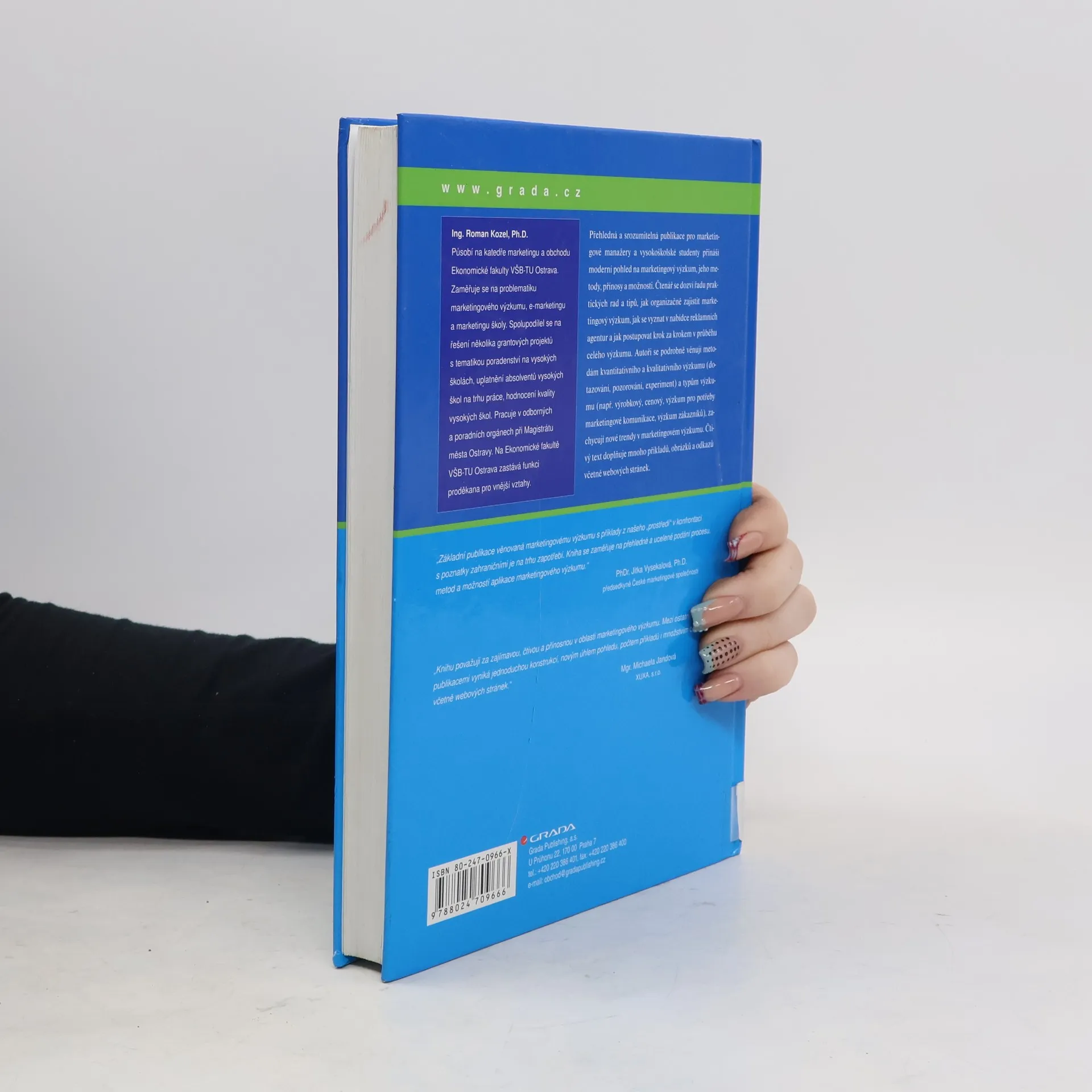 Přehledná a srozumitelná publikace pro marketingové manažery a vysokoškolské studenty přináší moderní pohled na marketingový výzkum, jeho metody, přínosy a možnosti. Čtenář se dozví řadu praktických rad a tipů, jak organizačně zajistit marketingový výzkum, jak se vyznat v nabídce reklamních agentur a jak postupovat krok za krokem v průběhu celého výzkumu. Autoři se podrobně věnují metodám kvantitativního a kvalitativního výzkumu (dotazování, pozorování, experiment) a typům výzkumu (např. výrobkový výzkum, cenový výzkumu, výzkum pro potřeby marketingové komunikace, výzkum zákazníků), zachycují nové trendy v marketingovém výzkumu. Čtivý text doplňuje mnoho příkladů, obrázků a odkazů včetně webových stránek.