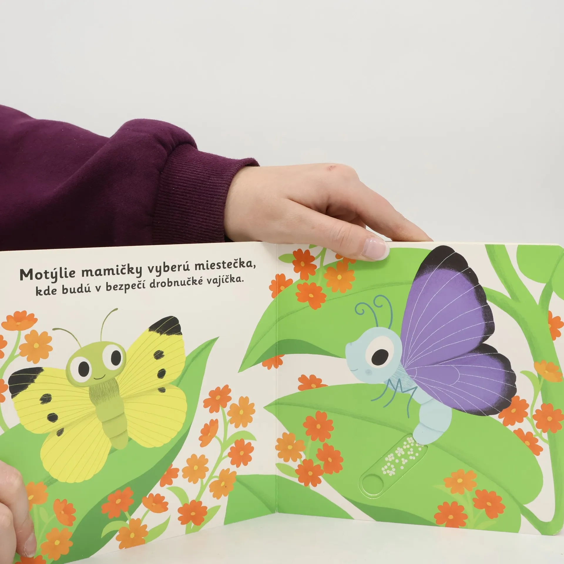 A keď sa z kukly vykľuje, húsenicou už nebude. Objavovať svet s týmto leporelom pre najmenšie deti od jedného roka je také zábavné! Pevné stránky s pohyblivými prvkami precvičia aj jemnú motoriku. Stačí len vložiť prštek do správneho otvoru, zľahka vysunúť, zatiahnuť alebo otočiť, a hneď bude váš malý objaviteľ poznať odpovede.