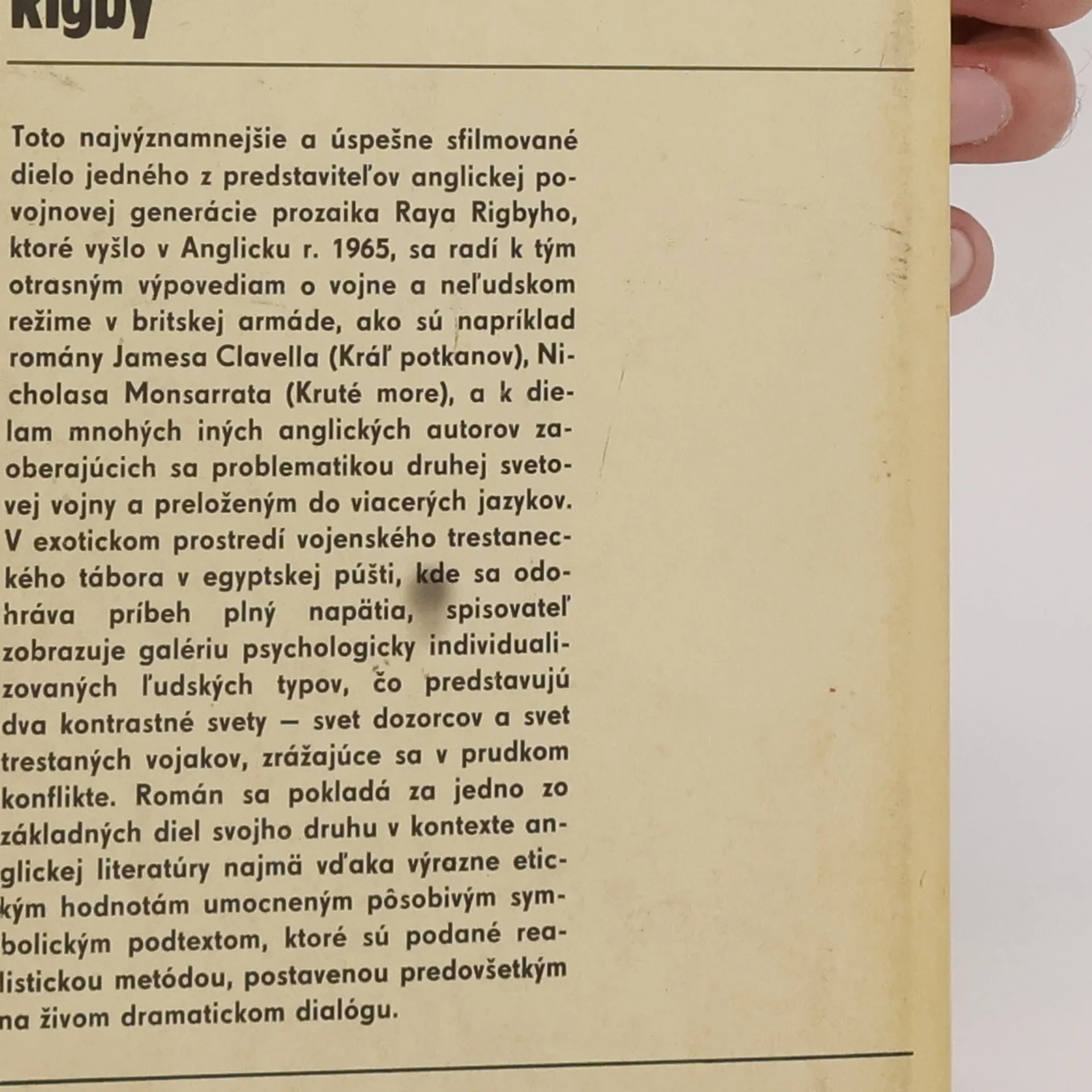 Toto najvýznamnejšie a úspešne sfilmované dielo jedného z predstaviteľov anglickej povojnovej generácie prozaika Raya Rigbyho, ktoré vyšlo v Anglicku r. 1965, sa radí k tým otrasným výpovediam o vojne a neľudskom režime v britskej armáde, ako sú napríklad romány Jamesa Clavella (Kráľ potkanov), Nicholasa Monsarrata (Kruté more), a k dielam mnohých iných anglických autorov zaoberajúcich sa problematikou druhej svetovej vojny a preloženým do viacerých jazykov. V exotickom prostredí vojenského trestaneckého tábora v egyptskej púšti, kde sa odohráva príbeh plný napätia, spisovateľ zobrazuje galériu psychologicky individualizovaných ľudských typov, čo predstavujú dva kontrastné svety — svet dozorcov a svet trestaných vojakov, zrážajúce sa v prudkom konflikte. Román sa pokladá za jedno zo základných diel svojho druhu v kontexte anglickej literatúry najmä vďaka výrazne etickým hodnotám umocneným pôsobivým symbolickým podtextom, ktoré sú podané realistickou metódou, postavenou predovšetkým na živom dramatickom dialógu.