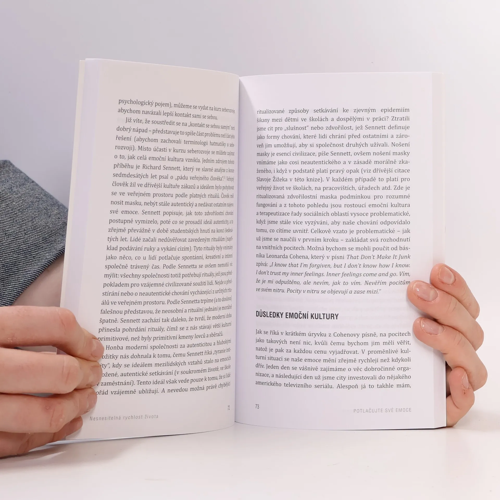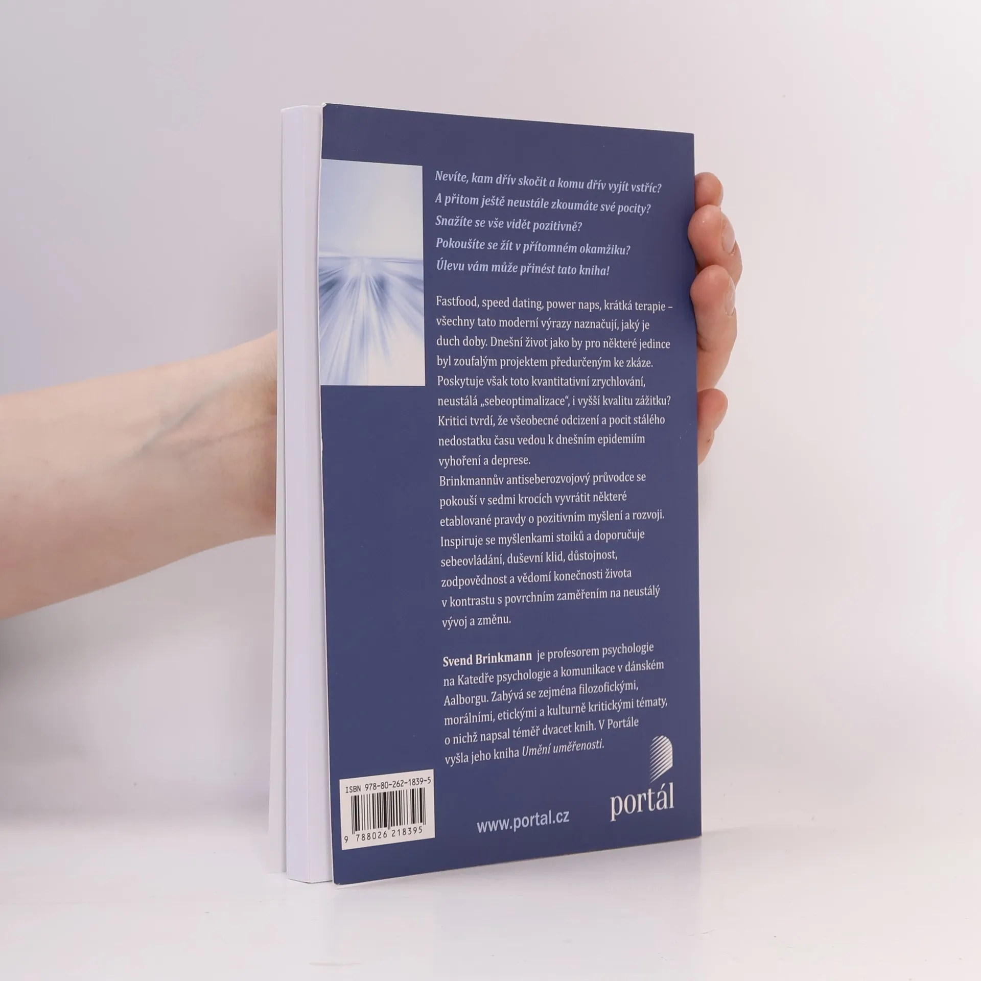 Fastfood, speed dating, power naps, krátká terapie – všechny tato moderní výrazy naznačují, jaký je duch doby. Existuje už i aplikace na zrychlování čtení. Poskytuje však toto kvantitativní zrychlování, neustálá „sebeoptimalizace“, i vyšší kvalitu zážitku? Současnost nás nutí neustále se vyrovnávat s novými trendy a změnami a přizpůsobovat se jim. Klíčovým pojmem je „tekutá modernita“, i čas je vnímán jako neustále se přelévající substance a nejhorší, co se nám může přihodit, je nehybnost. Jak z toho ven? Svend Brinkmann pojal svou nejznámější knihu jako antipříručku osobního rozvoje, v níž nabízí sedm kroků, jak se bránit „tekutosti“ života a zakořenit ve své existenci. Doporučuje například negativní vizualizaci (oproti obvyklé pozitivní), těšit se ze svých omezení (oproti bezbřehému využívání možností, ovládat a potlačovat své emoce (ne je neomezeně projevovat) či uvažovat o smrtelnosti a těšit se z daru života (oproti dnes běžné tabuizaci smrti). Řešení často přebírá z myšlenek stoických filozofů. Jeho průvodce v sedmi krocích se tak pokouší zpochybnit některé etablované pravdy o pozitivním myšlení a rozvoji. Svend Brinkmann je profesorem psychologie na Katedře psychologie a komunikace v dánském Aalborgu. Zabývá se zejména filozofickými, morálními, etickými a kulturně kritickými tématy, o nichž napsal téměř dvacet knih. V Portále vyšla jeho kniha Umění uměřenosti.