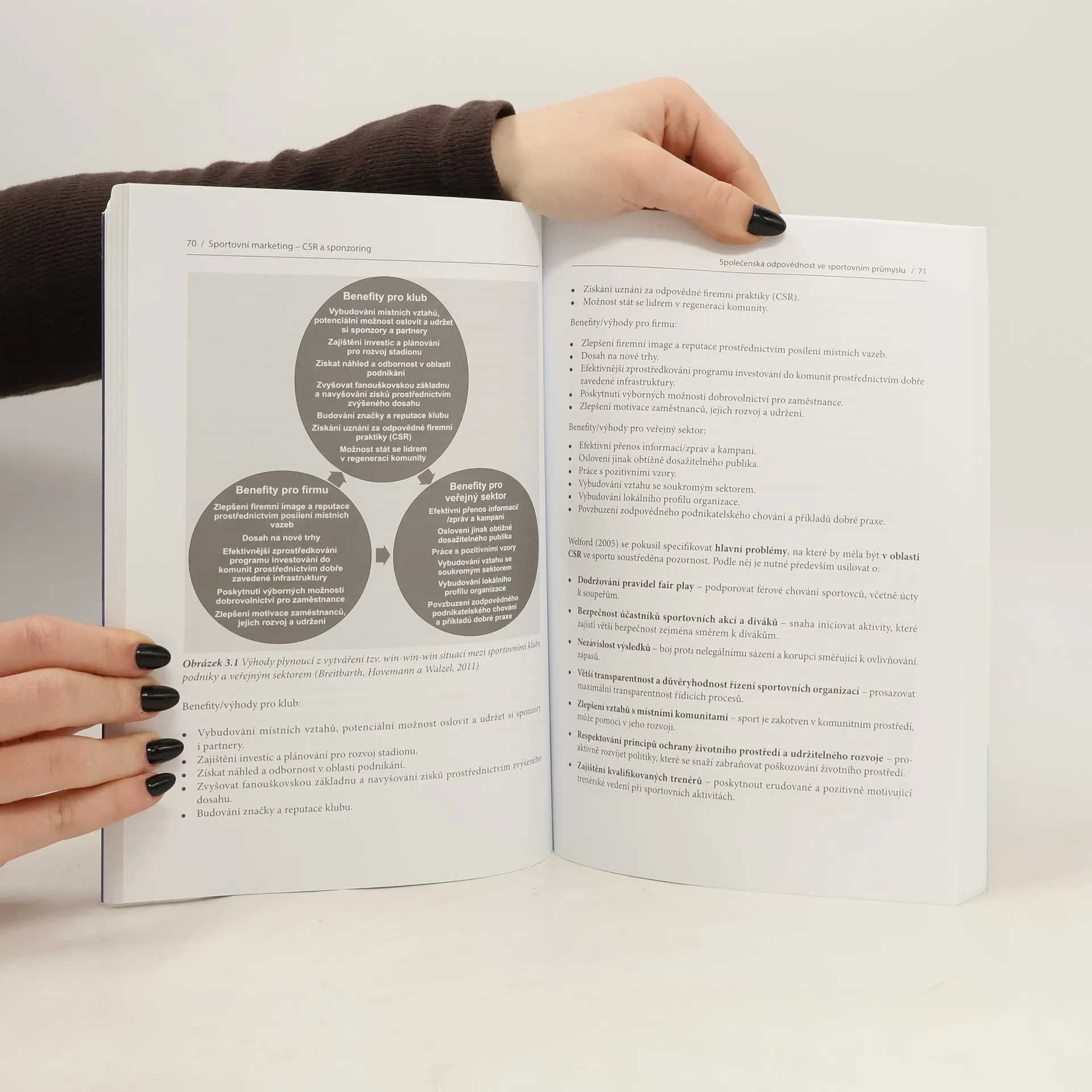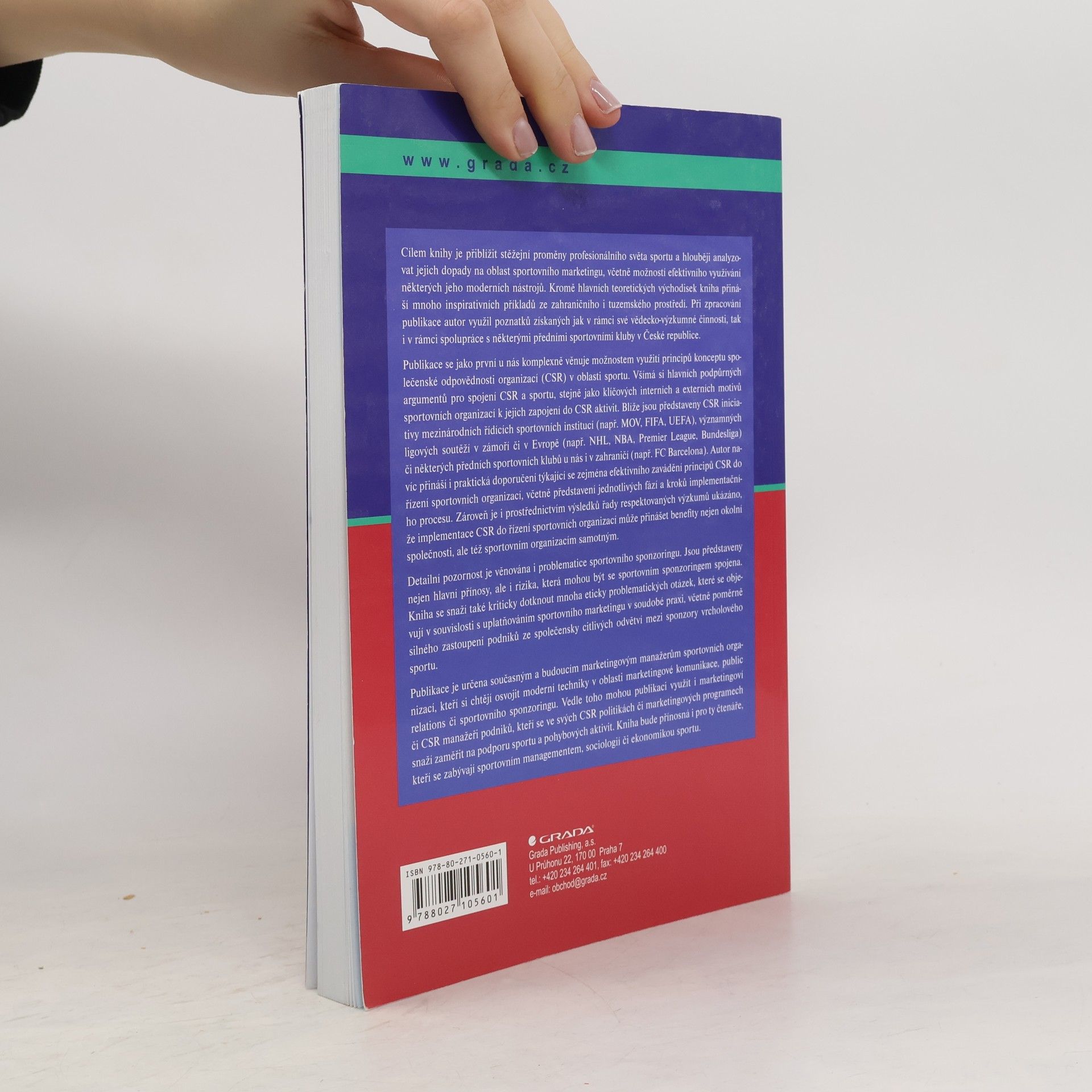 Cílem knihy je přiblížit stěžejní proměny profesionálního světa sportu a analyzovat jejich dopady na sportovní marketing, včetně efektivního využívání moderních nástrojů. Publikace přináší inspirativní příklady z domácího i zahraničního prostředí a autor čerpá z vlastního vědecko-výzkumného zázemí a spolupráce s předními sportovními kluby v České republice. Jako první v ČR se kniha komplexně věnuje využití principů společenské odpovědnosti organizací (CSR) ve sportu, zkoumá argumenty pro spojení CSR a sportu a motivy sportovních organizací k zapojení do CSR aktivit. Představuje CSR iniciativy mezinárodních sportovních institucí, významných ligových soutěží a předních sportovních klubů. Autor nabízí praktická doporučení pro efektivní zavádění CSR do řízení sportovních organizací, včetně jednotlivých fází implementačního procesu. Výsledky výzkumů ukazují, že implementace CSR může přinášet výhody nejen společnosti, ale i samotným sportovním organizacím. Publikace je určena marketingovým manažerům sportovních organizací, kteří chtějí osvojit moderní techniky marketingové komunikace, public relations a sportovního sponzoringu. Může být také užitečná pro marketingové a CSR manažery firem zaměřených na podporu sportu a pohybových aktivit, stejně jako pro čtenáře zabývající se sportovním managementem, sociologií či ekonomikou sportu.