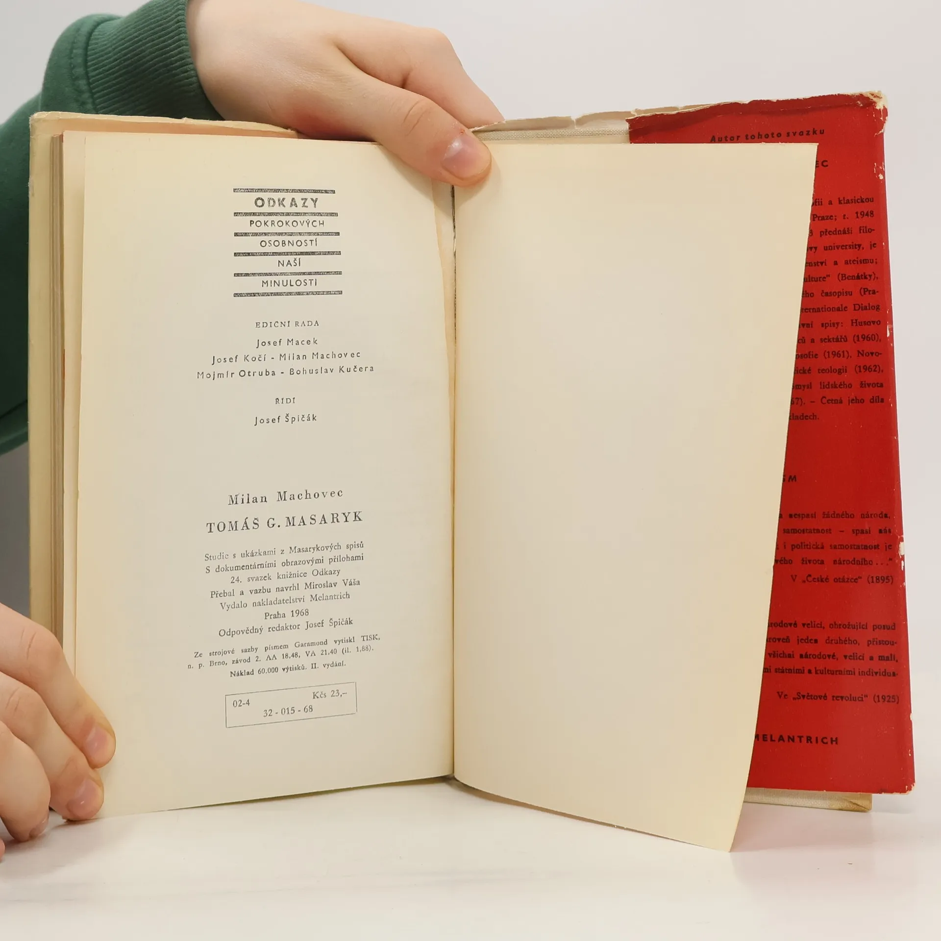 Biografie prvního československého presidenta s ukázkami z Masarykových spisů, doplněná o černobílé dokumentární fotografie. 32-008-68