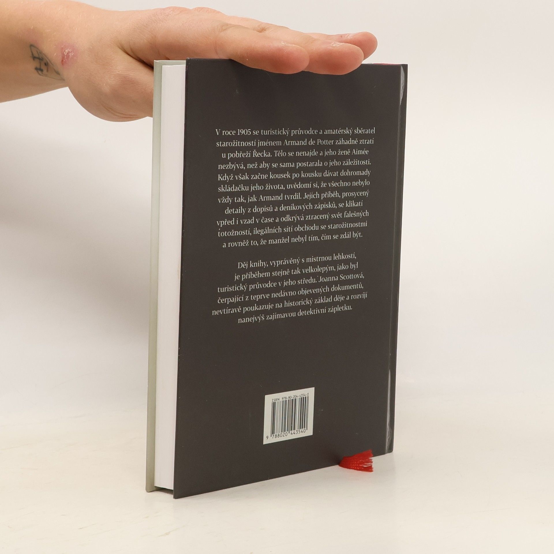 Téměř detektivní příběh z luxusní cestovní kanceláře na přelomu století V roce 1905 se turistický průvodce a amatérský sběratel starožitností jménem Armand de Potter záhadně ztratí u pobřeží Řecka. Tělo se nikdy nenajde a jeho ženě Aimée nezbývá, než aby se sama postarala o jeho záležitosti. Když však začne kousek po kousku dávat dohromady skládačku jeho života, uvědomí si, že všechno nebylo vždy tak, jak Armand tvrdil. Jejich příběh, prosycený detaily z dopisů a deníkových zápisků, se klikatí vpřed i vzad v čase a odkrývá ztracený svět falešných totožností, ilegálních sítí obchodu se starožitnostmi a rovněž to, že manžel nebyl tím, čím se zdál být. Děj knihy, vyprávěný s mistrnou lehkostí, je příběhem stejně tak velkolepým, jako byl turistický průvodce v jeho středu. Joanna Scottová, čerpající z teprve nedávno objevených dokumentů, nevtíravě poukazuje na historický základ děje a rozvíjí nanejvýš zajímavou detektivní zápletku.