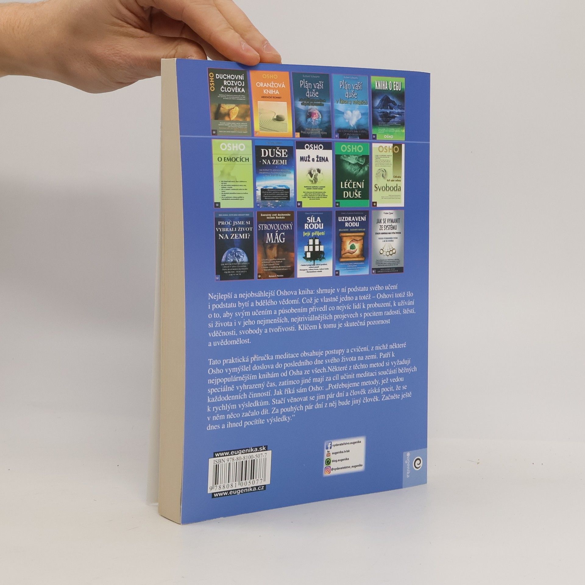 Nejlepší a nejobsáhlejší Oshova kniha shrnuje v ní podstatu svého učení i podstatu lidského bytí a bdělého vědomí. Což je vlastně jedno a totéž – Oshovi totiž šlo o to, aby svým učením a působením přivedl co nejvíc lidí k probuzení, k užívání si života i v jeho nejmenších, nejtriviálnějších projevech s pocitem radosti, štěstí, vděčnosti, svobody a tvořivosti. Klíčem k tomu je skutečná pozornost a uvědomělost. Tato praktická příručka meditace obsahuje postupy a cvičení, z nichž některé Osho vymýšlel doslova do posledního dne svého života na zemi. Patří k nejpopulárnějším knihám od Osha ze všech. Některé z těchto metod si vyžadují speciálně vyhrazený čas, zatímco jiné mají za cíl učinit meditaci součástí běžných každodenních činností. Jak říká sám Osho: „Potřebujeme metody, jež vedou k rychlým výsledkům. Stačí věnovat se jim pár dní a člověk získá pocit, že se v něm něco začalo dít. Za pouhých pár dní z něj bude jiný člověk. Začněte ještě dnes a ihned pocítíte výsledky.“