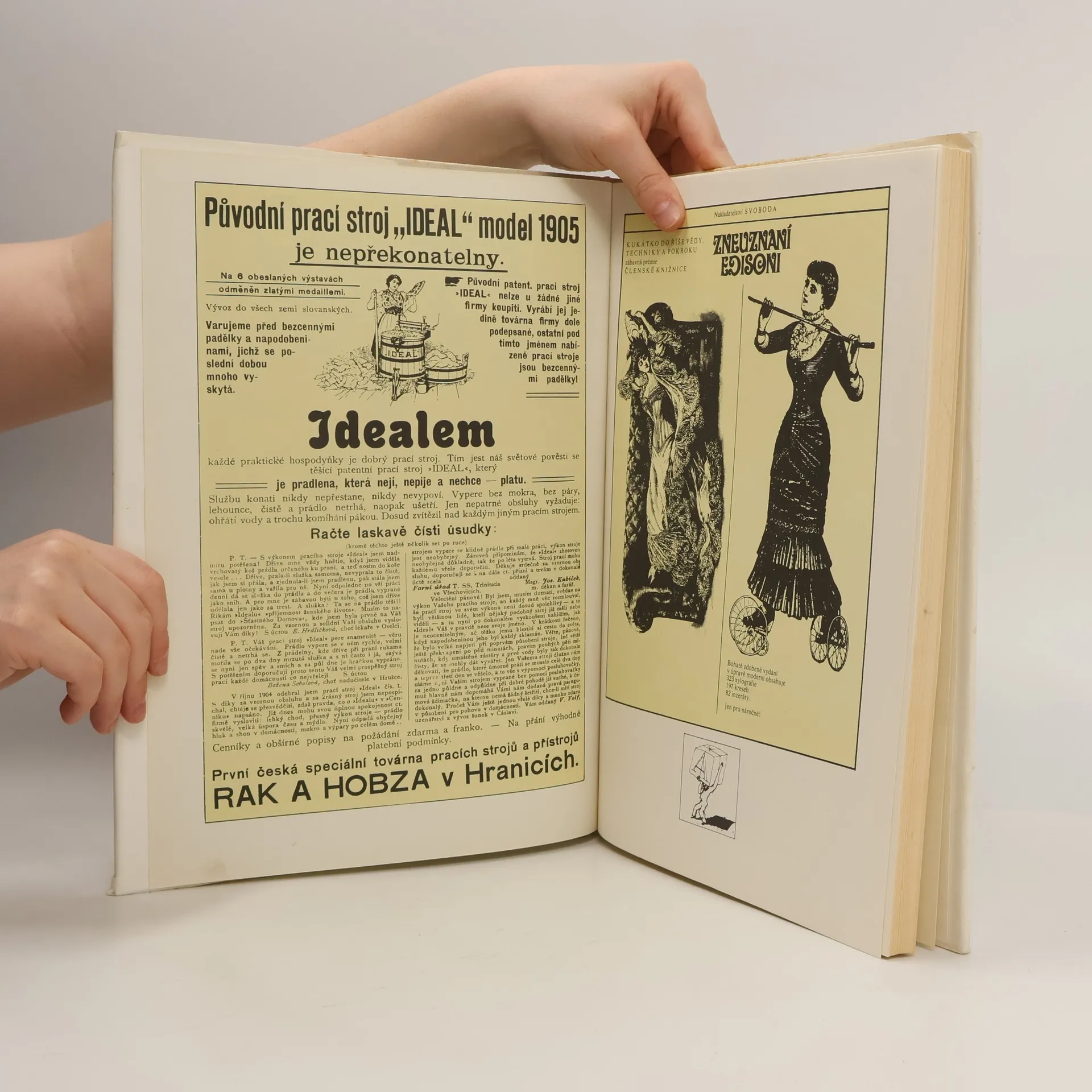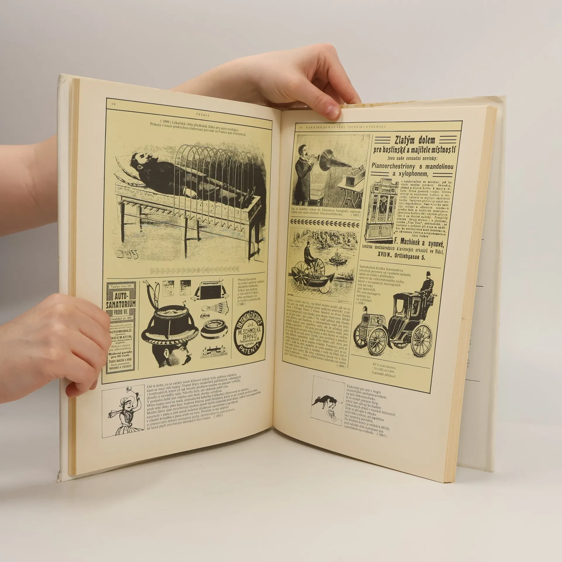 Kukátko do říše vědy, techniky a pokroku. Členská knižnice nakl. Svoboda. Zábavná členska prémie.Z časopisů, vycházejících v 2. polovině 19. století a před první světovou válkou, vybrali autoři různé inzeráty a informace o kuriiózních vynálezech s originálními obrázky. Kromě důmyslných zařízení k usnadnění práce iběžnéhoživota, zdravotnických přístrojů, nových dopravních prostředků apod. upozorňují i na objevy, které přispěly ke skutečnému pokroku.