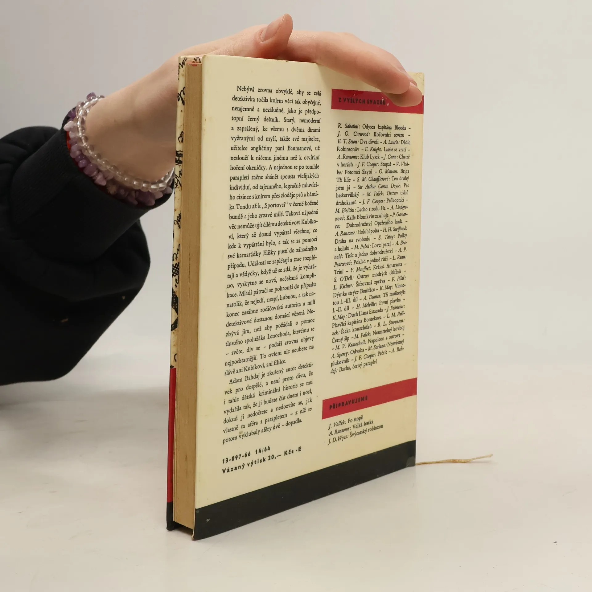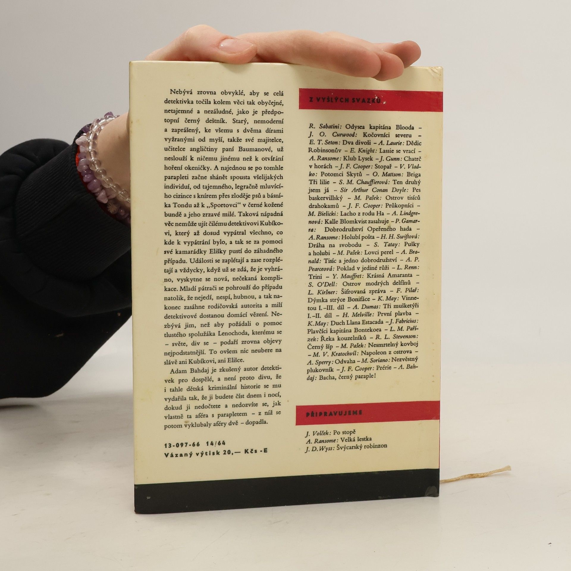 Nebývá zrovna obvyklé, aby se celá detektivka točila kolem věci tak obyčejné, netajemné a nezáludné, jako je předpotopní černý deštník. Starý, nemoderní a zaprášený, ke všemu s dvěma dírami vyžranými od myší, takže své majitelce, učitelce angličtiny paní Baumanové, už nesloužík ničemu jinému než k otvírání hoření okeničky. A najednou se po tomhle parapleti začne shánět spousta všelijakých individuí, od tajemného, legračně mluvícího cizince s knírem přes zloděje psů a básníka Tondu až k „Sportovci" v černé kožené bundě a jeho zrzavé milé. Taková nápadná věc nemůže ujít čilému detektivovi Kubíkovi, který až dosud vypátral všechno, co kde k vypátrání bylo, a tak se za pomoci své kamarádky Elišky pustí do záhadného případu. Události se zaplétají a zase rozplétají a vždycky, když už se zdá, že je vyhráno, vyskytne se nová, nečekaná komplikace. Mladí pátrači se pohrouží do případu natolik, že nejedí, nespí, hubnou, a tak nakonec zasáhne rodičovská autorita a milí detektivové dostanou domácí vězení. Nezbývá jim, než aby požádali o pomoc tlustého spolužáka Lenochoda, kterému se - světe, div se - podaří zrovna objevy nejpodstatnější. To ovšem nic neubere na slávě ani Kubíkovi, ani Elišce. 13-097-66